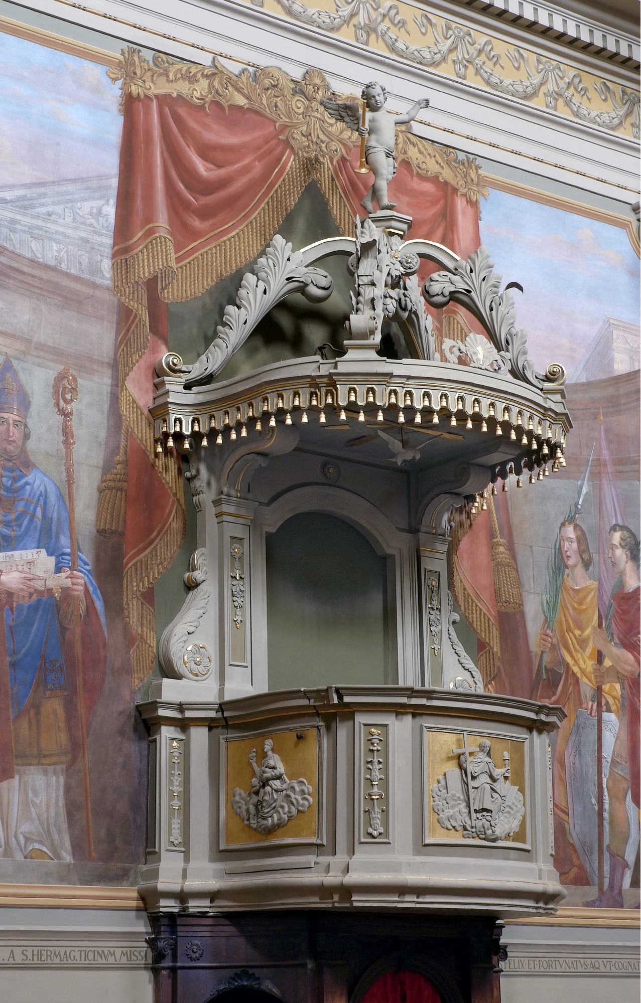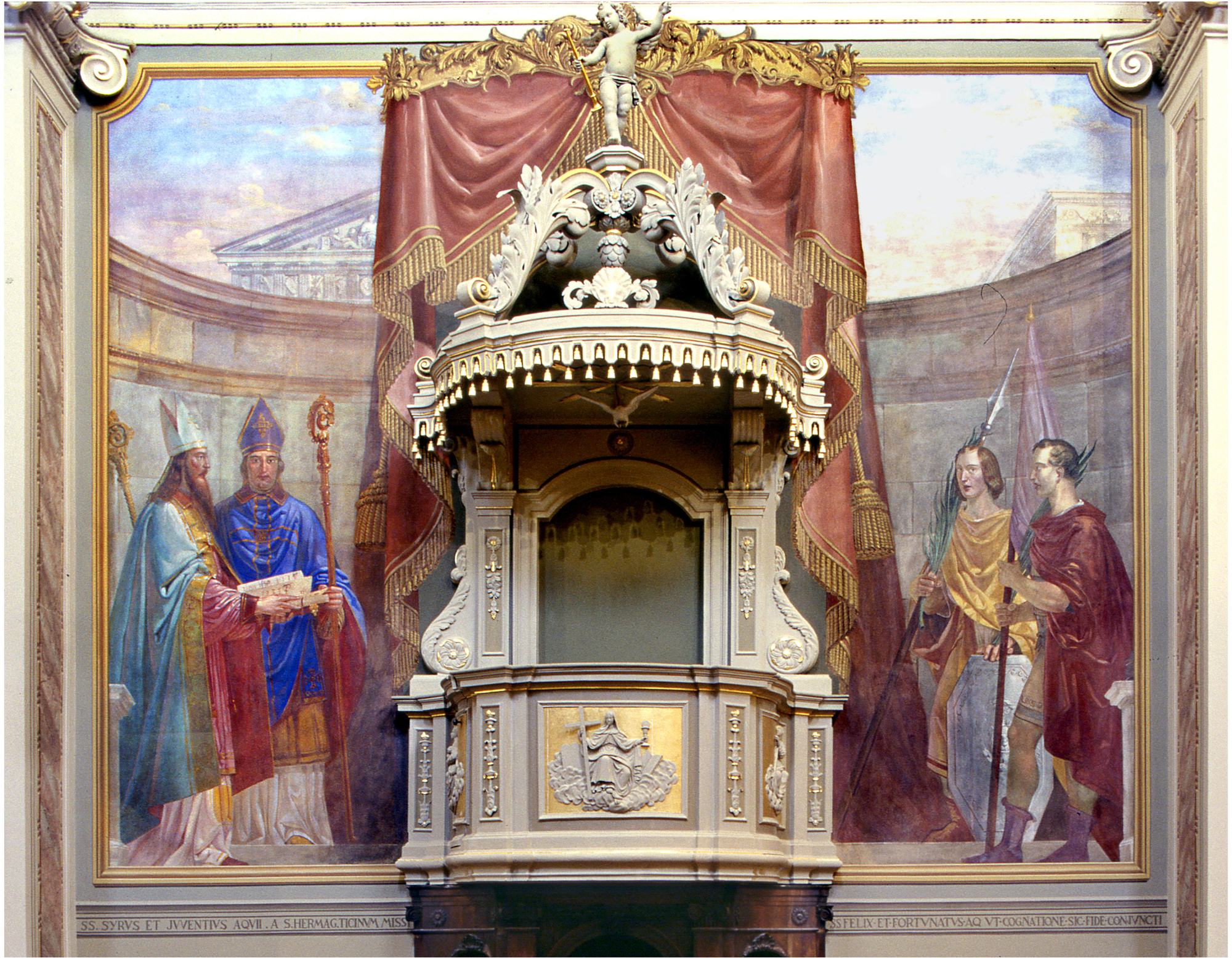Lungo la parete destra, una grande composizione ribadisce il ruolo di evangelizzazione attribuito a sant’Ermagora. La scena disposta simmetricamente ai lati del pulpito, contornato da un illusionistico drappo rosso, rappresenta i Santi Siro, Evenzio, Felice e Fortunato. I primi due, Siro ed il successore Evenzio, in abiti vescovili, secondo la tradizione furono inviati proprio da sant’Ermagora a fondare la diocesi di Pavia: da ciò la loro comparsa nel ciclo. In merito, è opportuno ricordare che l’immagine di san Siro ricorre assieme a quelle dei santi Ermagora e Fortunato negli affreschi della cripta di Aquileia (degli inizi del XII secolo). Sulla fascia sottostante corre l’iscrizione: sul lato sinistro del pulpito: SS.SYRVS ET JVVENTIUS AQVII. A S.HERMAG. TICINVM MISSI e sul destro: SS. FELIX ET FORTVNATVS AQ. VT COGNATIONE SIC FIDE CONJVNCTI.