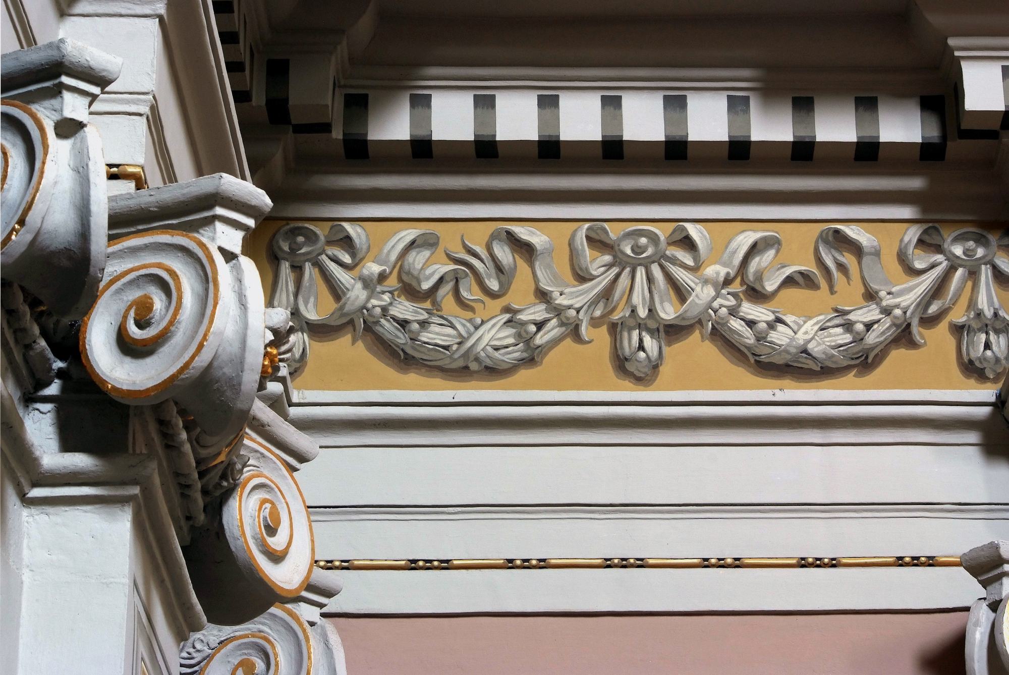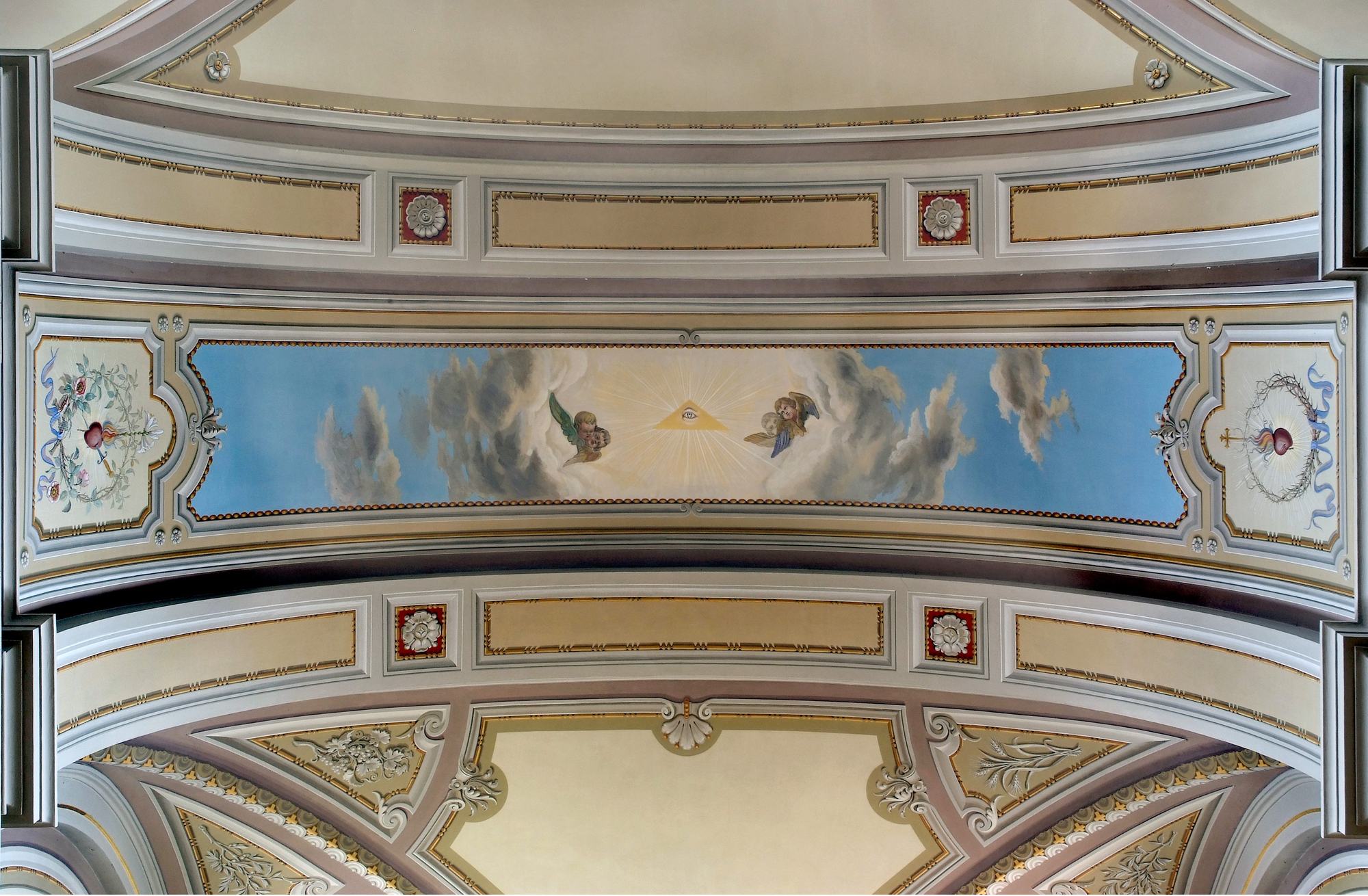 Oltre alla decorazione della volta a costoloni con spicchi ornati alla base da motivi vegetali di carattere eucaristico, gli stessi pittori gemonesi curarono il fregio con ghirlande e nastri su fondo ocra che corre lungo le pareti perimetrali a sottolineare l’andamento mosso dell’invaso e la verniciatura ad encausto con dorature del pulpito ed orchestra.