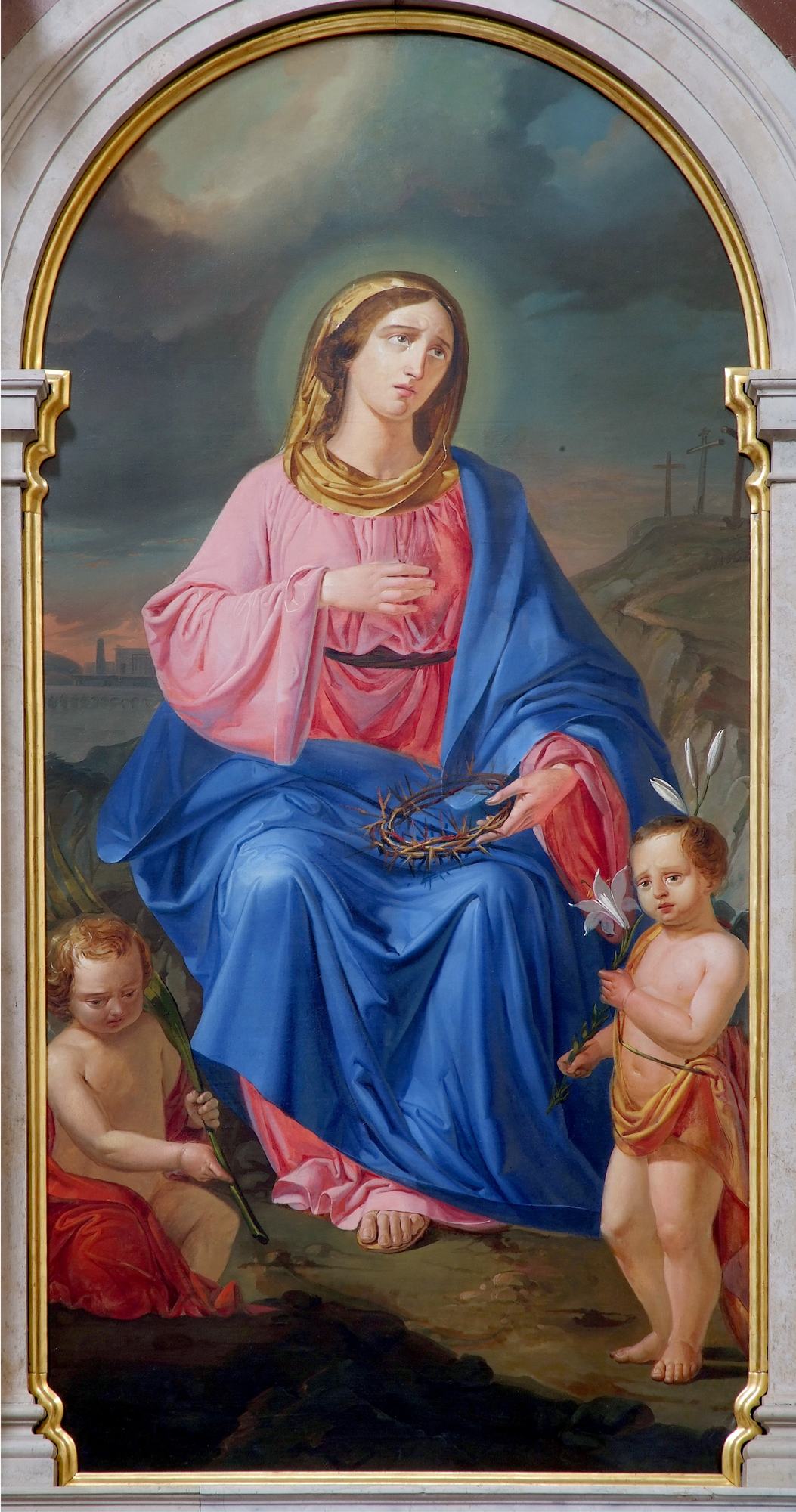 Non si discosta dalla canonica raffigurazione delle immagini devozionali e pietistiche la pala della Madonna Addolorata (secondo altare a sinistra), simbolo delle sofferenze della Chiesa e del Papato nel periodo delle Rivoluzioni. Soggetto di larga diffusione e culto per tutto l’Ottocento, l’Addolorata di Talmassons ha come riferimenti diretti i dipinti veneziani di Odorico Politi e di Lattanzio Querena ai Tolentini.