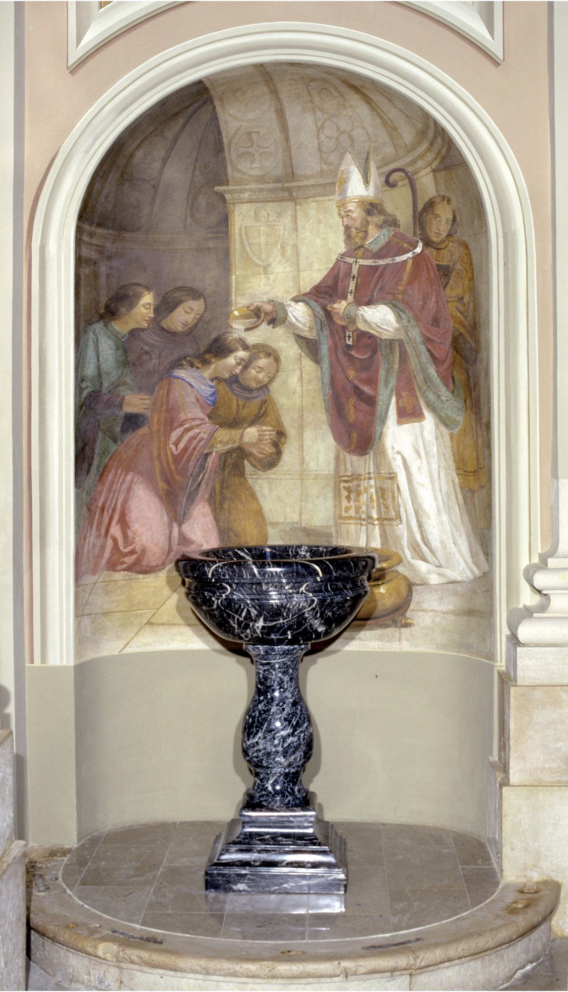 All’entrata del tempio, entro la nicchia del Battistero, un ambiente spoglio fa da sfondo alla scena del Battesimo delle Vergini “Aquileiesi”. Secondo la leggenda aquileiese le giovani Eufemia, Dorotea, Tecla ed Erasma, sarebbero state battezzate da Ermagora e, dopo il loro martirio, sepolte dallo stesso Ermagora. Le notizie della loro passio sono tuttavia piuttosto tarde, riferite nel Chronicon Patriarcharum Aquilejensium del IX secolo con ricchezza di particolari, mentre non vi è traccia di documenti liturgici anteriormente al XIII secolo. Il soggetto dell’affresco di Talmassons nelle intenzioni del committente riverisce dunque l’antica tradizione di culto che ricorda un gruppo di cittadine di Aquileia, prime vergini cristiane.