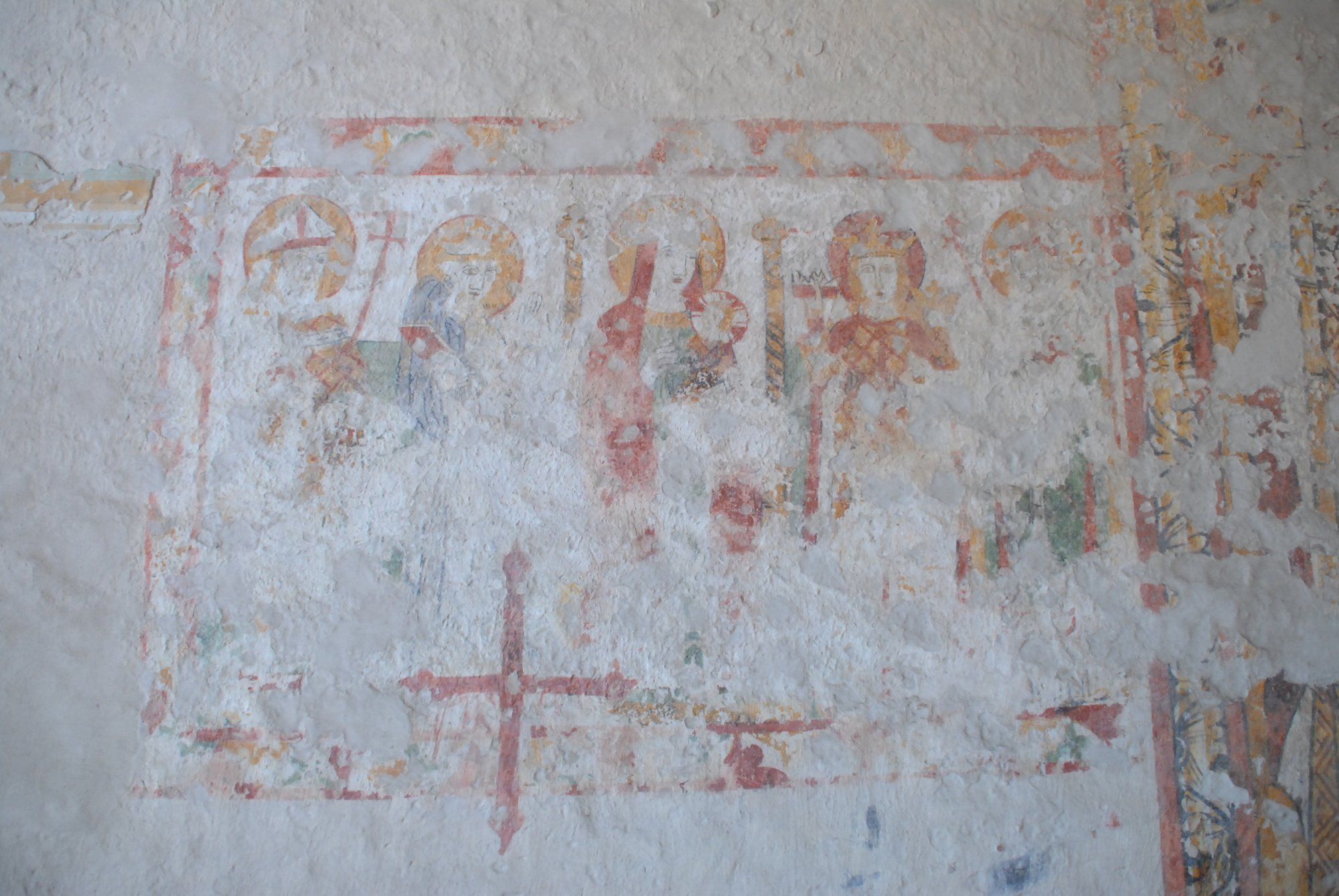La croce rossa, rozzamente dipinta sopra l’affresco, si riferisce alla consacrazione della chiesa.