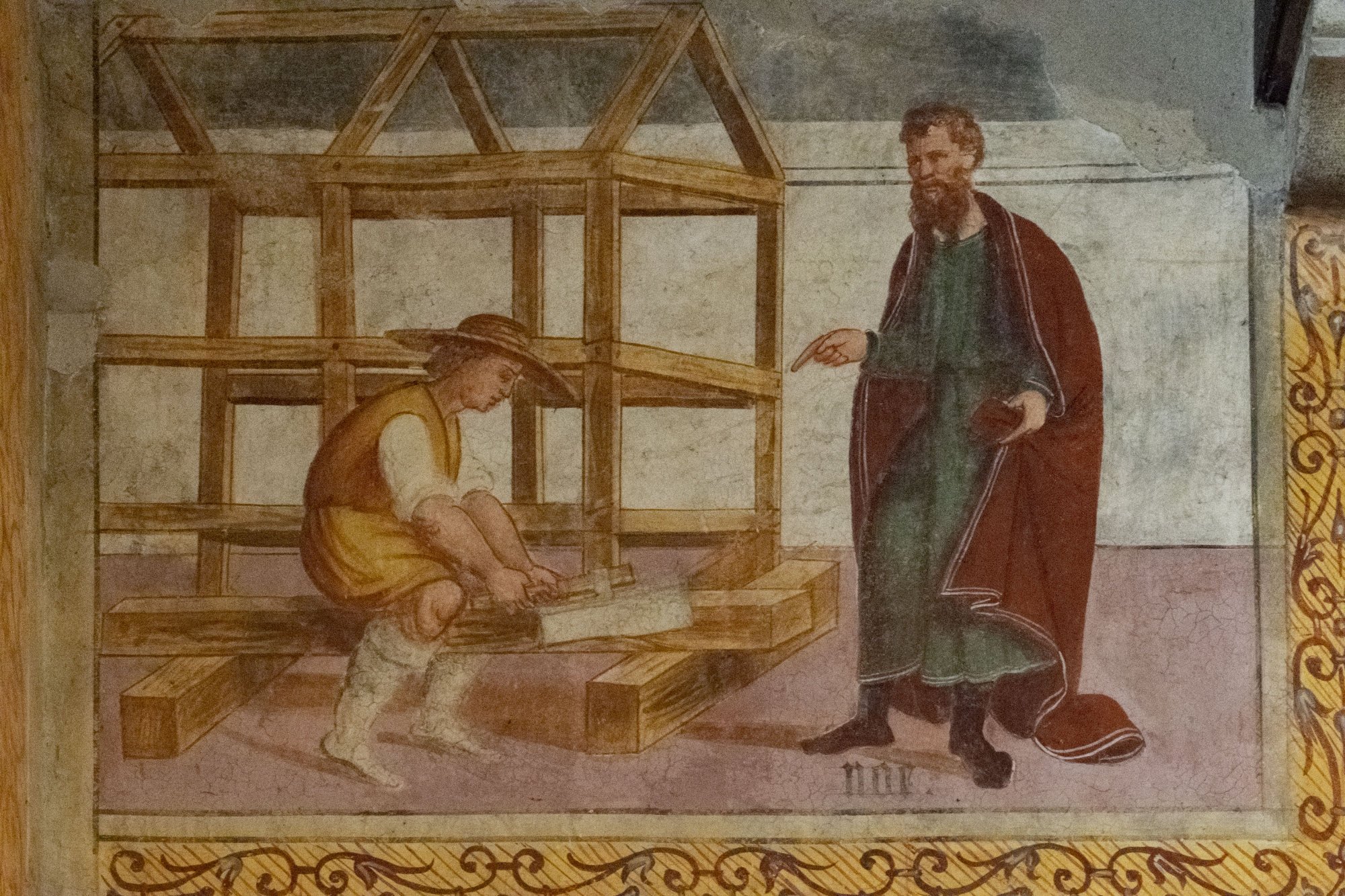 Queste due iscrizioni sono l’unico indizio che ci permette di collocare la realizzazione degli affreschi tra il 1529 e il 1531. Un ulteriore elemento, nonostante le differenze stilistiche riscontrabili nelle pareti e nel coro, che ci permette di assegnare l’intero ciclo dell’aula alla data 1531, è l’identica ripartizione dei riquadri mediante decorazioni stilizzate a candelabra con tralci vegetali.
