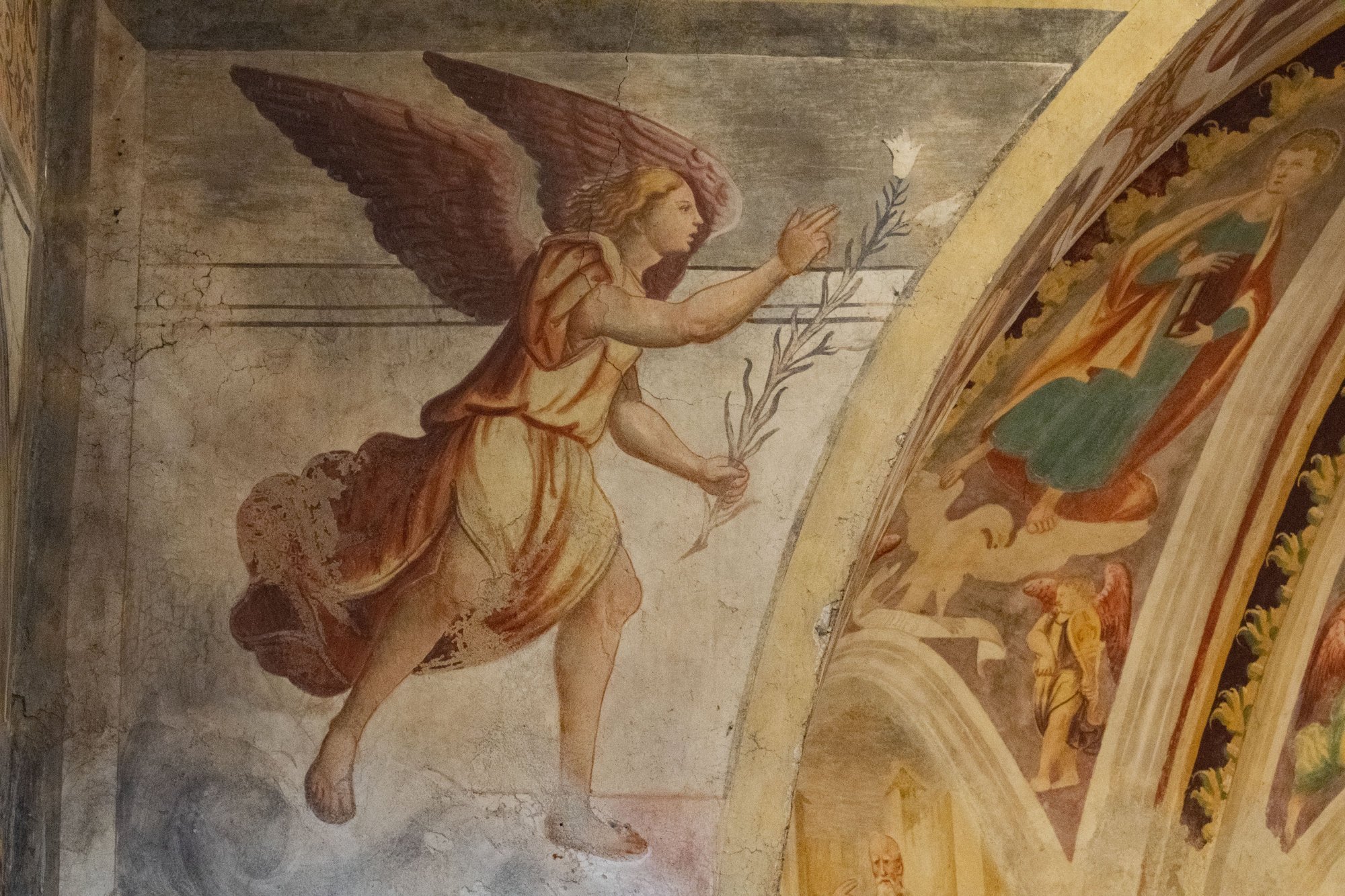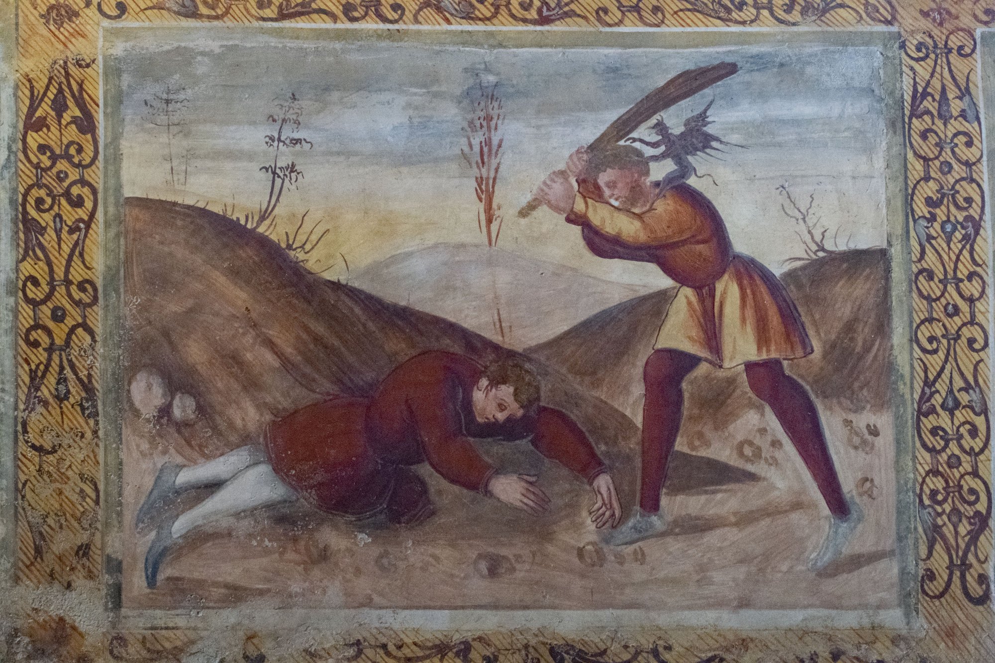 Un esempio eloquente è l’Uccisone di Abele da parte di Caino, dove le figure sono rigide, il gesto bloccato e palese, accentuato anche dal sangue che zampilla dalla testa di Abele, e la pennellata sommaria e frettolosa, probabilmente dovuta anche ai tempi rapidi di esecuzione richiesti dalla tecnica del buon fresco.