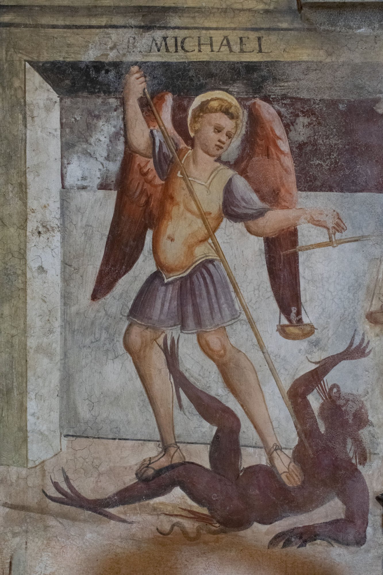 Nel registro inferiore troviamo San Giorgio e il drago e San Michele Arcangelo, quest’ultimo sorreggente una bilancia e nell’atto di trafiggere il demonio con la lancia.