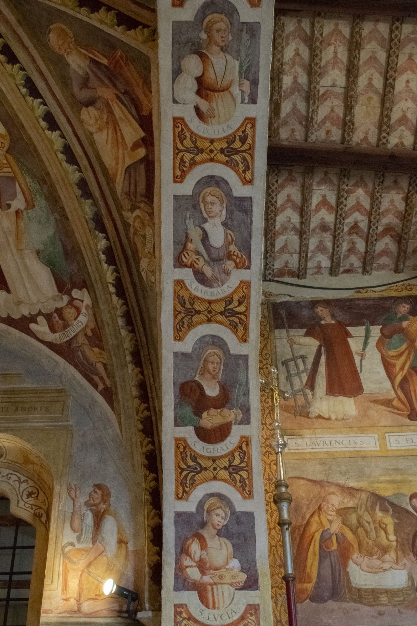 Oltre alle scene tratte dal Nuovo Testamento, vengono raffigurate, sulla parete destra verso il coro, le figure abbinate dei santi protettori, identificabili attraverso le iscrizioni sottostanti. Nel registro superiore si vedono San Lorenzo, con la graticola, e San Floriano, nell’atto di spegnere un incendio, i Santi Sebastiano e Rocco, preposti alla protezione contro le epidemie pestilenziali, e Sant’Antonio da Padova, con il giglio, e San Gottardo, rappresentato con il pastorale, la mitra e il piviale.