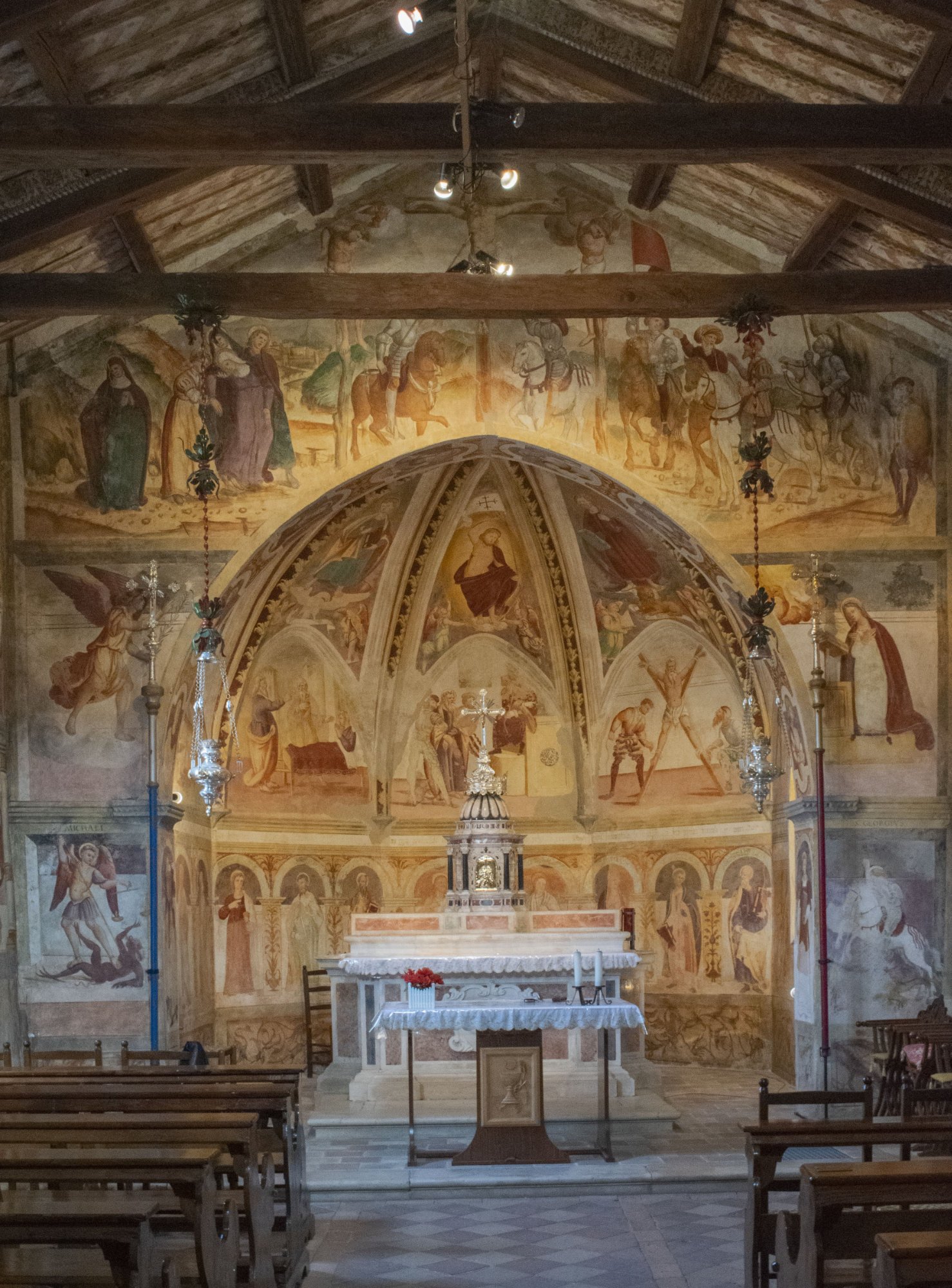 Sulle pareti dell’abside poligonale, dietro l’altare, sono allineate, al di sotto di una galleria d’archi, le figure degli Apostoli. In origine erano presenti anche delle iscrizioni sull’arco con il nome dell’apostolo; attualmente la gran parte di esse risulta sbiadita o deteriorata. Anche la teoria degli apostoli è un’iconografia diffusa nei cicli affrescati in Friuli tra il Quattro e il Cinquecento.