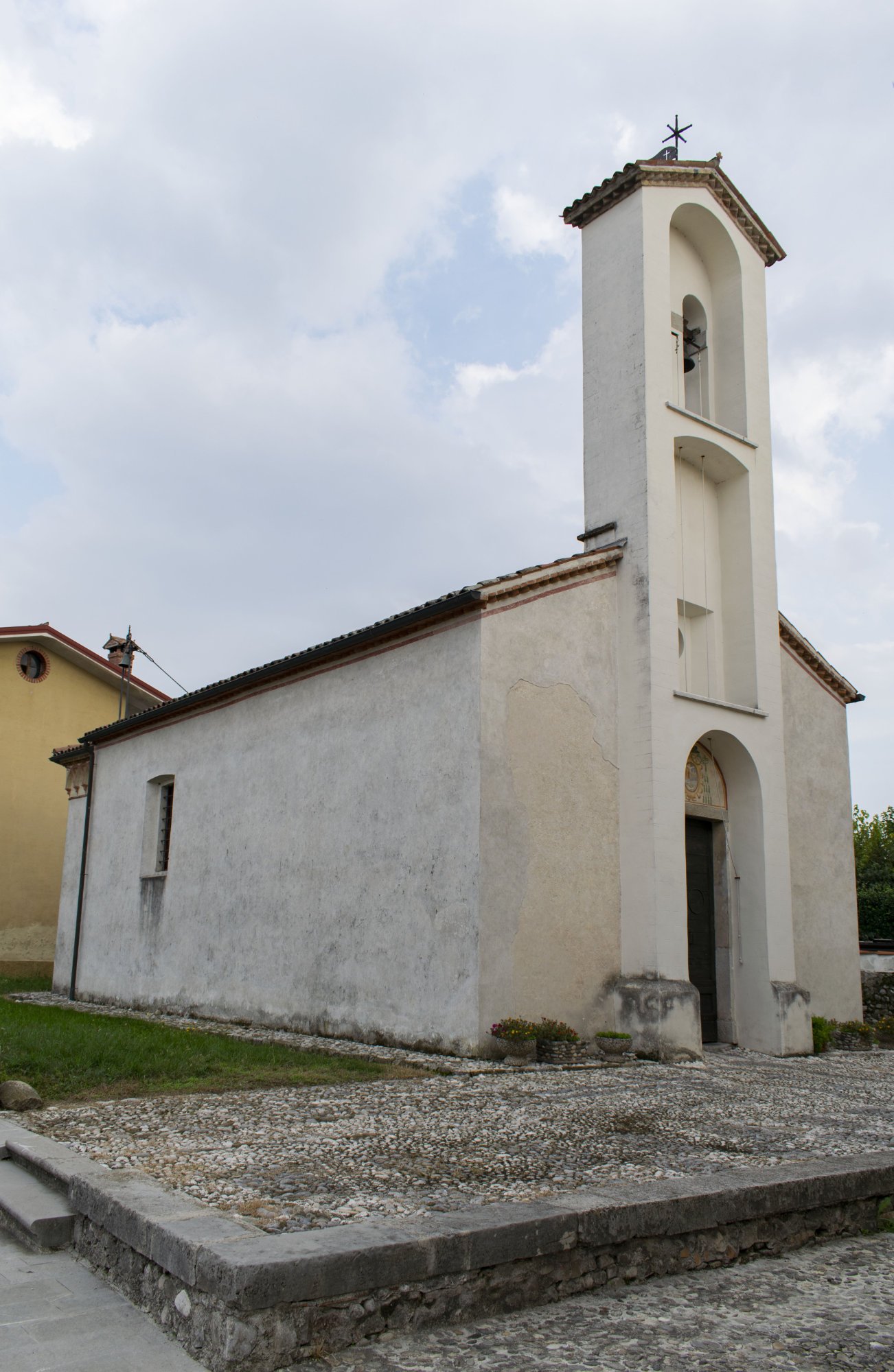 La facciata è sormontata da un campanile a vela, ricostruito nel Novecento, terminante con due archi binati e sostenuto da pilastri sporgenti, i quali incorniciano la porta d’ingresso, la cui lunetta sovrastante ospita un settecentesco stemma episcopale con il galero cardinalizio, un’impostazione ricorrente nelle chiesette friulane.