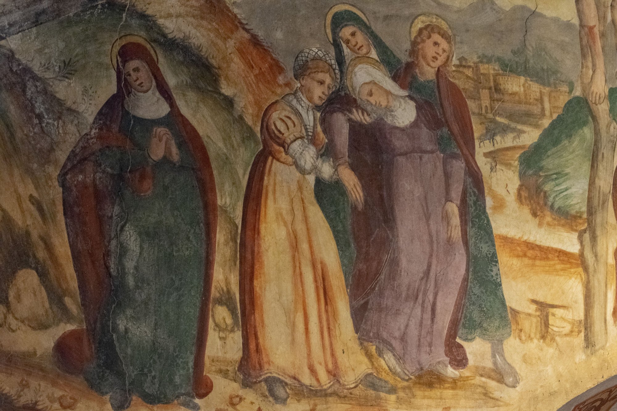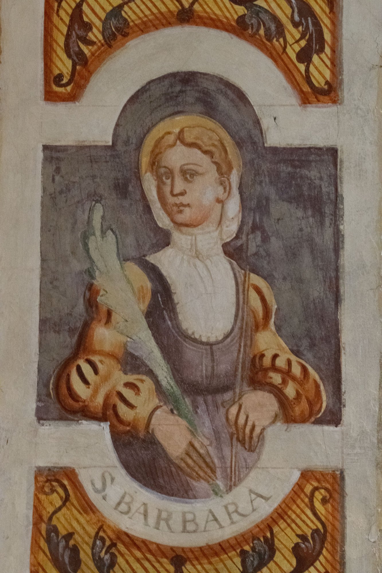 La medesima attenzione è ravvisabile in due ulteriori figure: nella Resurrezione di Lazzaro santa Maria Maddalena indossa una veste di seta cangiante con un corpetto dalla scollatura squadrata, una gonna e delle maniche rigonfie strette in tre punti da bracciali perlinati; mentre santa Barbara, nell’intradosso dell’arco trionfale, presenta una camicia bianca con colletto montante e un vestito violaceo contraddistinto da una scollatura tondeggiante e da maniche a sbuffo di colore arancione cucite al giro spalla; elementi che riconducono la realizzazione tra il primo e il secondo quarto del XVI secolo.