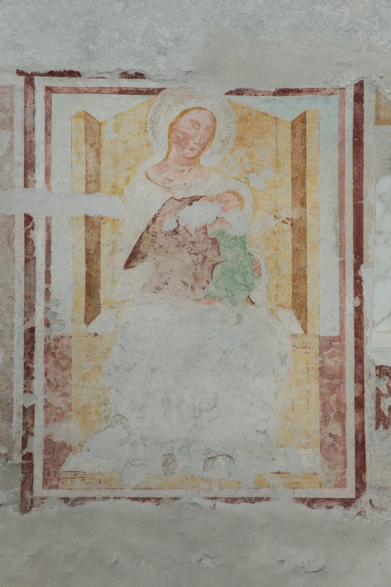 All’esterno, gli affreschi trecenteschi presentano la Madonna in trono che allatta il Bambino, San Cristoforo e un Sant’Antonio abate giusto leggibile. Poco significativi altri piccoli brani emersi a seguito del restauro (mano alzata e aureola di un santo, ricche vesti di un personaggio a mani giunte, forse un donatore) che con altri lacerti attestano di una più estesa decorazione.