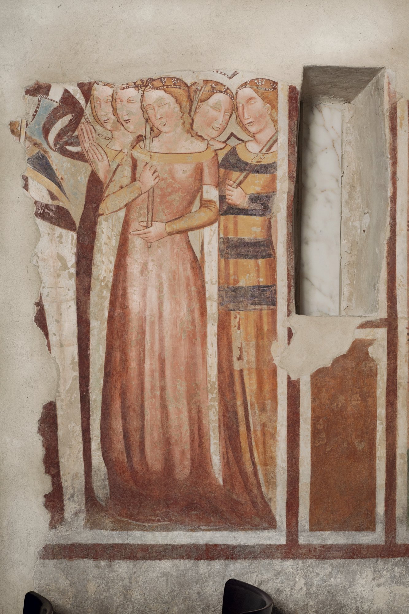 L’apertura di una porta laterale ha distrutto la figura di Orsola (di cui rimane il vessillo svolazzante, un frammento del nimbo e parte del capo) e il corteo delle vergini sulla sinistra, mentre ben leggibili sono le sante del corteo sulla destra le quali mostrano precisi riferimenti alle opere trevigiane di analogo soggetto di Tommaso da Modena.
