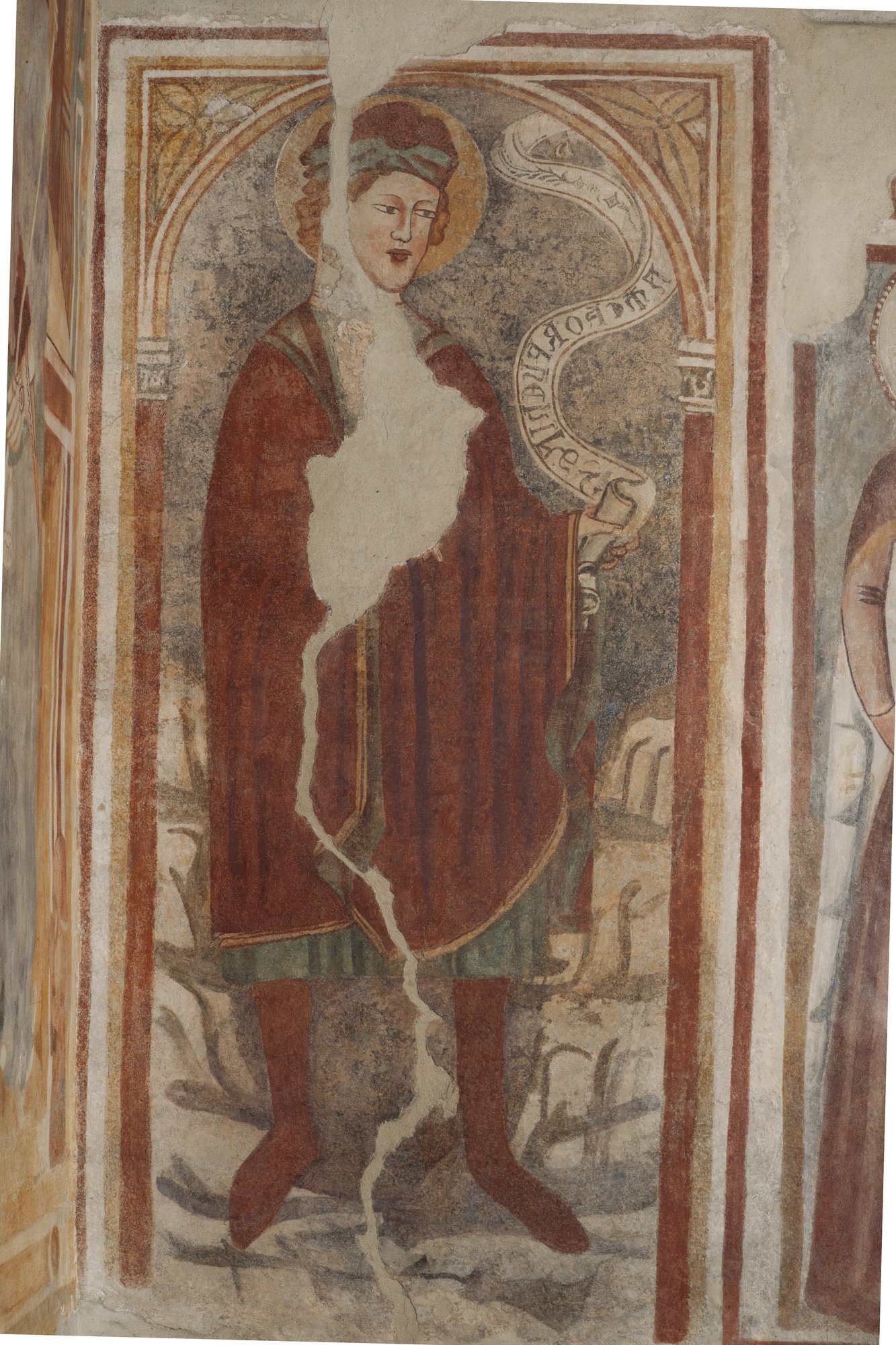 A seguire, il profeta Daniele dal volto giovanile, identificato dal copricapo e dal cartiglio (scritto alla rovescia), spesso ricorrente nel programma iconografico degli edifici di culto friulani (secoli XIV-XV) in riproposta della sua dimensione profetica (specie quando in affianco o in affronto al Battista), forse, non senza rapporto con attese millenaristiche. Nonostante le ridipinture, la figura esile ed allungata è partecipe del gusto “cortese” di inizi ‘Quattrocento.