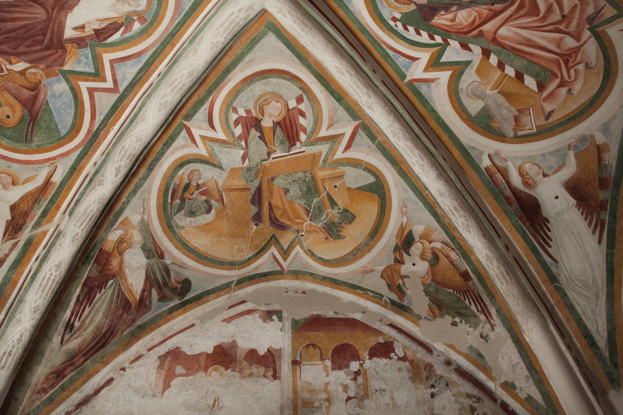 Nelle vele della volta suddivisa da costoloni decorati a motivi vegetali e losanghe, diafane figure angeliche emergenti dai peducci delle vele sorreggono formelle trilobate dai lobi espansi entro le quali sono campiti gli Evangelisti seduti in cattedra, intenti alla scrittura dei Vangeli.