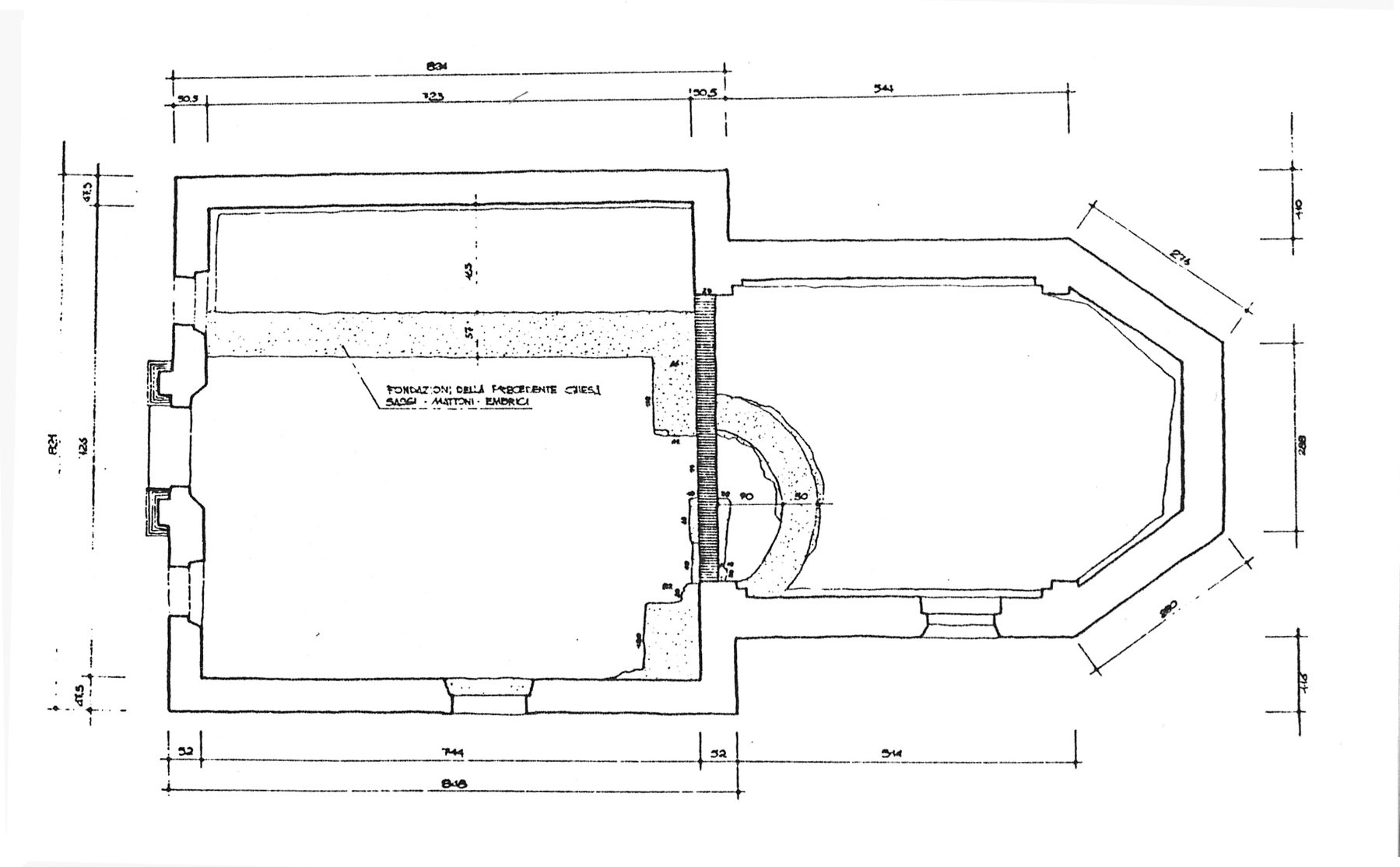 I lavori effettuati nel 1991 hanno messo in luce i resti di un edificio ad aula rettangolare di dimensioni ridotte rispetto all’attuale e dotato di abside semicircolare; situazione modificata nel corso del XIV secolo con l’ampliamento della fiancata a nord e nel secolo XV con l’aggiunta del nuovo presbiterio ad abside poligonale.