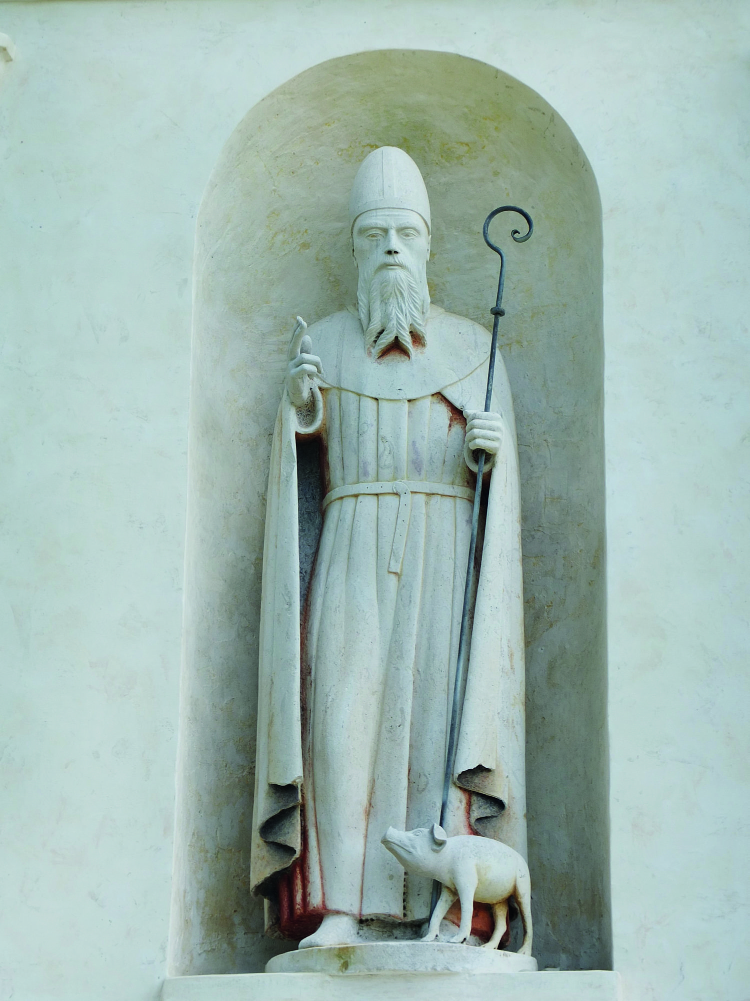 La figura dell’eremita Antonio, oggetto di grande venerazione in Oriente sin dal IV secolo d.C. è conosciuta attraverso la biografia tracciata dal vescovo di Alessandria, Atanasio suo contemporaneo e testimone diretto della vicenda terrena del santo. Spogliatosi dei beni materiali, vestito di una pelle di capra, Antonio si ritirò a vivere nel deserto in perenne lotta contro le tentazioni rappresentate dai demoni, ma non per questo estraneo alla vita della Chiesa, testimoniando durante la persecuzione di Massimino nel 311 la vicinanza ai martiri per la fede. L’ enorme diffusione del culto in Occidente avvenne in seguito al rinvenimento delle reliquie due secoli dopo la morte e al loro trasporto in Francia nel X secolo accompagnato da miracolose guarigioni da una grave epidemia di herpes zoster. La divulgazione della vicenda terrena fatta da Jacopo da Varagine nella Legenda Aurea contribuì alla fortuna del santo e della sua iconografia. L’origine del maialino che affianca Antonio risale ad un privilegio concesso all’ Ordine degli Antoniani di Vienne del 1095 in base al quale i monaci potevano allevare porci il cui lardo serviva per trattare il cosiddetto “fuoco di Sant’Antonio” come volgarmente definito l’herpes zoster. La tradizione del “porco di Sant’Antonio”, il maialino girovago allevato a spese della comunità e venduto devolvendo il ricavato ai poveri, si estese anche nelle campagne friulane dove il santo abate è invocato contro epidemie, incendi e a protezione degli animali domestici.
