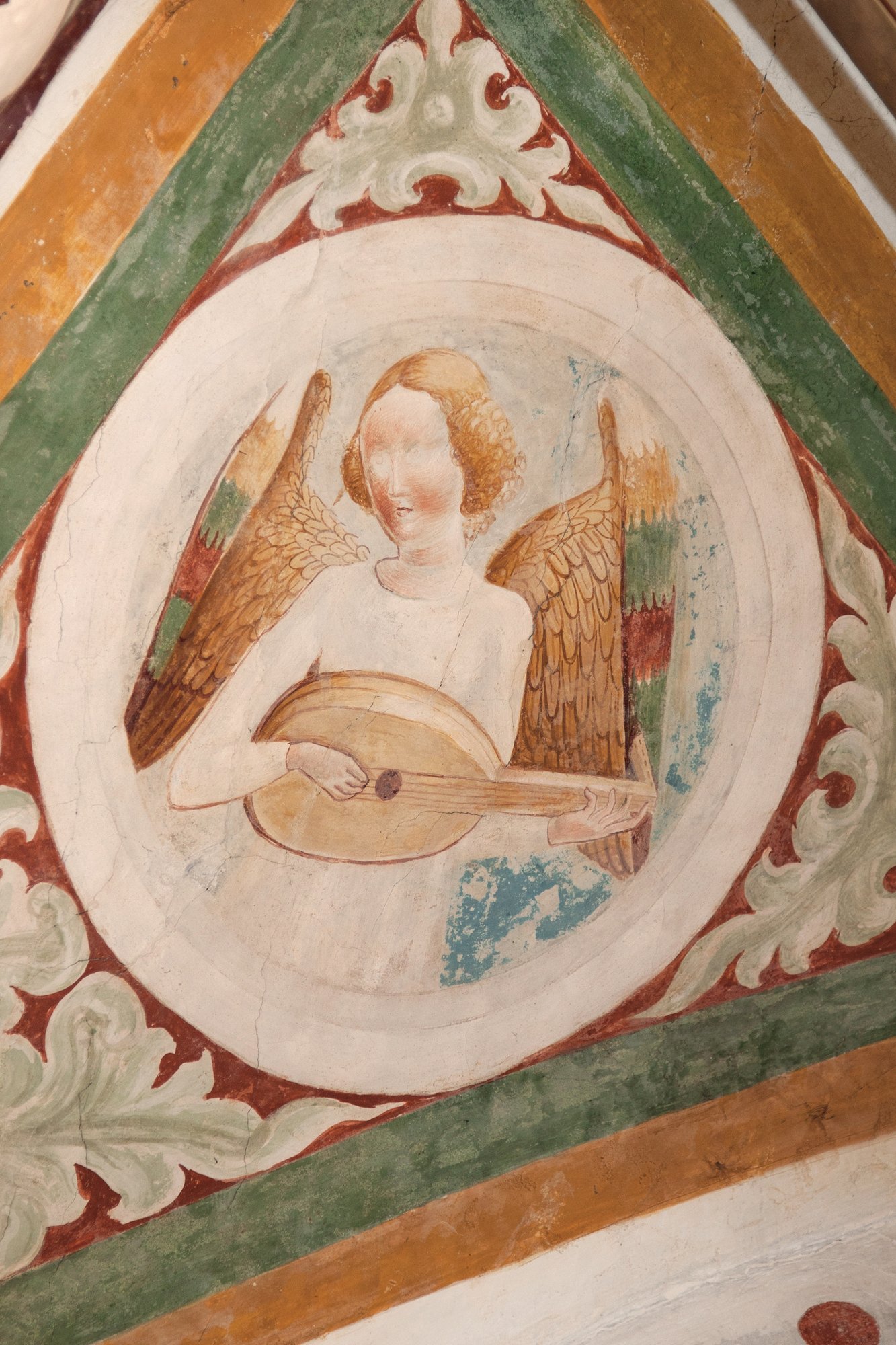 Nelle vele della cuba ai lati dell’Incoronazione, entro tondi appaiono due eleganti Angeli intenti a suonare il liuto e il violino; nel retrocoro, altri due, ritratti di profilo, dalle forme allungate e dalla lunga veste bianca, impugnano una tromba. La presenza di strumenti musicali è indice della diffusione della cultura musicale nel XV secolo presso le classi colte e nello specifico di quella sanvitese.