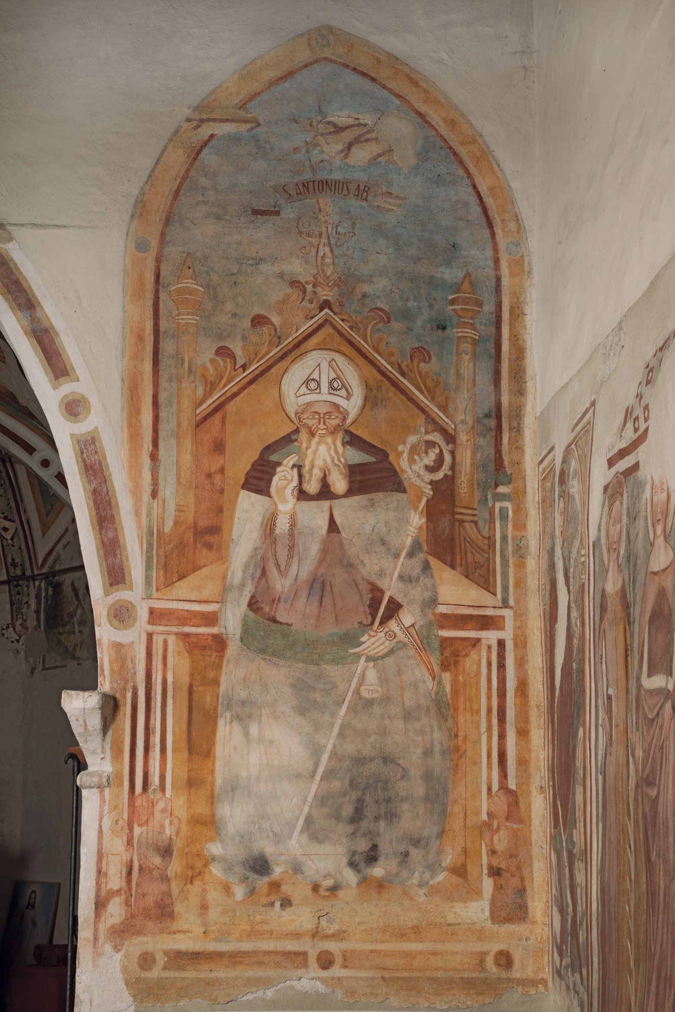 Gli affreschi della parete settentrionale del coro propongono il soggetto delle Tentazioni di sant’ Antonio nettamente percepibile nonostante le lacune. Seguono altri episodi frammentari: un Sant’Antonio benedicente in vesti vescovili affiancato da monaci in preghiera; l’interno di un edificio sacro ad archeggiature con monaci che assistono ad un evento e, sempre entro quinte architettoniche, un giovane orante in primo piano con altri personaggi sullo sfondo.