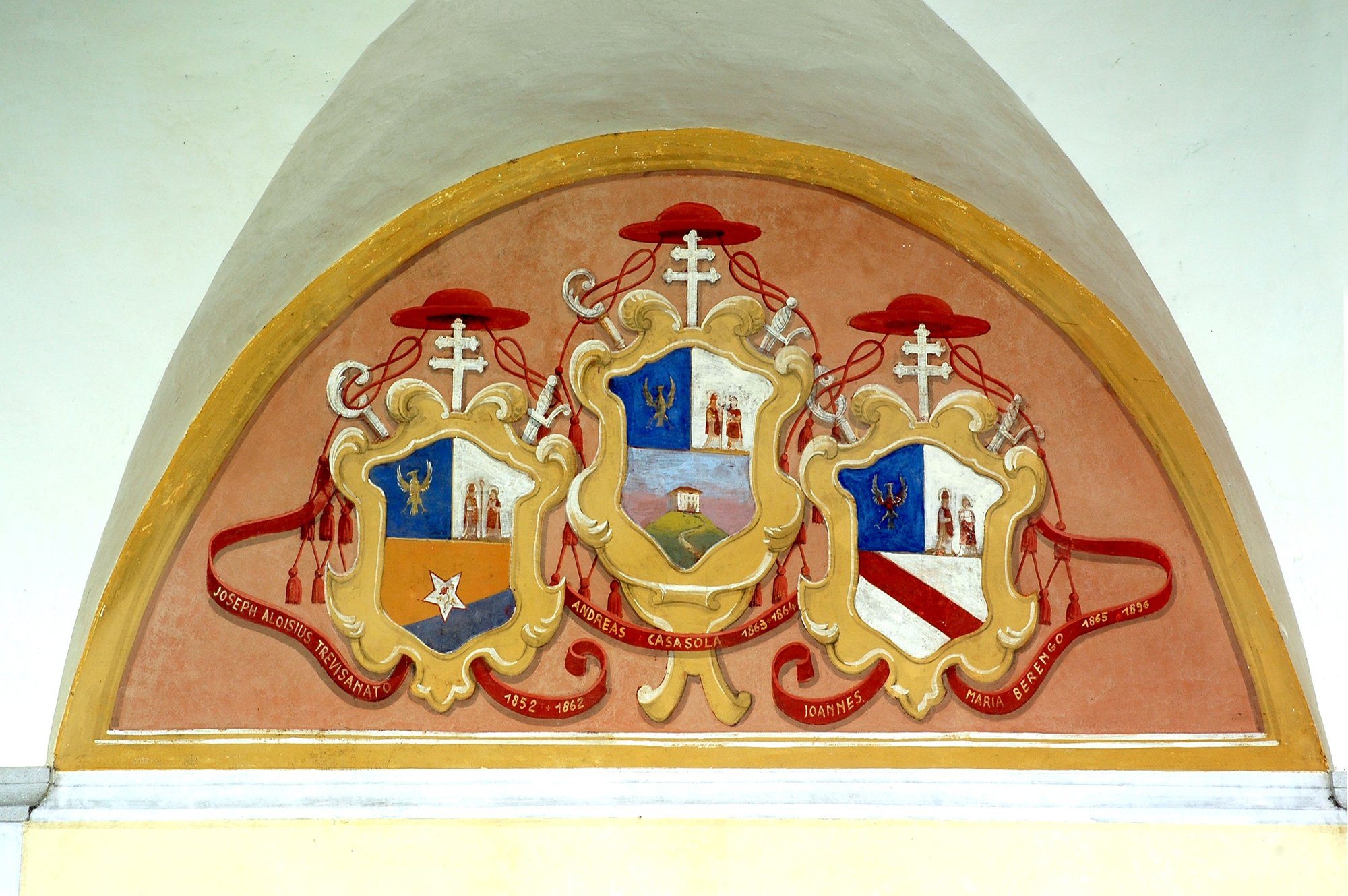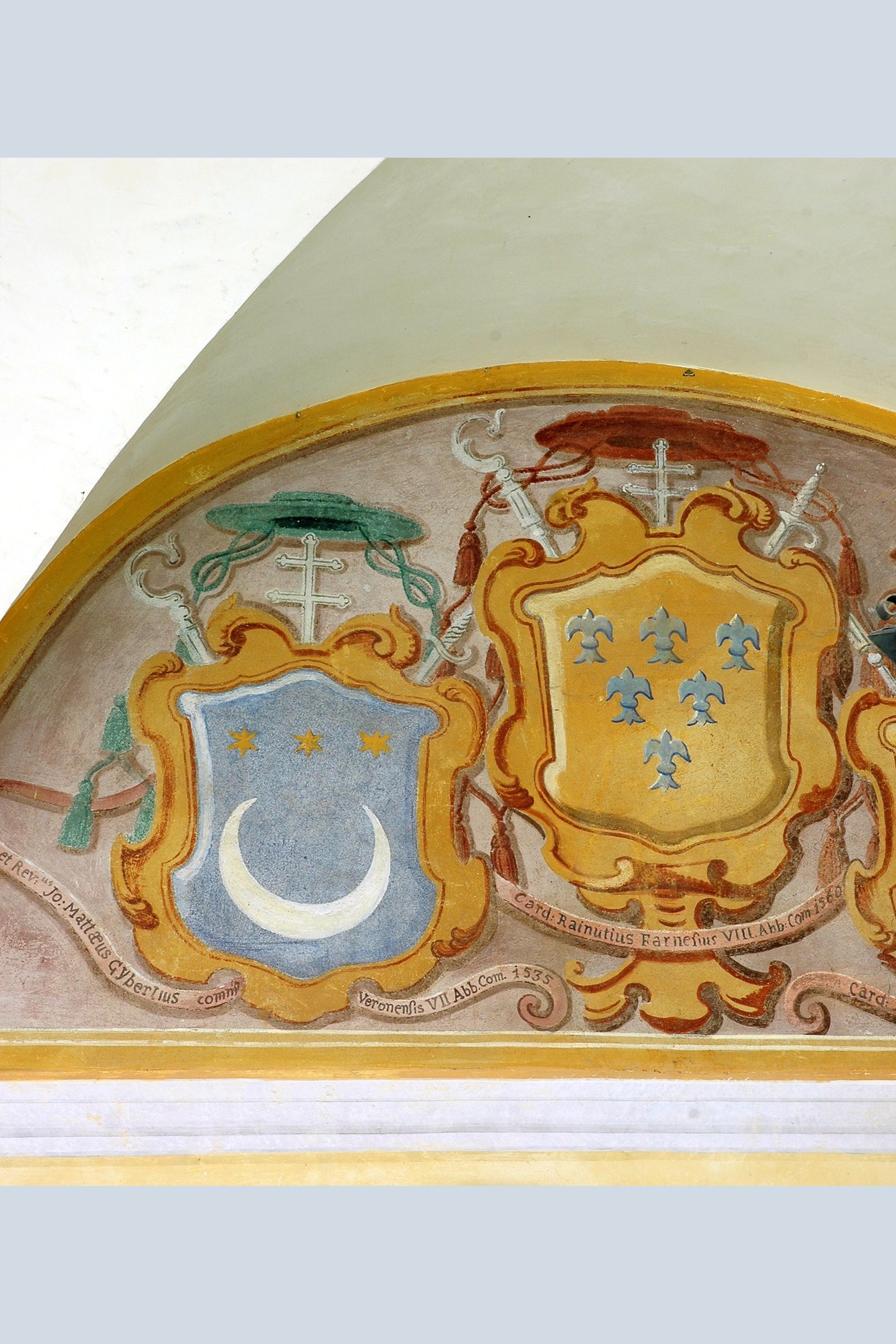 Sulle pareti del portico, nelle lunette, sono affrescati gli stemmi degli abati commendatari che si sono susseguiti nel corso dei secoli. I più antichi risalgono al 1768, mentre i più recenti al 1928. Gli ultimi furono eseguiti alla morte dell’arcivescovo di Udine e marchese di Rosazzo Giuseppe Nogara di Bellano dal 1928 al 1956, sul modello di quelli precedenti. Probabilmente in quell’occasione anche gli altri furono ridipinti.