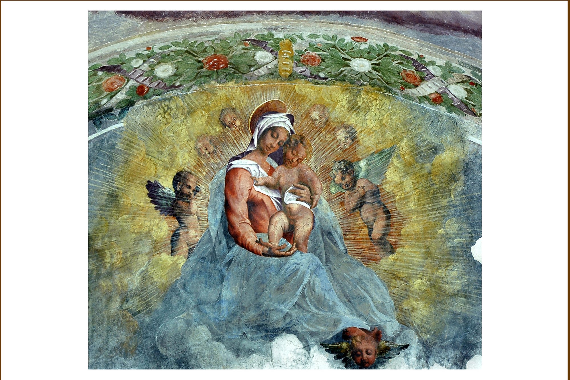 Nell’arco trionfale, in tondo, è visibile una Madonna con Bambino e santi.