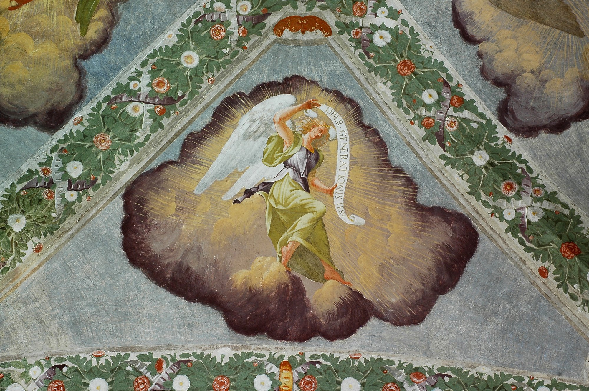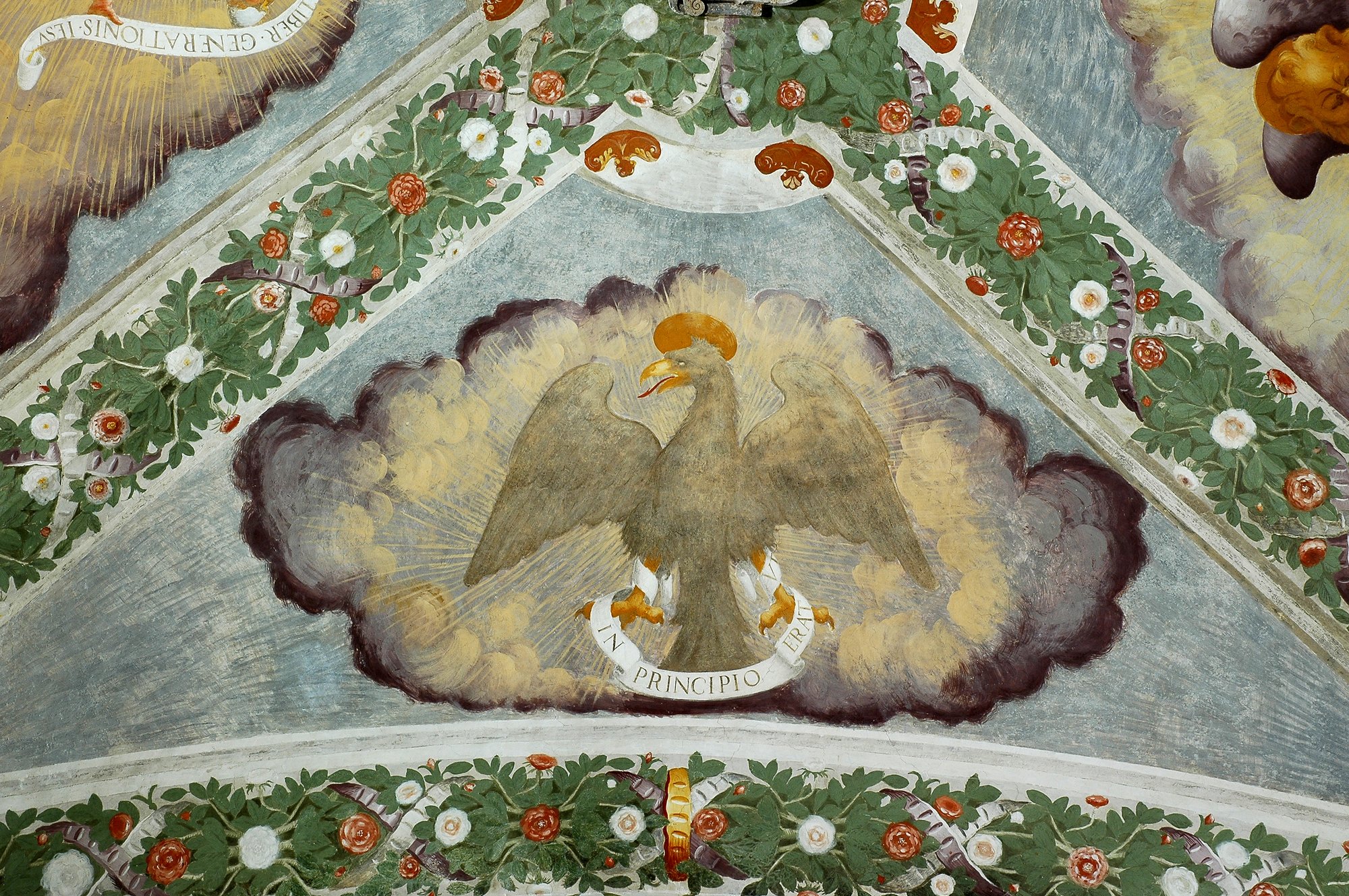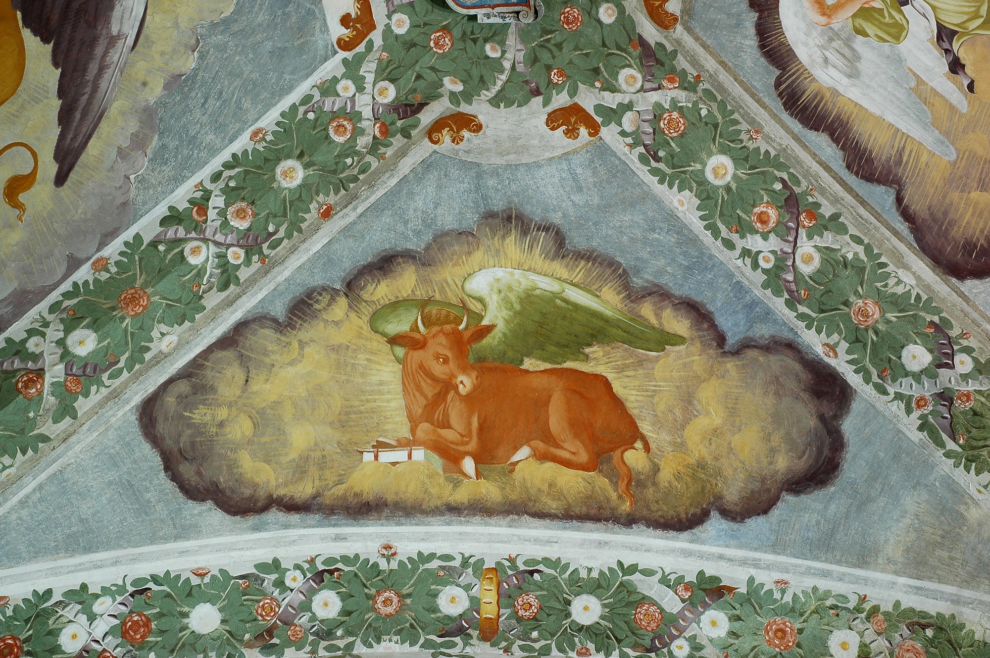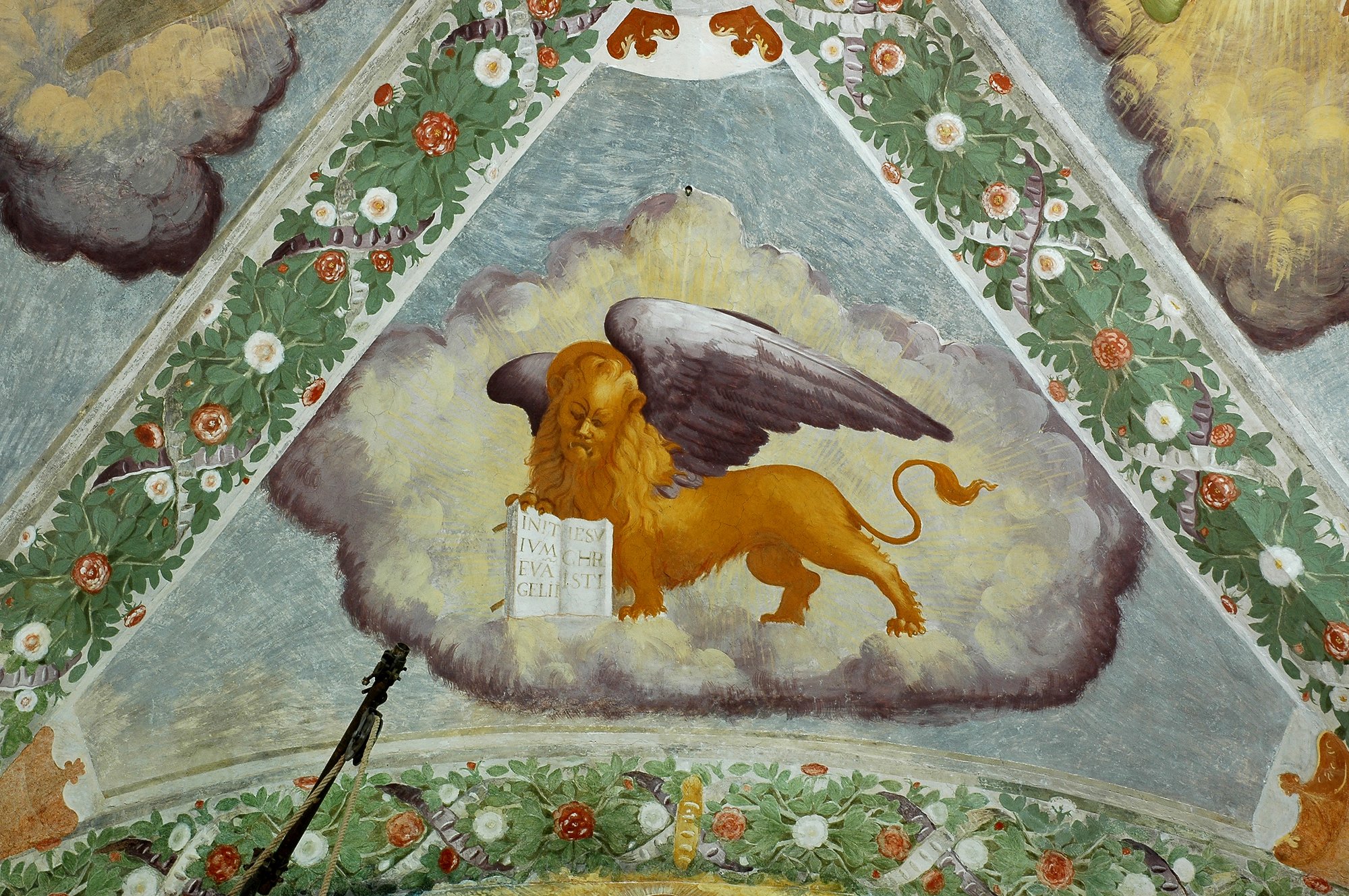 Sulla vele della crociera del presbiterio sono affrescati i simboli dei quattro Evangelisti: l’angelo per Matteo, il leone per Marco, il bue per Luca e l’aquila per Giovanni, ciascuno dentro una nuvola. A dividere i simboli, lungo i costoloni della volta, sono dipinti festoni con foglie e fiori, probabilmente delle rose rosse e bianche, forse un richiamo alla rosa alba che spesso è impiegata come simbolo di purezza.