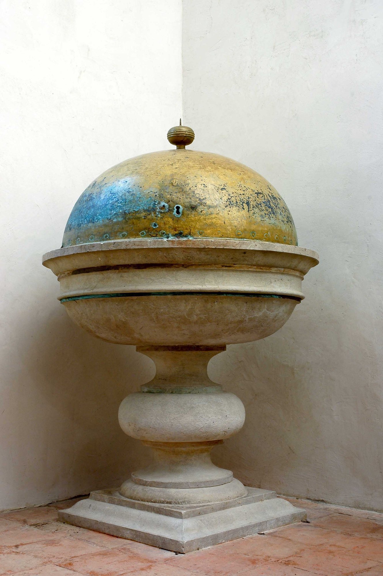 All’ingresso è posta l’acquasantiera in pietra grigia, della seconda metà del XV secolo, al tempo della commenda di Marco Barbo. Gli elementi stilistici che la caratterizzano sono il basamento quadrangolare, la base circolare con doppio bordo, il nodo a cilindro presente nel fusto che le conferisce una certa pesantezza.