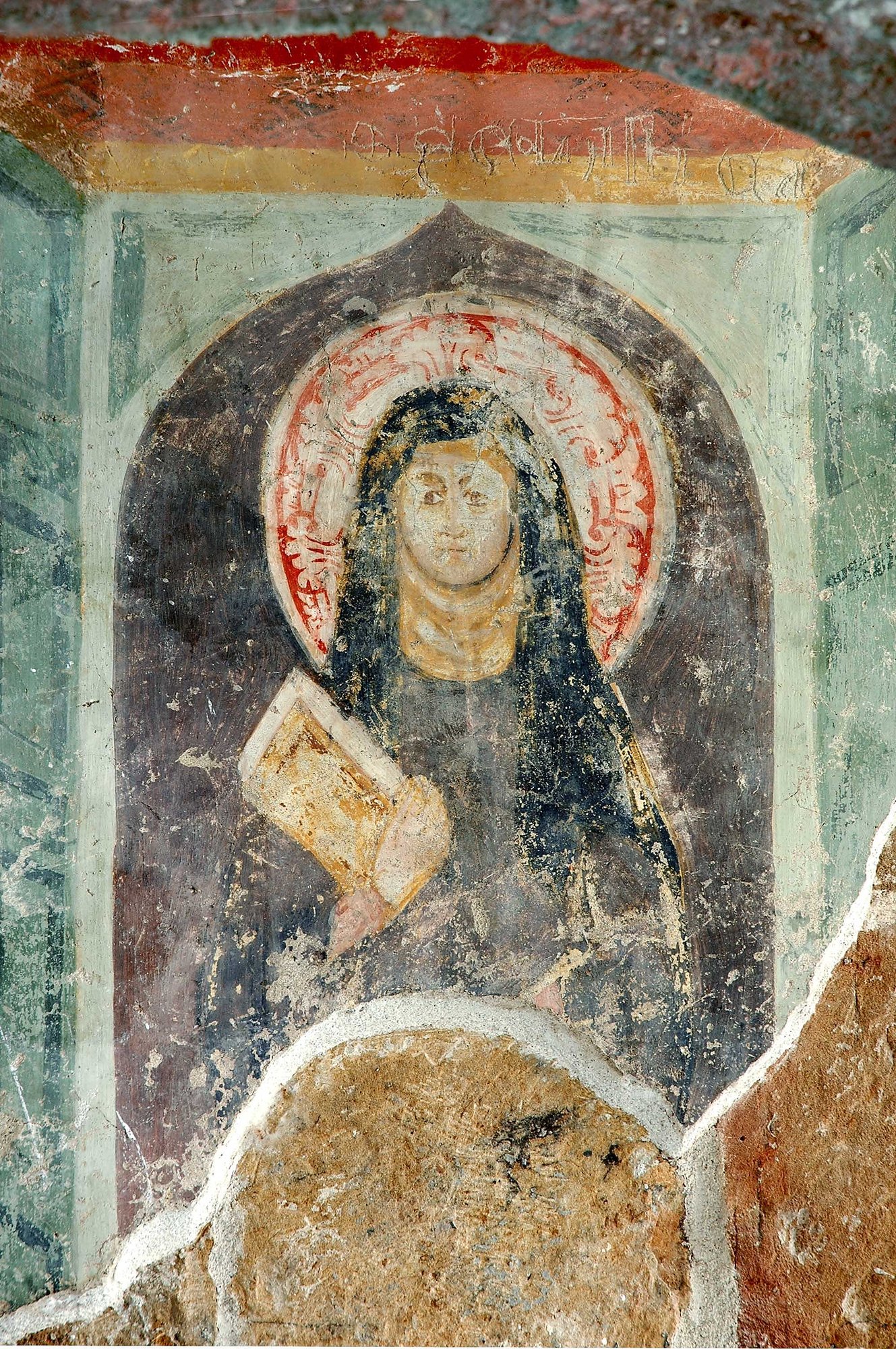 Di notevole importanza sono le bifore portate allo scoperto con i lavori di restauro dopo il terremoto del 1976. Sono visibili dal chiostro e una contiene gli affreschi raffiguranti le sante Scolastica e Caterina d’Alessandria, chiaro riferimento al mondo benedettino: l’origine potrebbe quindi risalire ai secoli XII-XIII.