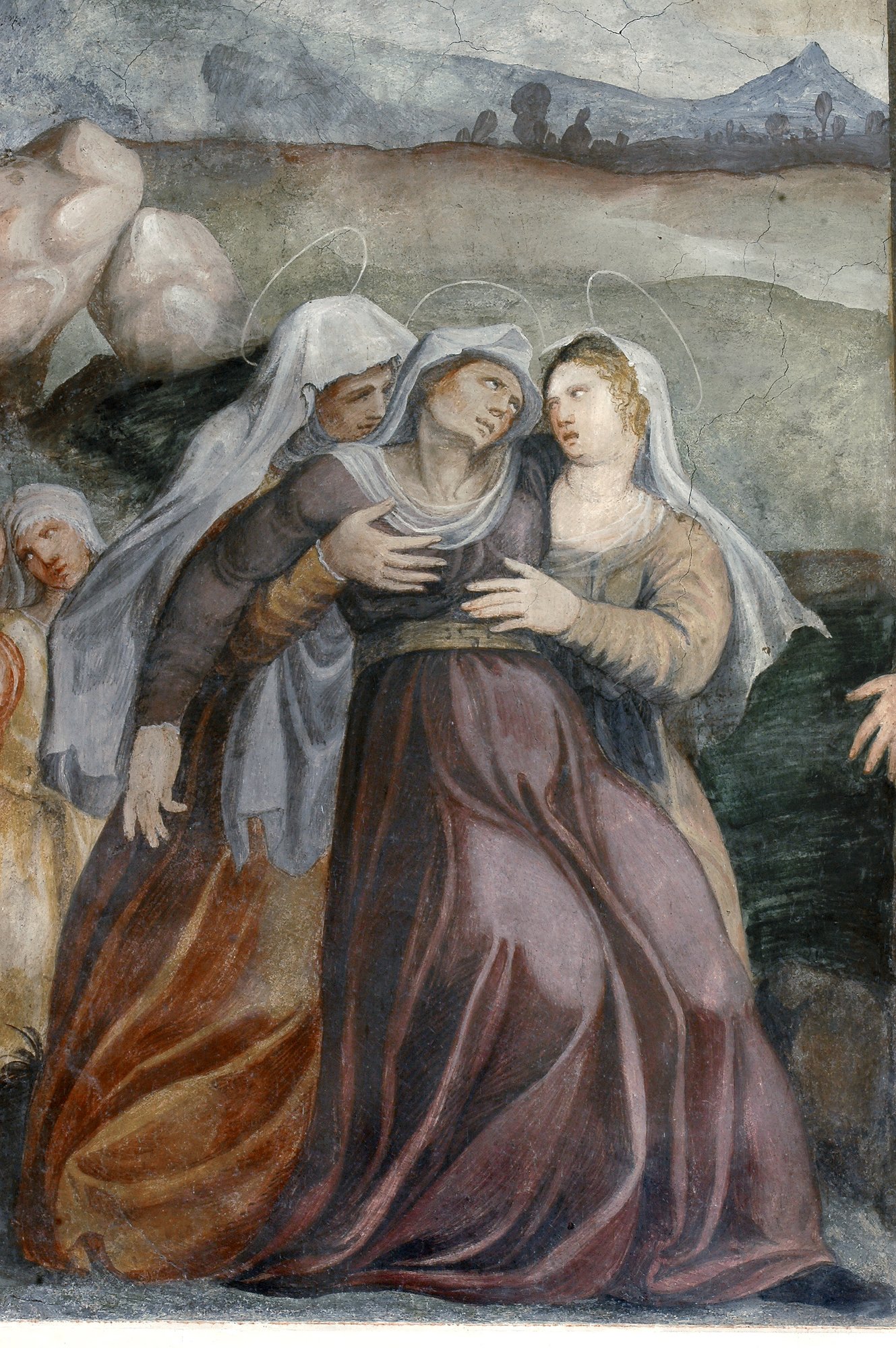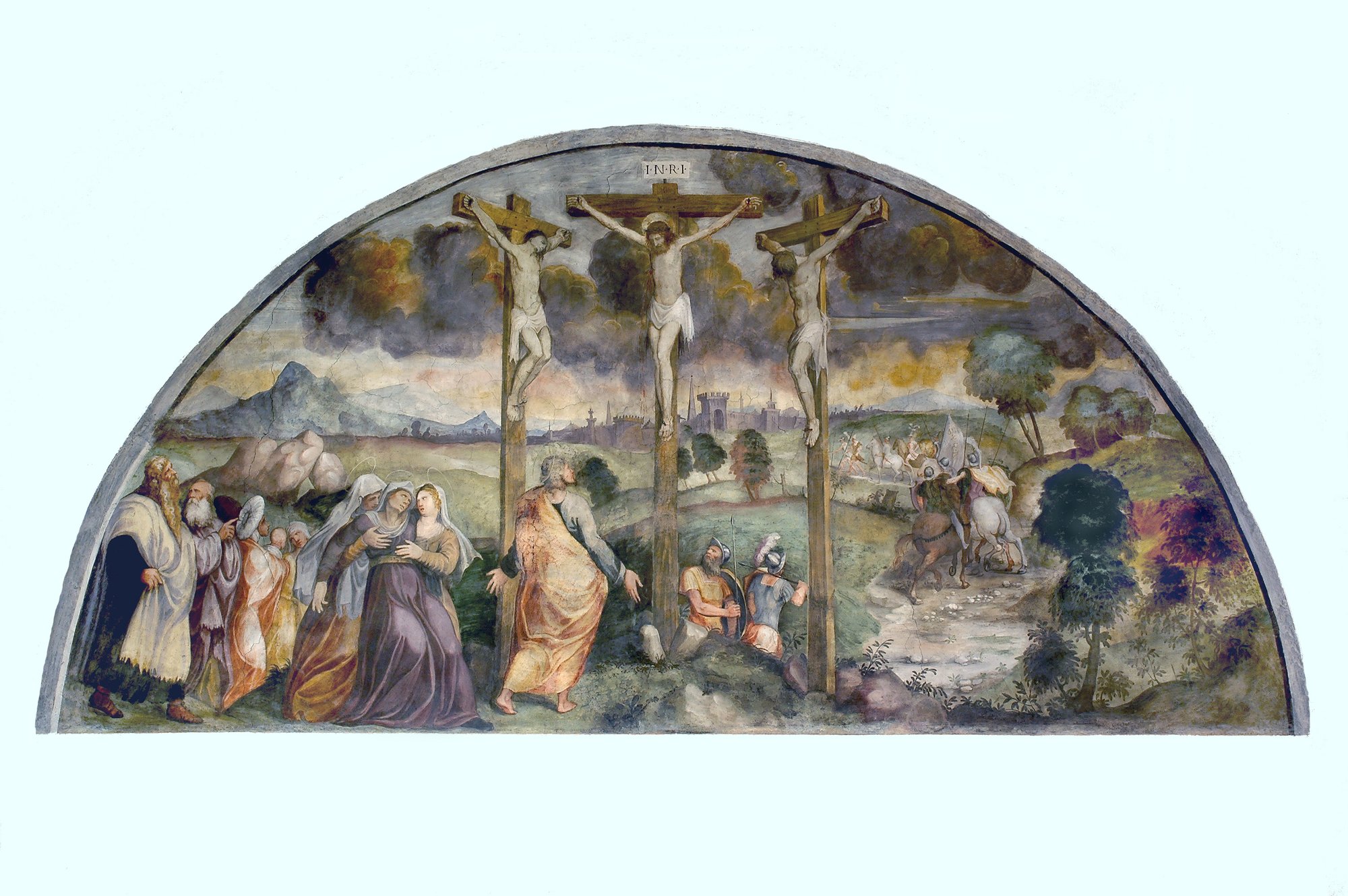 L’affresco raffigurante la Crocifissione generalmente riferito al pittore veronese Francesco Torbido, che sappiamo avere eseguito nel 1535, su incarico di Matteo Giberti, vescovo di Verona e abate commendatario dell’abbazia, le decorazioni del presbiterio. Tuttavia, è stata avanzata anche l’ipotesi che l’autore sia il giovane Battista dell’Angelo, detto il Moro, cognato del Torbido, con il quale spesso collaborò. In effetti l’opera presenta diversi riferimenti che sembrano condurre a tale autore: il gruppo di cavalieri e fanti con cimieri piumati e bandiere a destra è la trasposizione di un brano della Battaglia di ponte Milvio, affrescata da Giulio Romano nella sala di Costantino in Vaticano (1520-1524), mentre le pie donne e il gruppo dei due soldati sotto le croci sono la rielaborazione della Crocifissione dello stesso Giulio Romano nel duomo di Mantova, incisa in precedenza proprio da Battista dell’Angelo. Inoltre, alcuni tratti ricordano il Parmigianino, in particolare nei tre nudi sulle croci e nelle due figure degli anziani, nelle lunghe barbe e negli ampi mantelli, nell’angolo a sinistra. Vicino a questi si trovano tre splendide teste. Infine, a rafforzare la tesi che l’autore sia veramente Battista dell’Angelo è il confronto con alcuni suoi dipinti in palazzo Canossa a Verona.