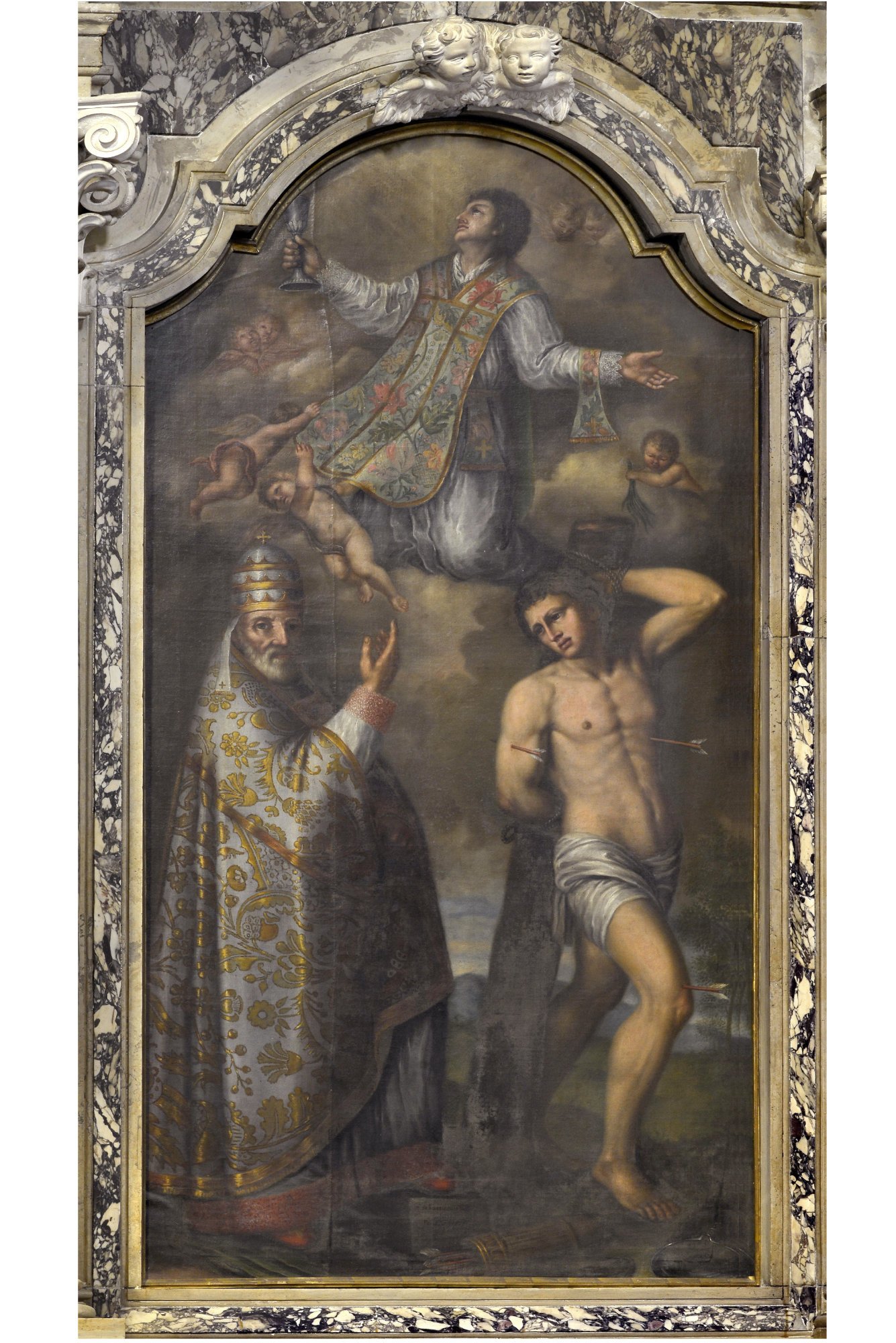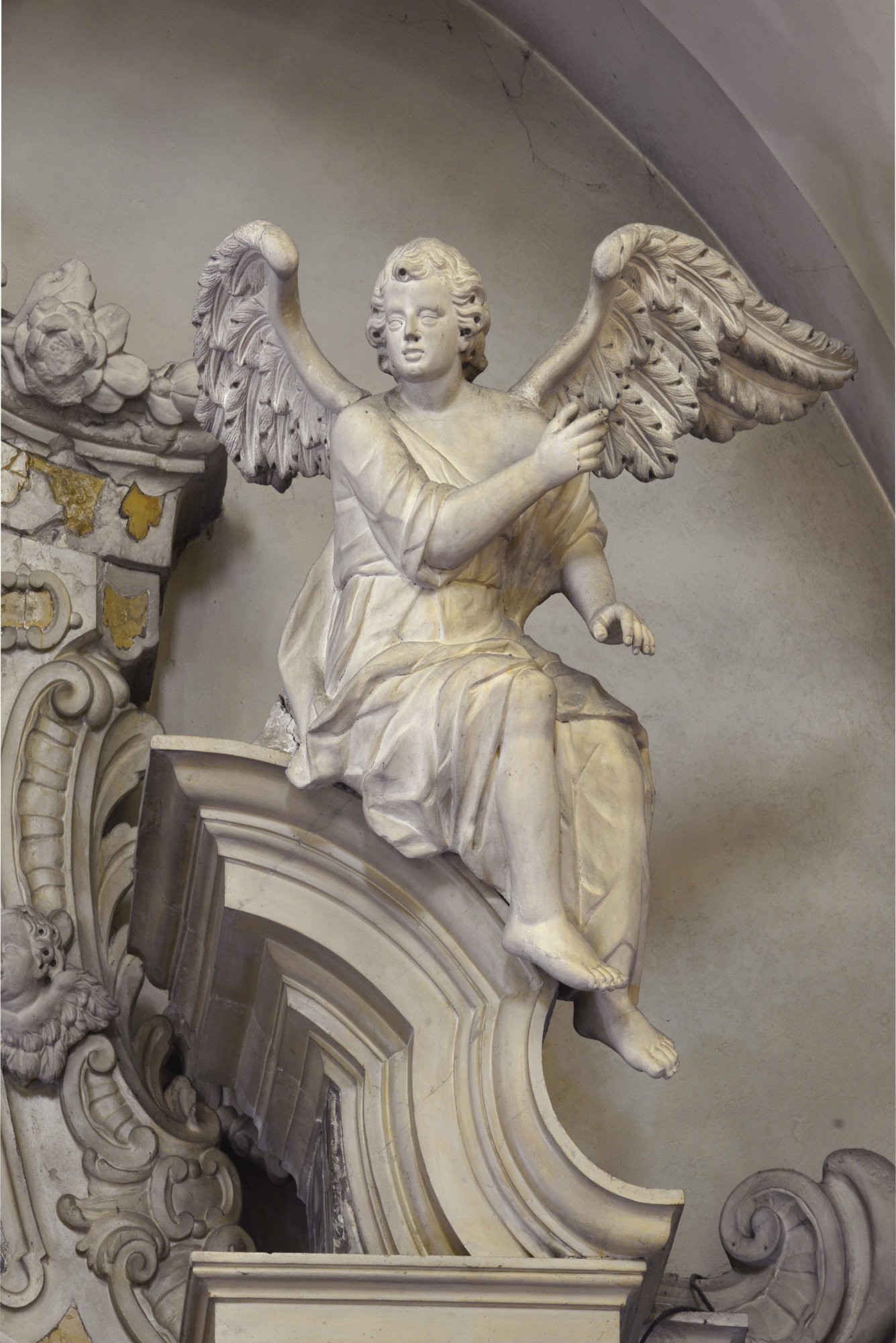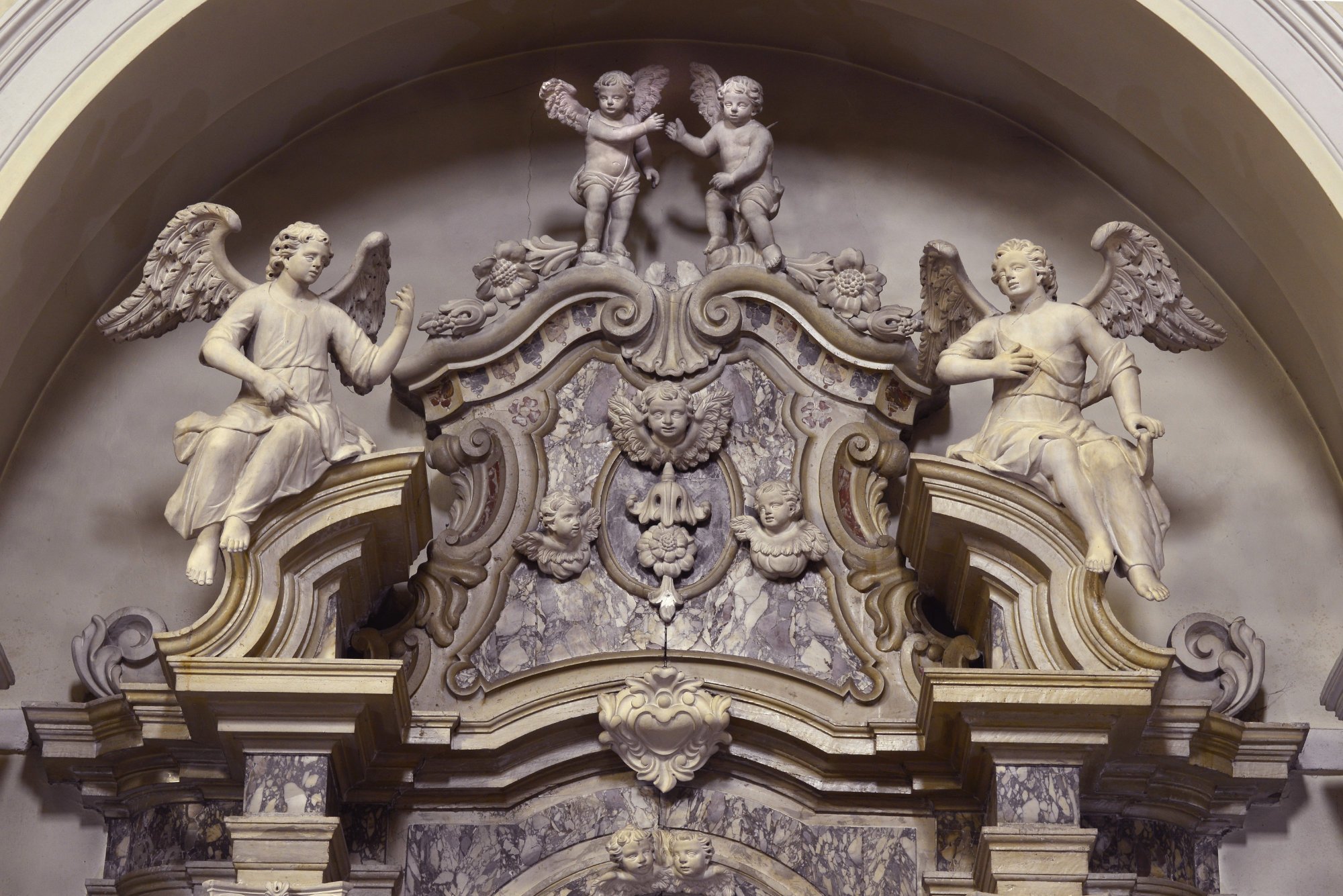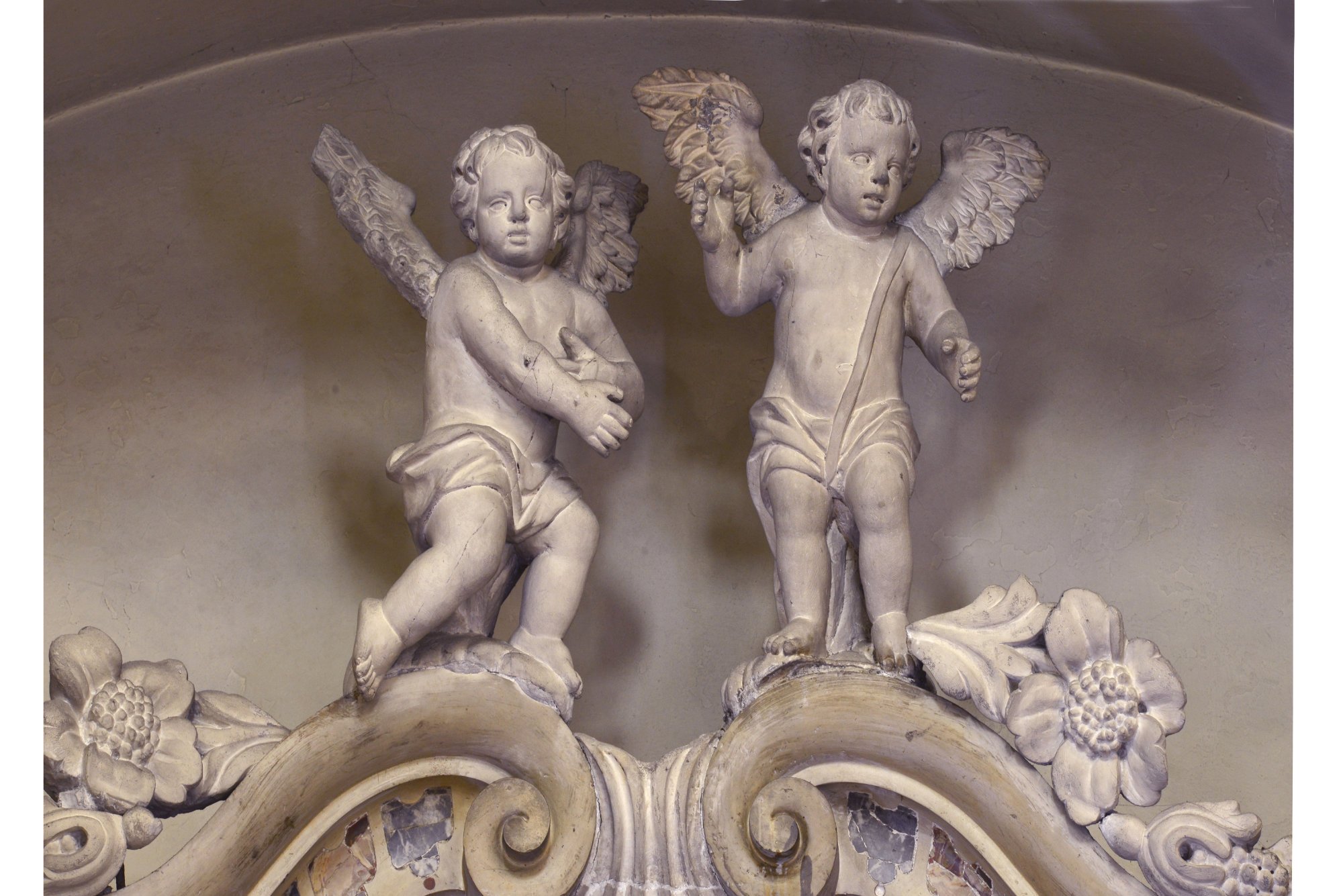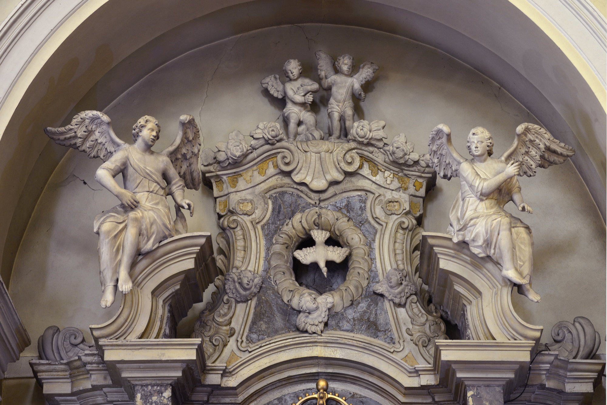 Le imponenti figure di San Pietro e San Paolo, ai lati dell’altare, sono una trascrizione della contemporanea statuaria di Giacomo Contieri (documentato tra il 1748 e il 1787-1788).