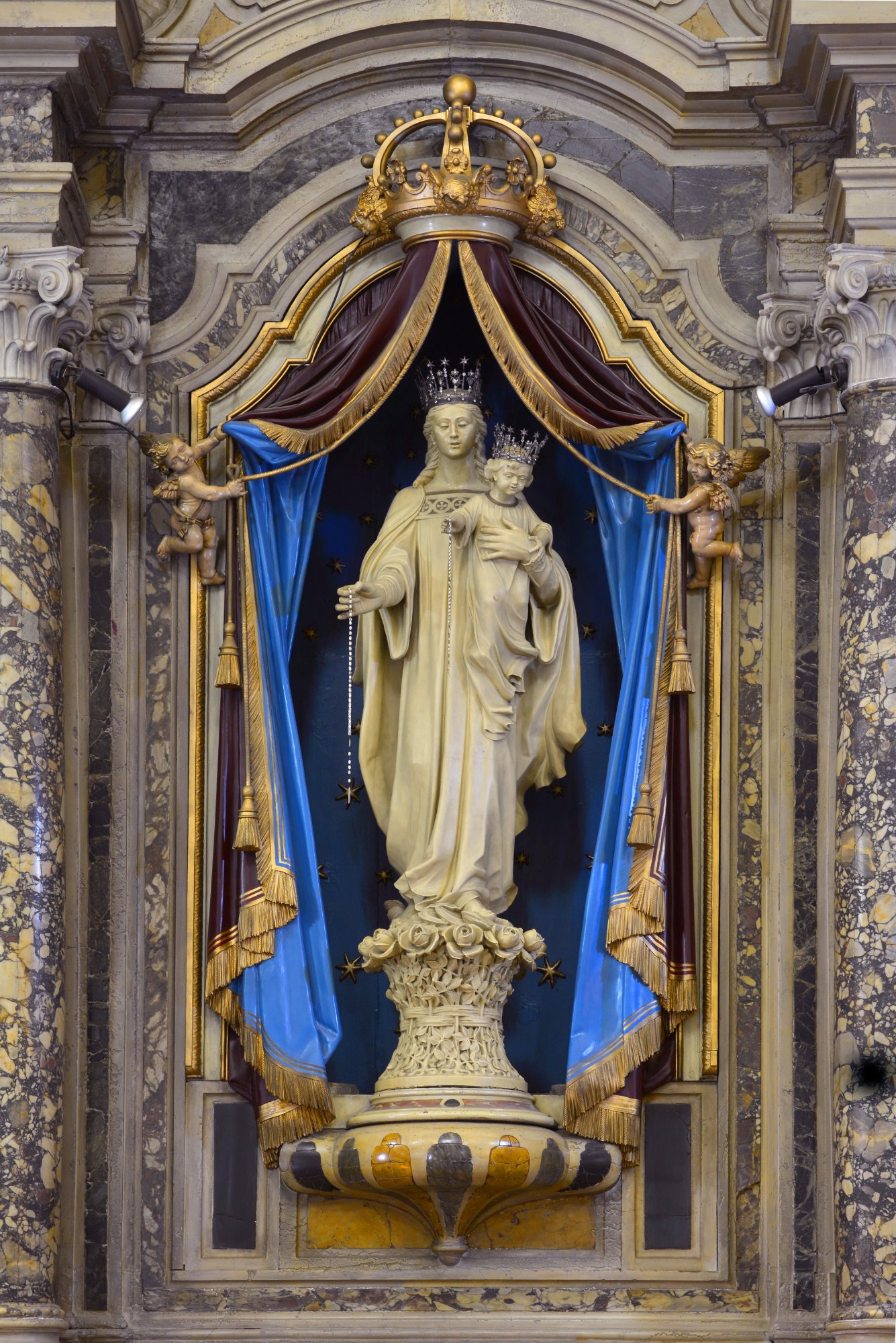 Nella nicchia è collocato il simulacro della Madonna con Bambino in legno di cirmolo con corona intagliata e dorata, eseguita nel 1866 dallo scultore Antonio Destro di Venezia, mentre la cornice lignea e la poltroncina intagliata e dorata si devono a Umberto Sgobaro di Udine (1905) al quale spetta pure il baldacchino pendente sopra l’altare maggiore.