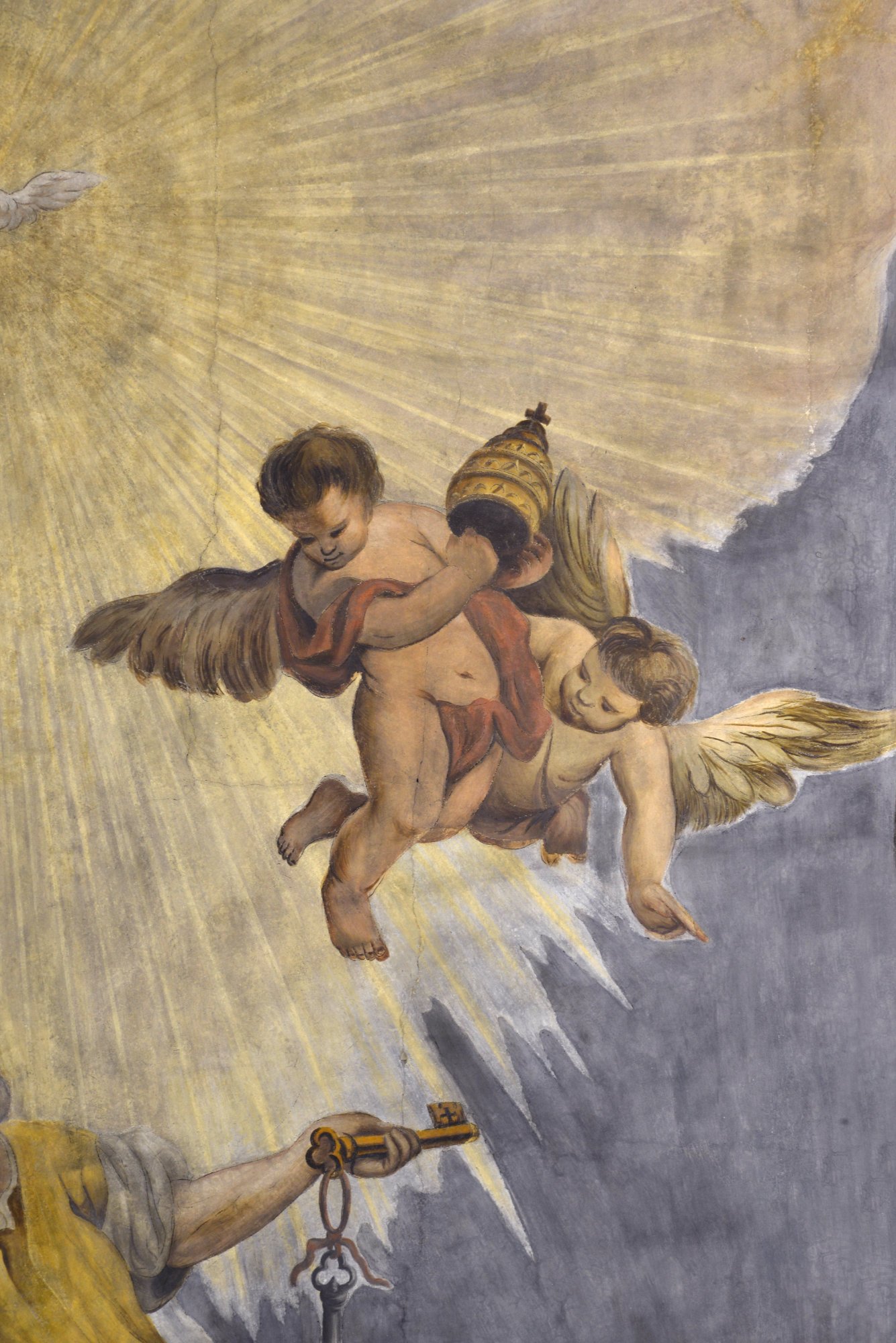 Sul soffitto, entro una cornice modanata, è posto il grande affresco (restaurato nel 1995), che raffigura San Pietro che riceve la tiara papale e san Paolo in ginocchio (del XVIII secolo).