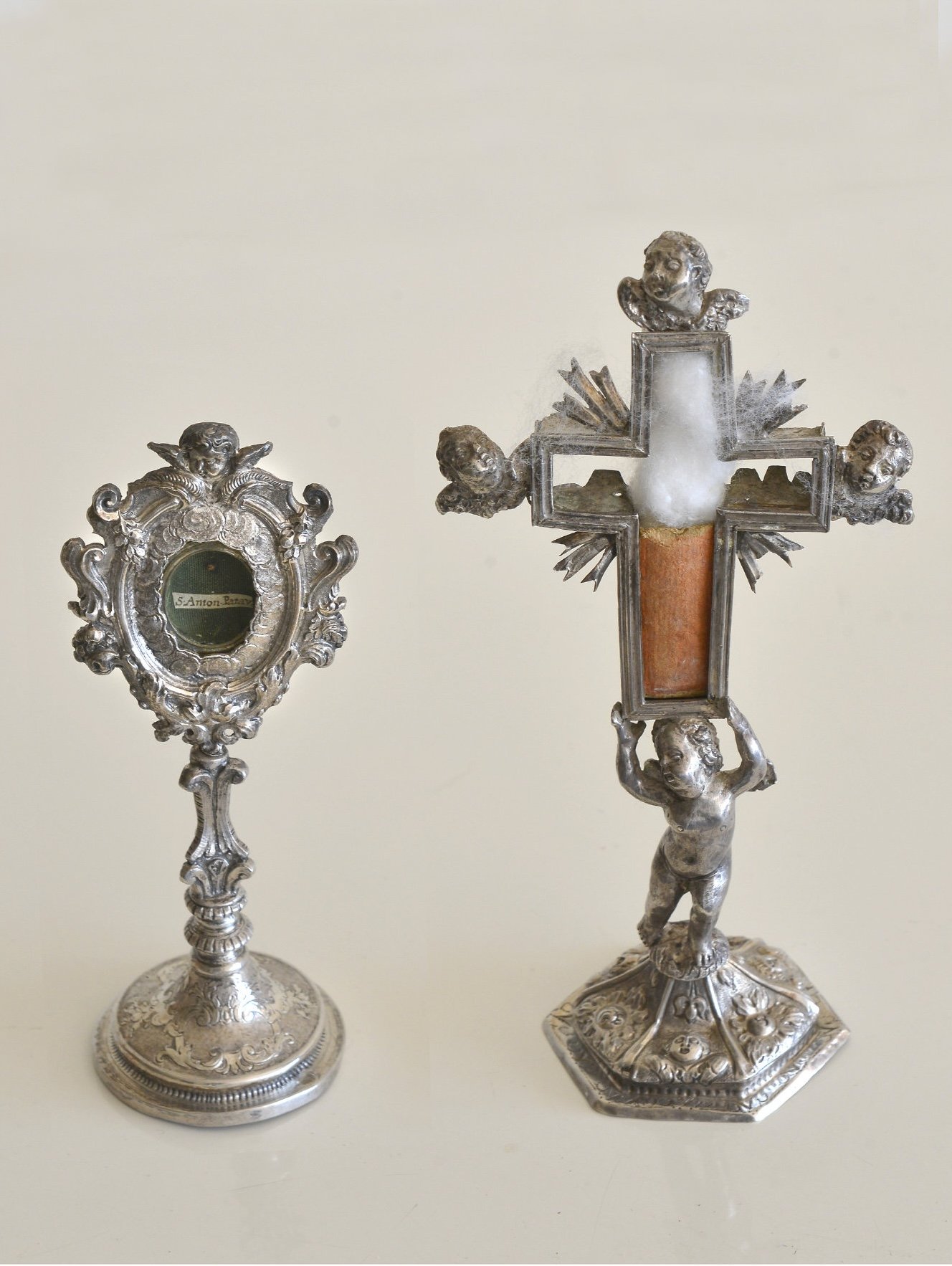 Contrassegni veneziani ricorrono anche nel secondo esemplare in argento sbalzato e in parte dorato della metà del Seicento – più tardi aggiunto di nodo e impugnatura – caratterizzato da terminazioni ovate ospitanti al dritto le immagini dell’Eterno Padre, della Maddalena, della Vergine e San Giovanni Evangelista e del Crocifisso al centro, condotto nei modi di Guglielmo della Porta; al rovescio della Madonna del Rosario respirante la produzione plastica del tardo Cinquecento veneziano.