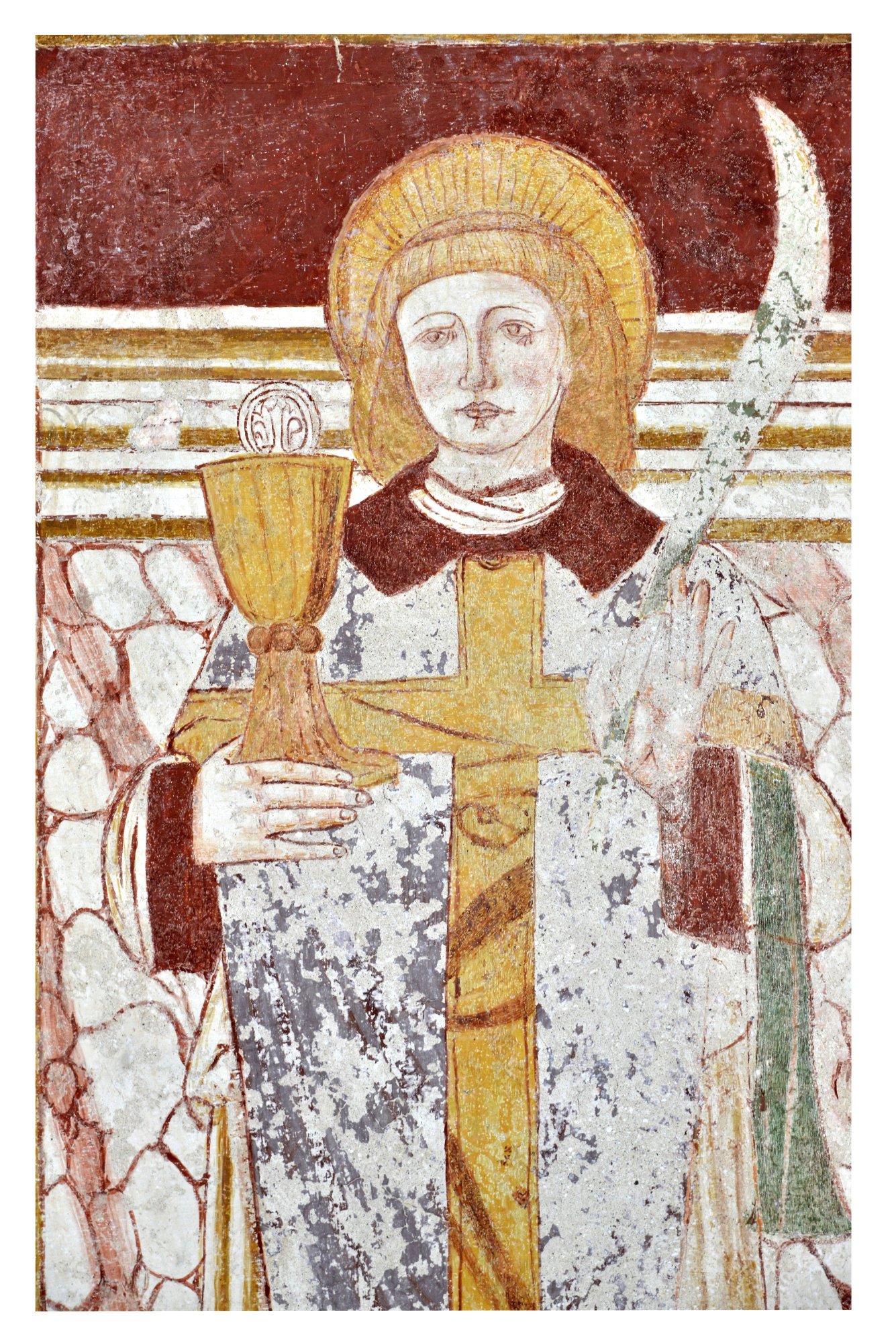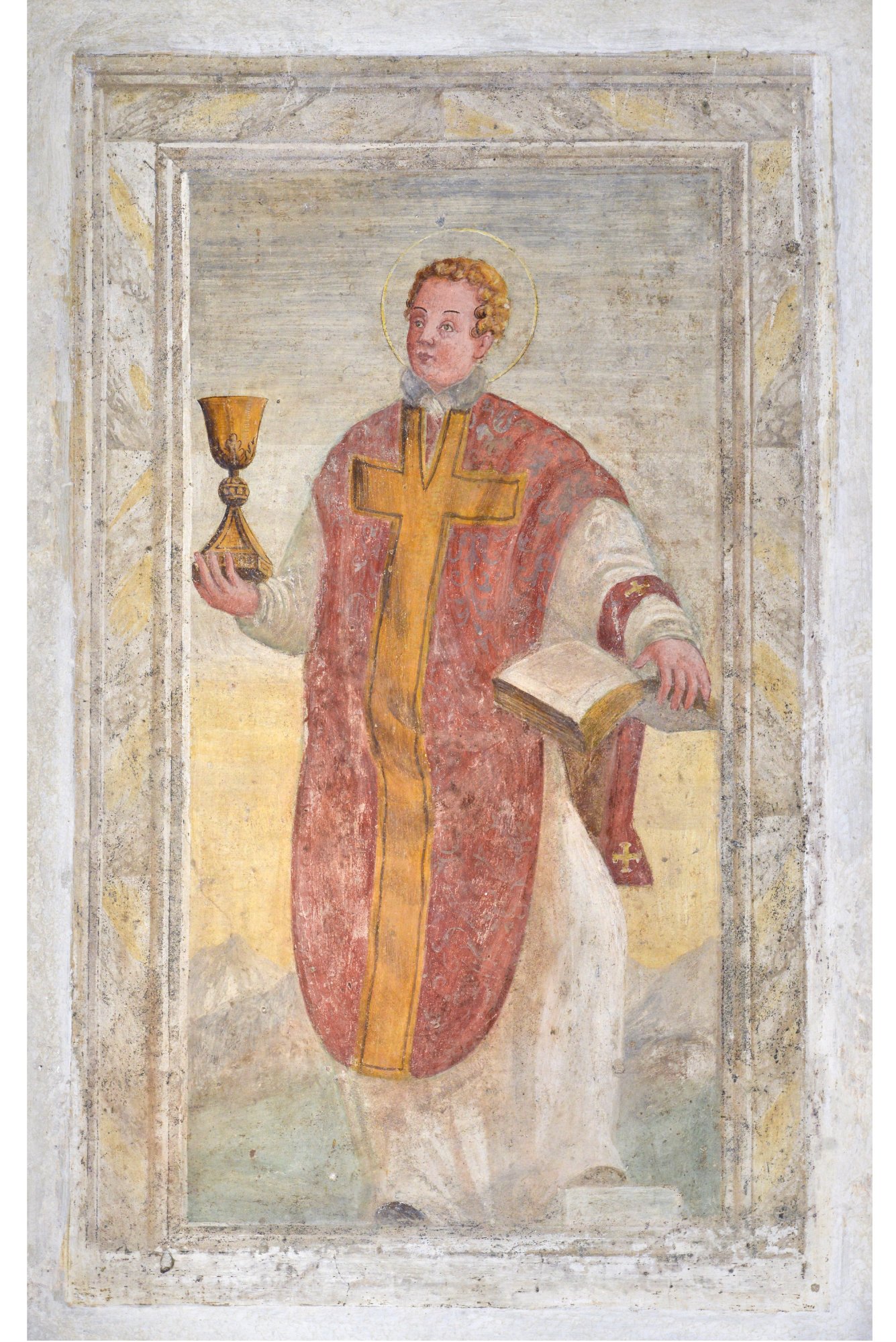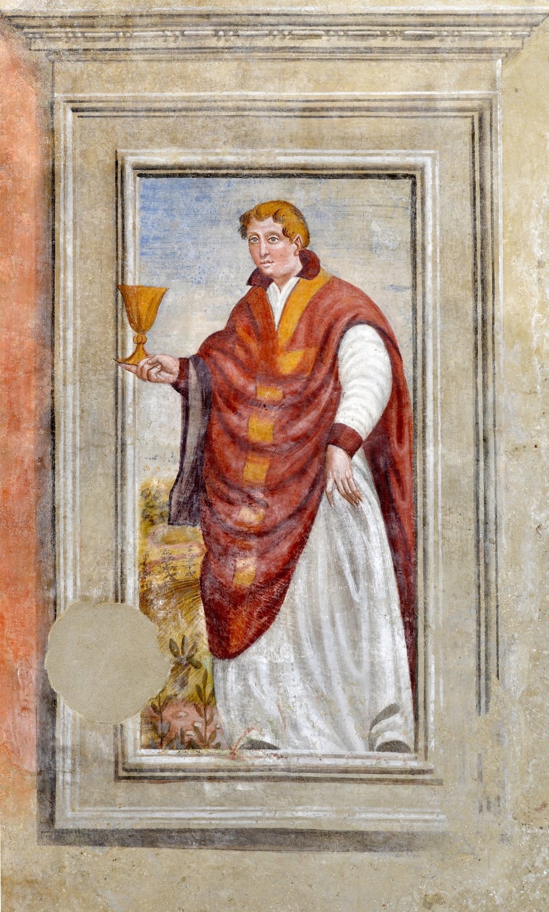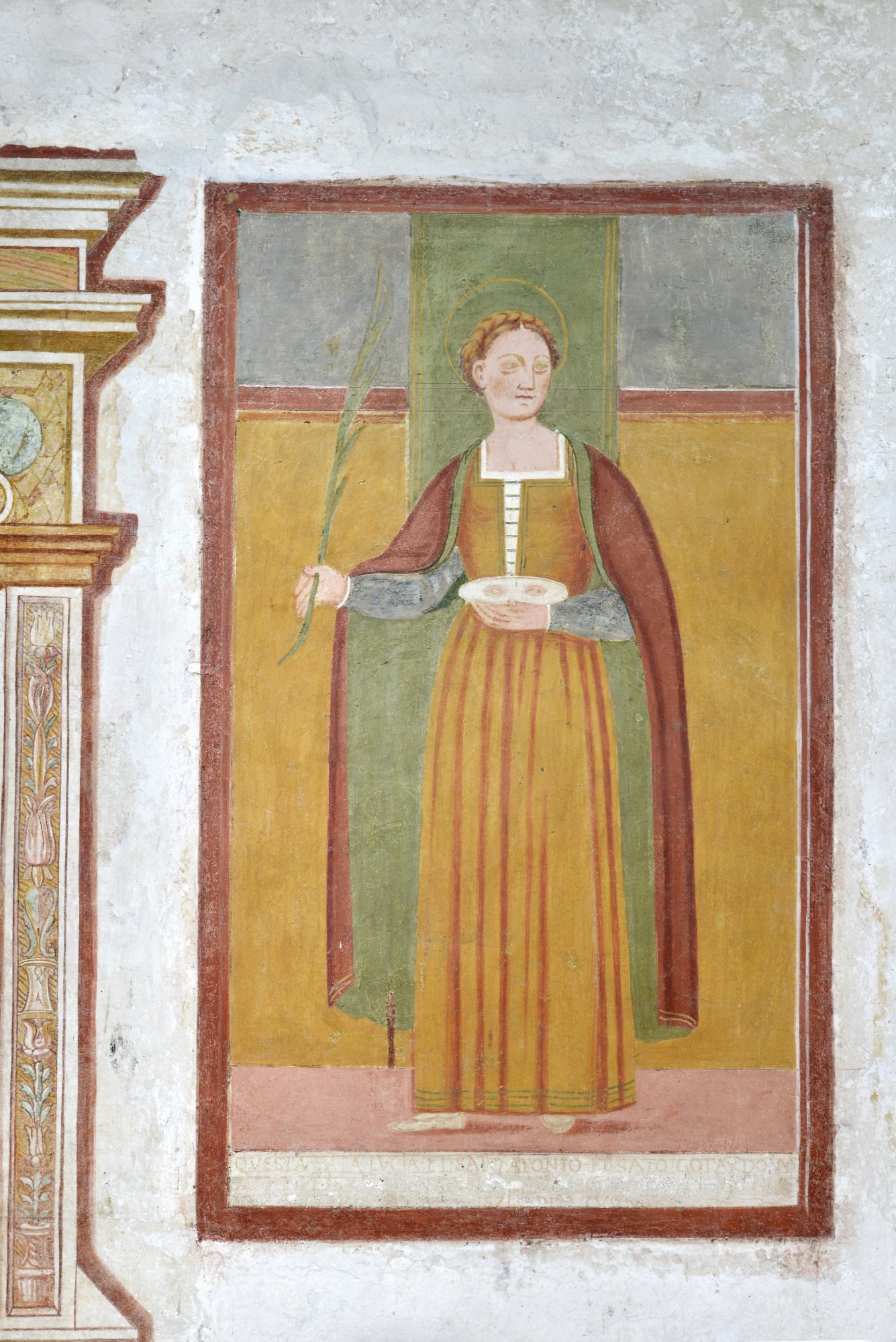 Una semplice fascia rossa delimita nel vicino pannello una rusticana Santa Lucia, campita su fondo ocra con gli usuali attributi: la sottostante iscrizione dedicatoria tramanda il millesimo 1571. Sulla parete opposta una cornice di finto marmo inquadra la figura di San Valentino riferibile a uno degli autori operanti in Santa Croce.
