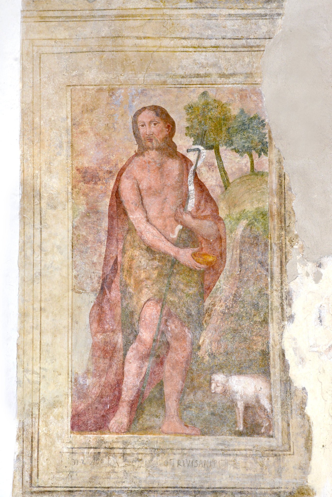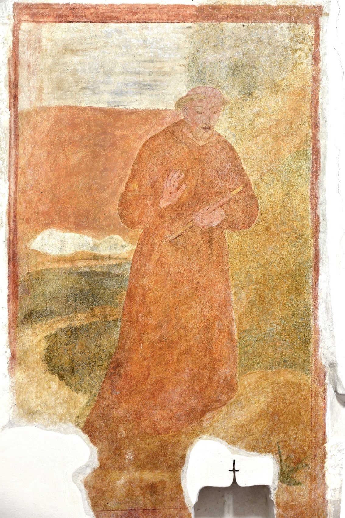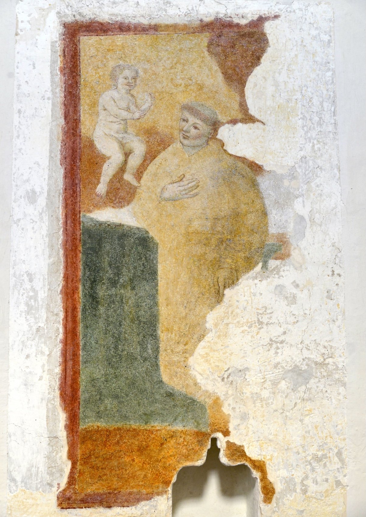 Sui lati dell’abside si hanno le immagini di carattere popolareggiante di Sant’Antonio di Padova e San Francesco d’Assisi (secolo XVIII), precedute da un lacerto di primo Cinquecento con la Vergine e Bambino con una torre campanaria sullo sfondo.