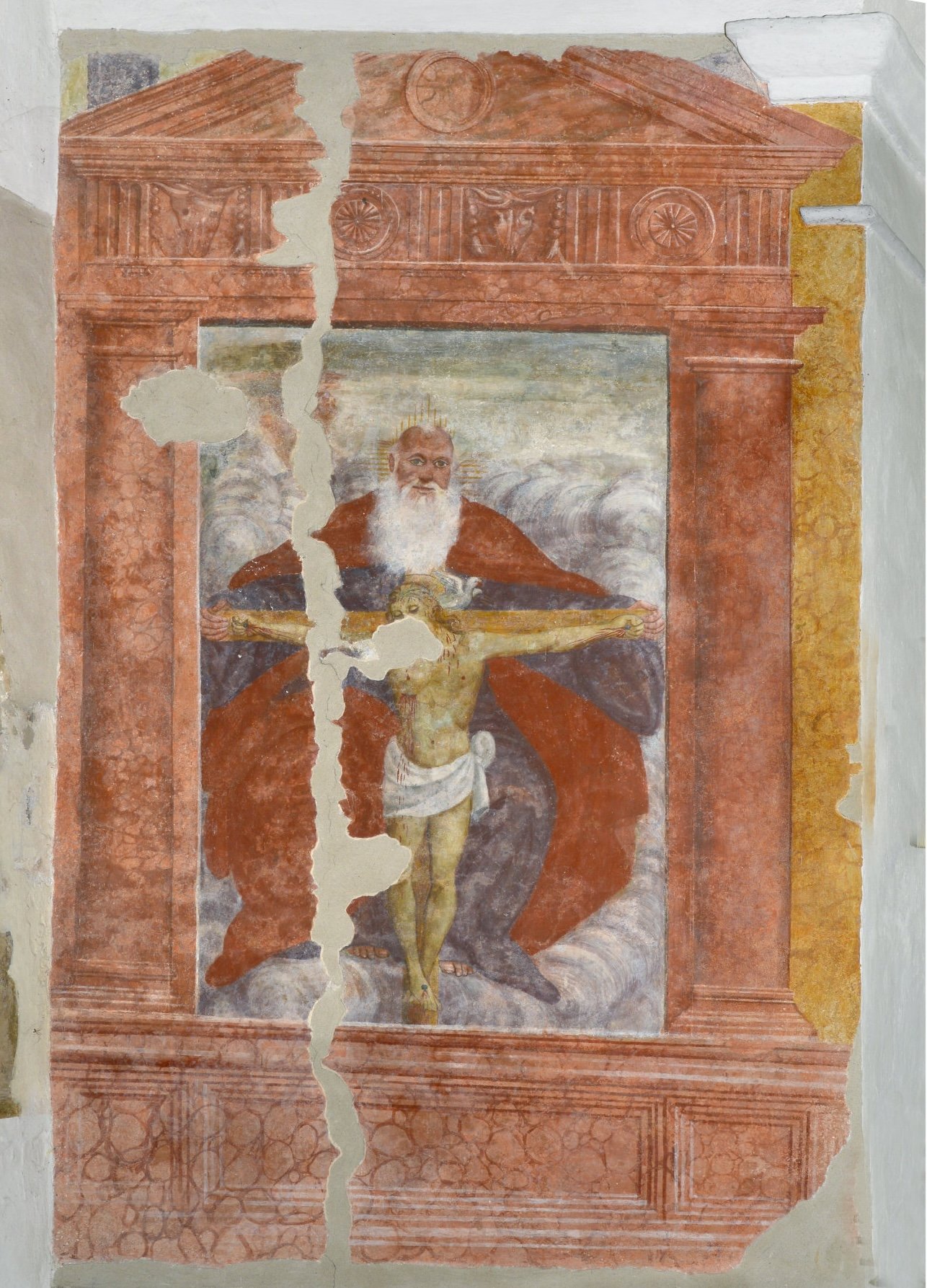 Sul lato destra dell’arco santo, un’edicola di carattere architettonico ospita l’affresco della Vergine con il Bambino, san Francesco e santo martire, e sull’opposto, analoga struttura inquadra la Trinità con la croce sorretta dal Padreterno, esemplata da Giovanni Maria Zaffoni detto il Calderari: partito pittorico che va distribuito tra Giuseppe Moretto, Francesco Pisani e altre maestranze pordenonesi.