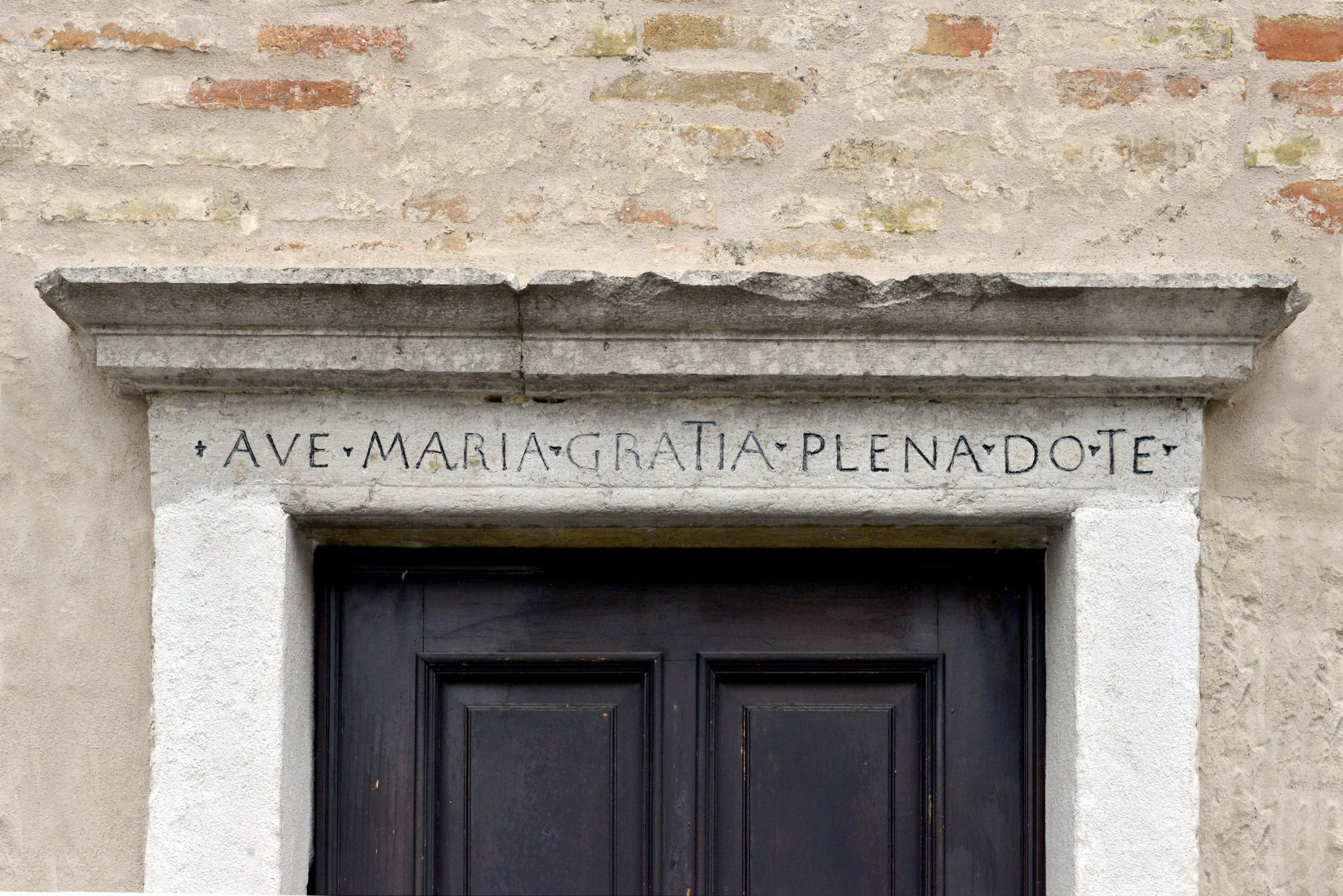 Sull’architrave della porta secondaria, inquadrata in pietra con cimasa, corre l’iscrizione: AVE MARIA GRATIA PLENA D(ominus) T(ecvm).