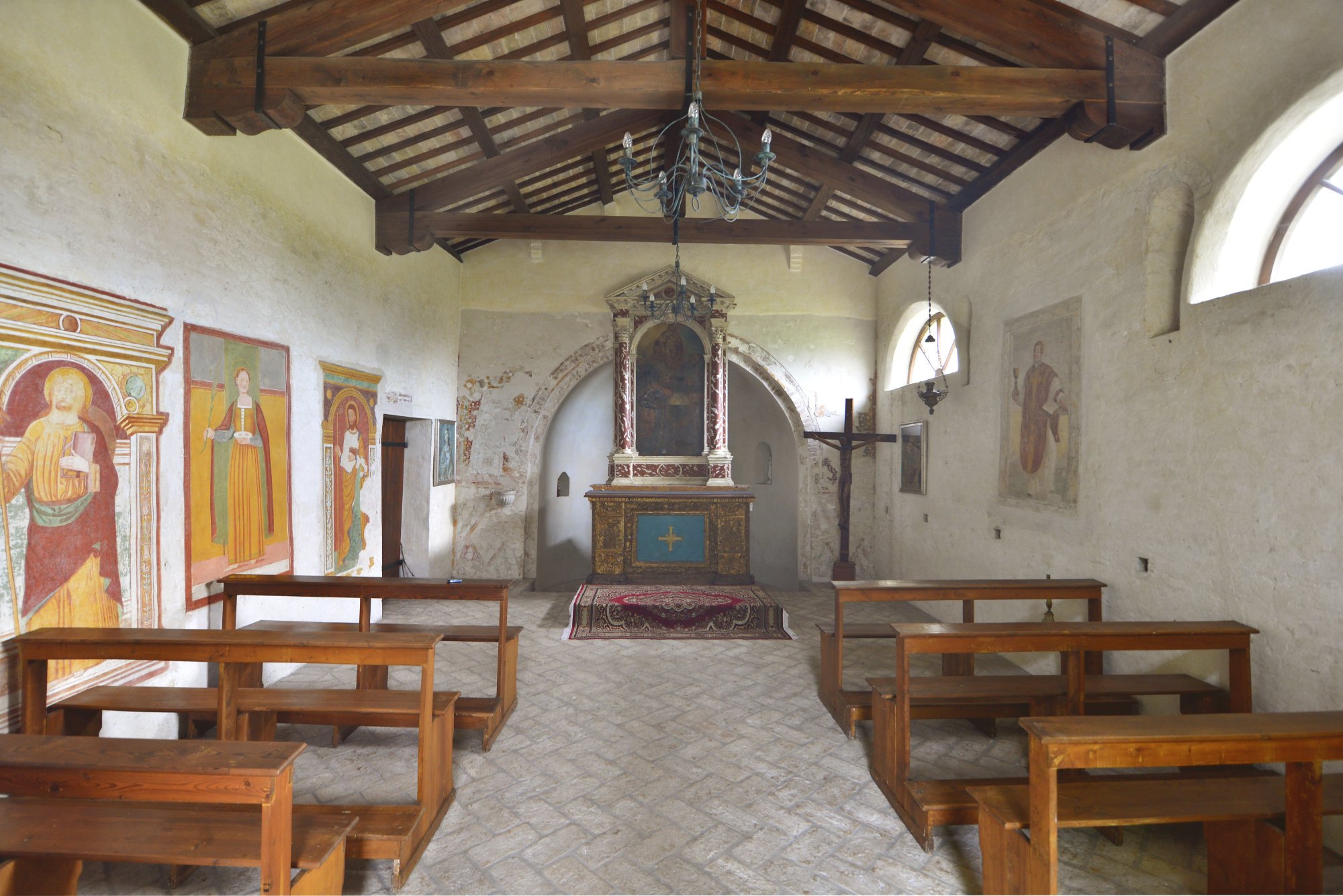 L’interno si presenta ad aula unica con travi a vista, abside quadrata e soffitto a vele.