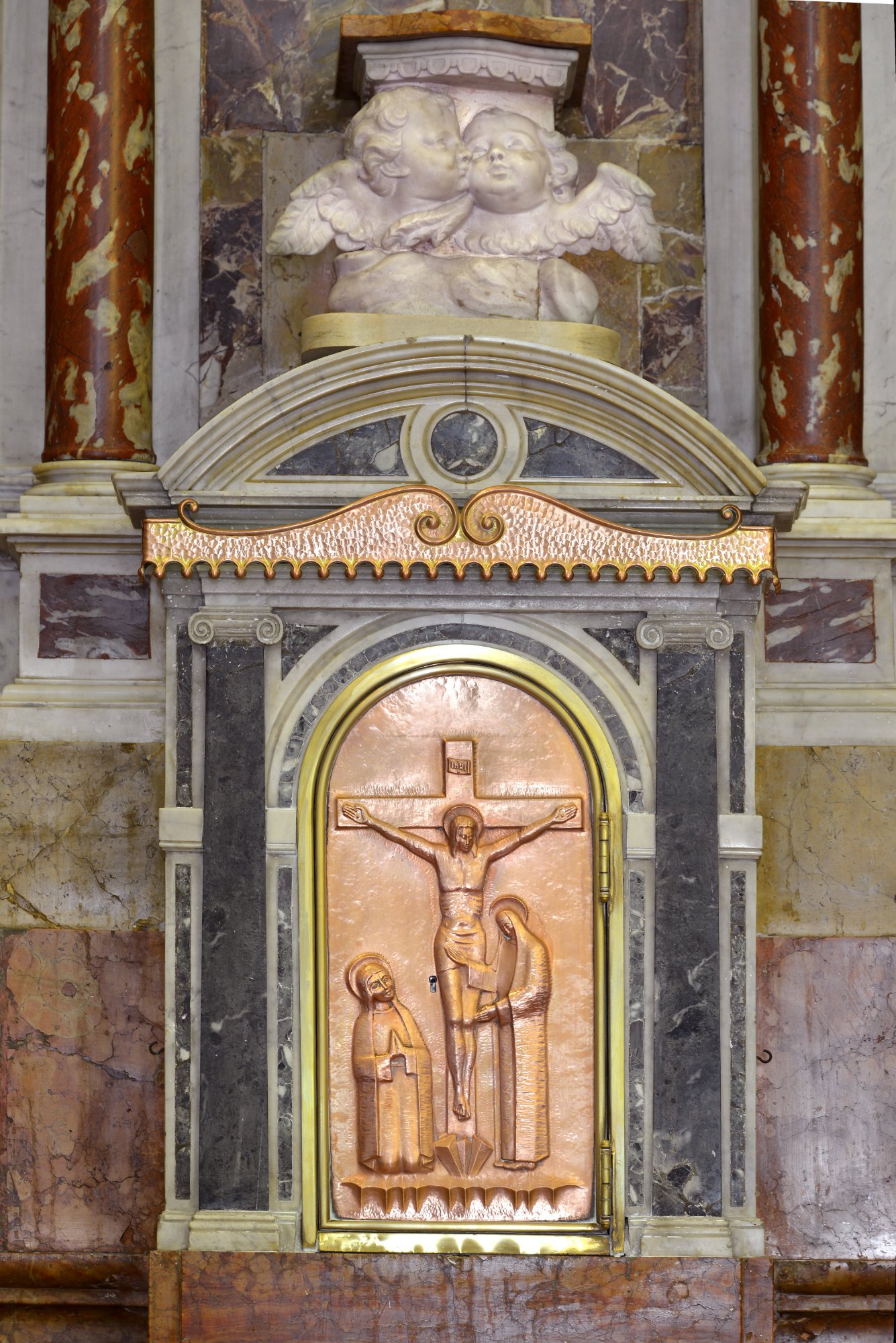 A mezzo dell’altare si eleva il ciborio ottagono (alterato nelle proporzioni), cupolino a cipolla e statuetta del Redentore al vertice.