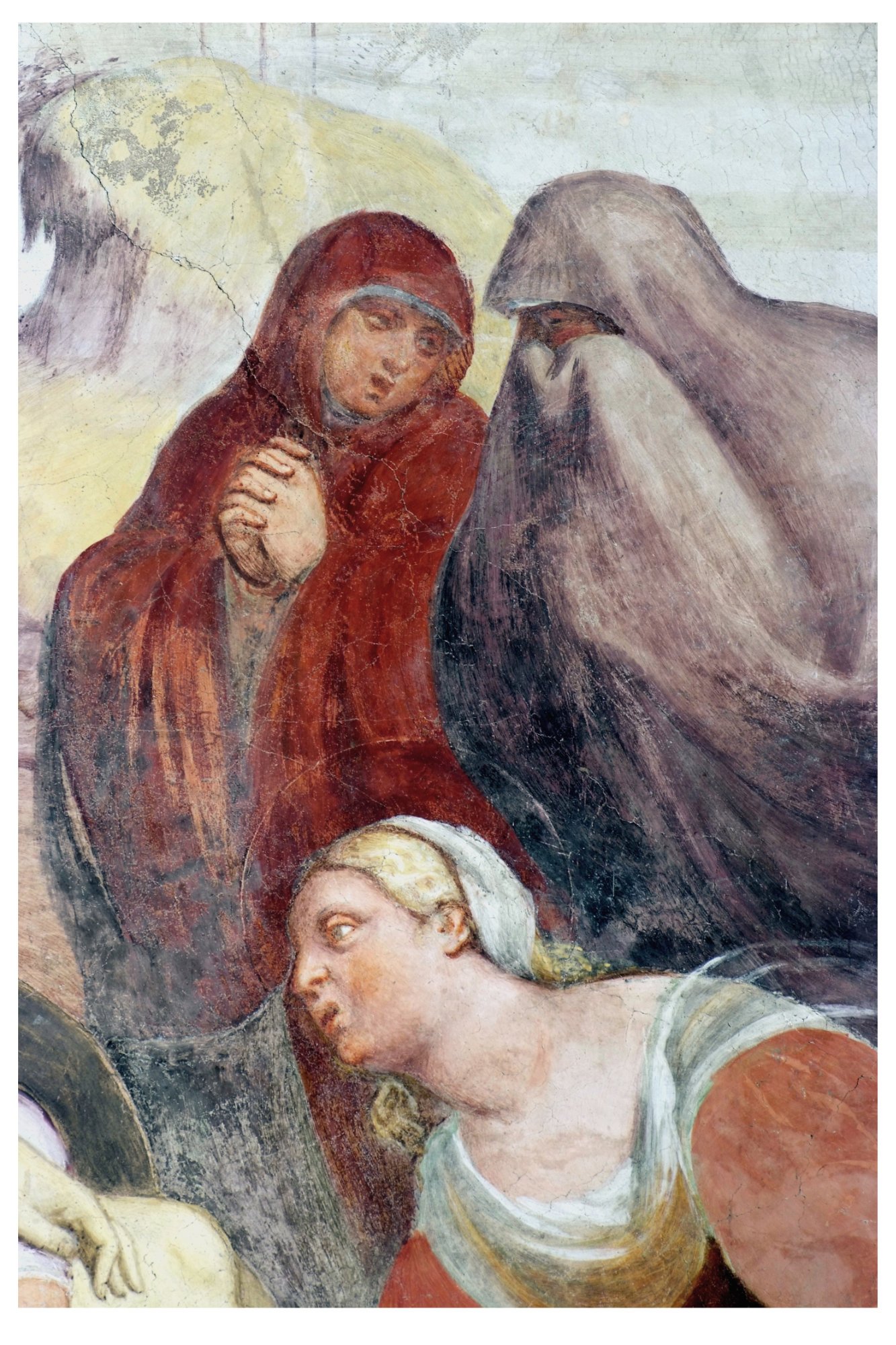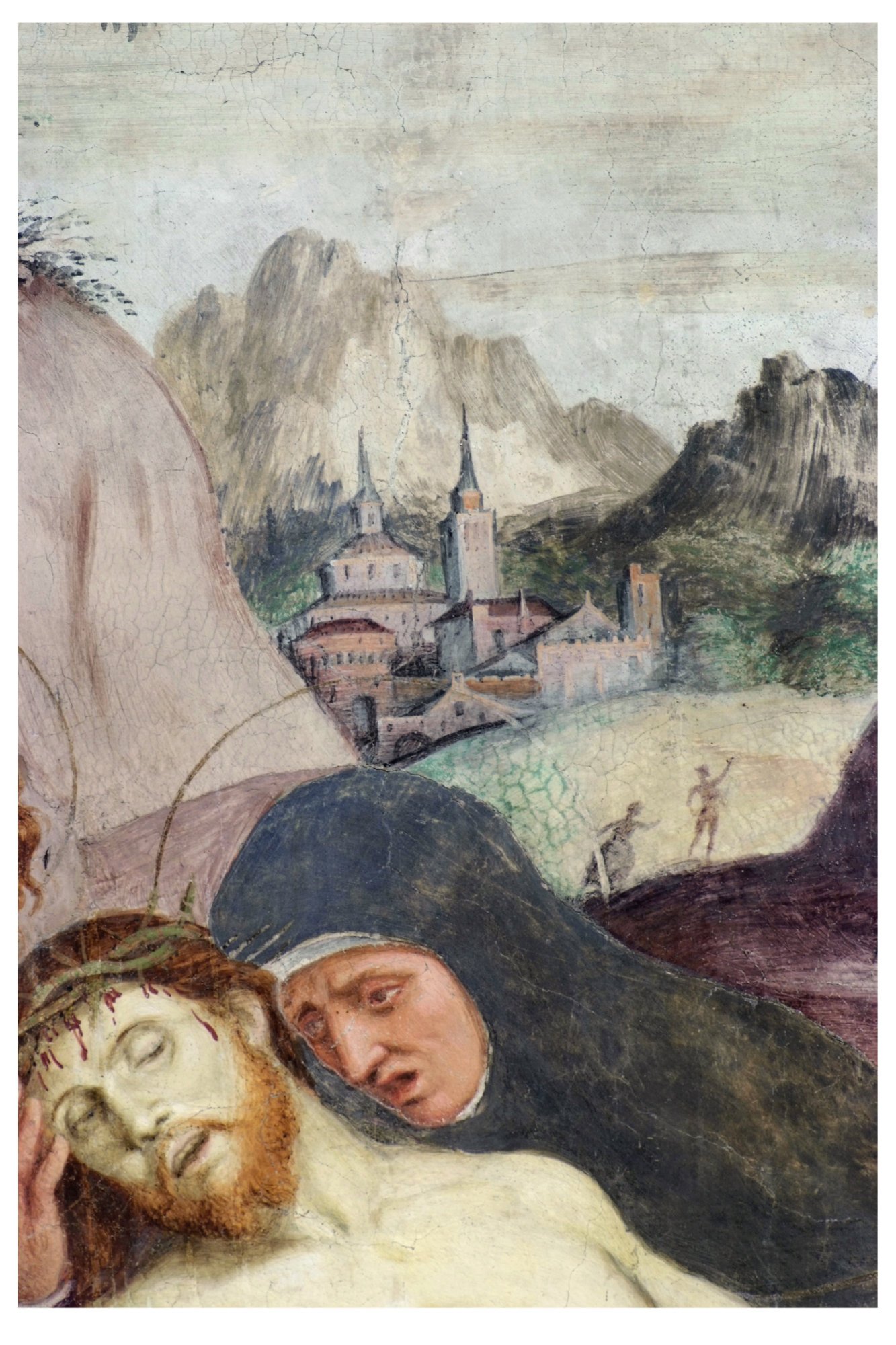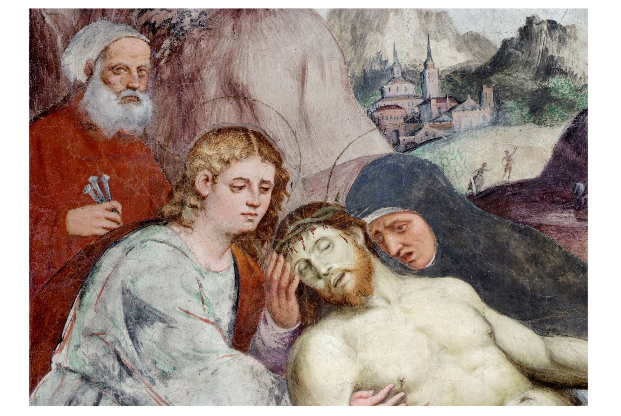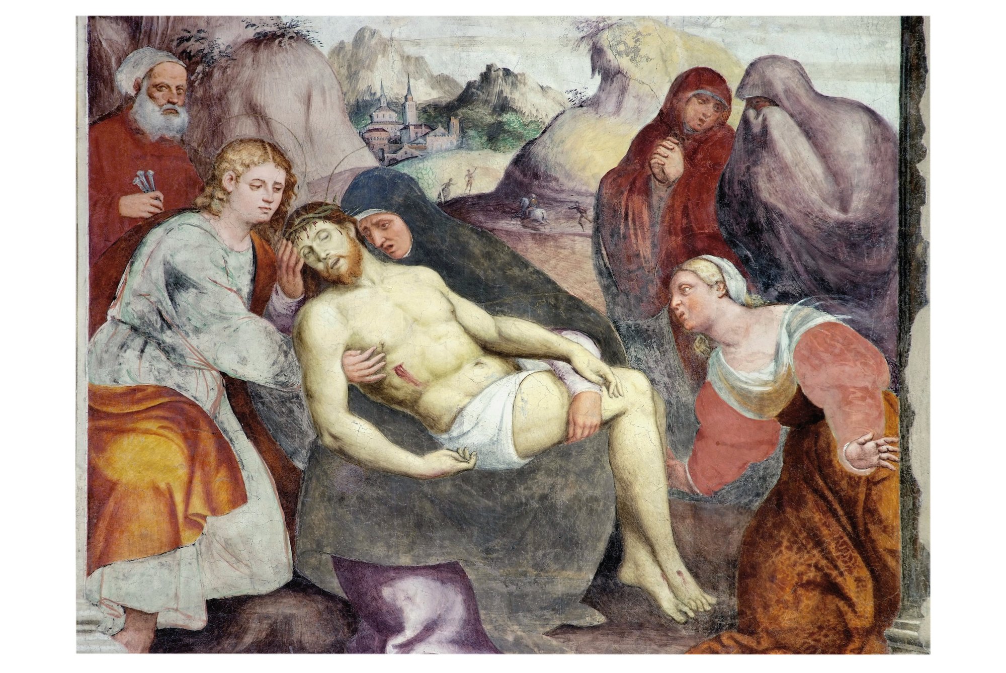 L’Amalteo si esprime con un linguaggio che echeggia in parte il maestro Pordenone con un unico elemento di strazio e rigidità – il volto di Maria – che richiama la pittura nordica o i Vesperbilder della tradizione salisburghese. Per la madre ci si può riferire a Bartolomeo Montagna, ma per il resto si tratta dell’autentico Amalteo per cromatismo, gestualità, forme corpose, con l’aggiunta di un certo orientamento dinamico significante l’andata verso il sepolcro e verso la risurrezione.