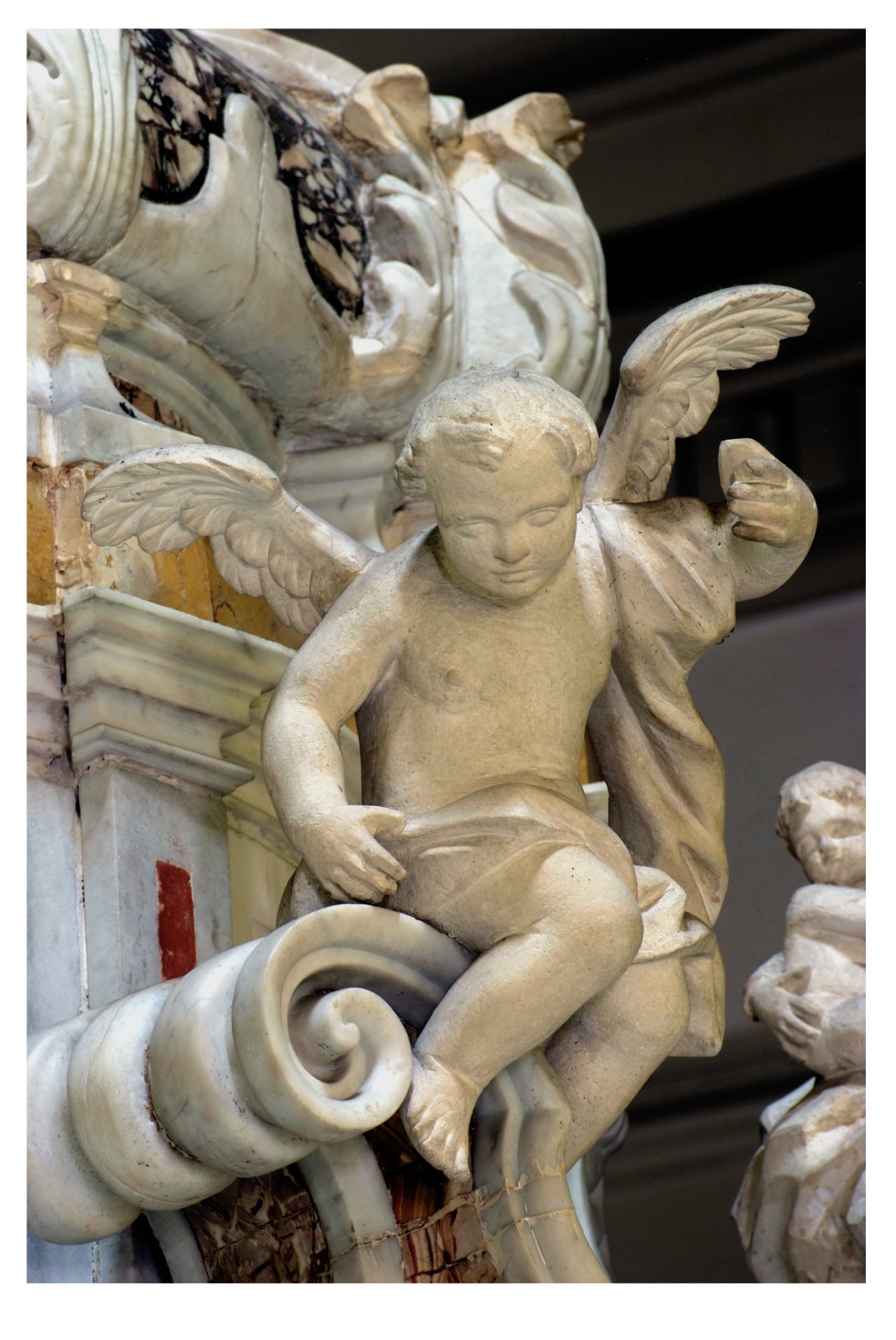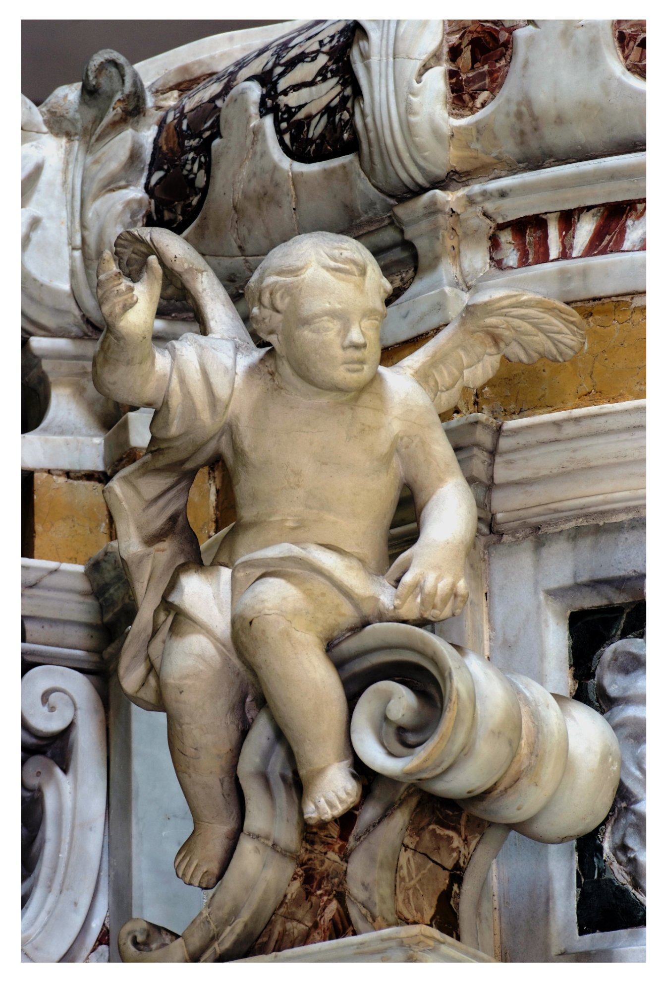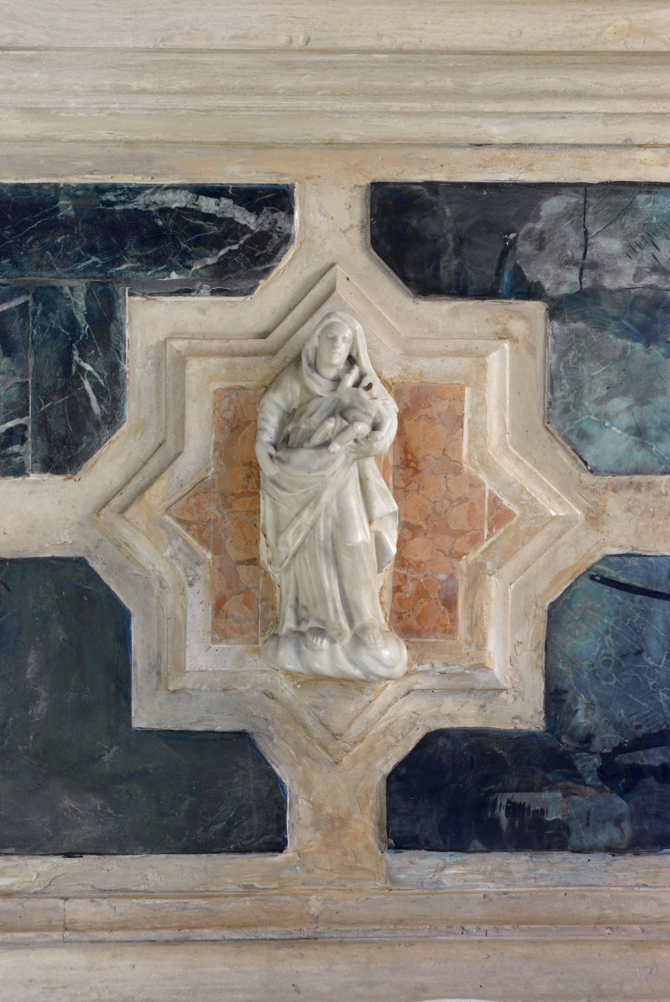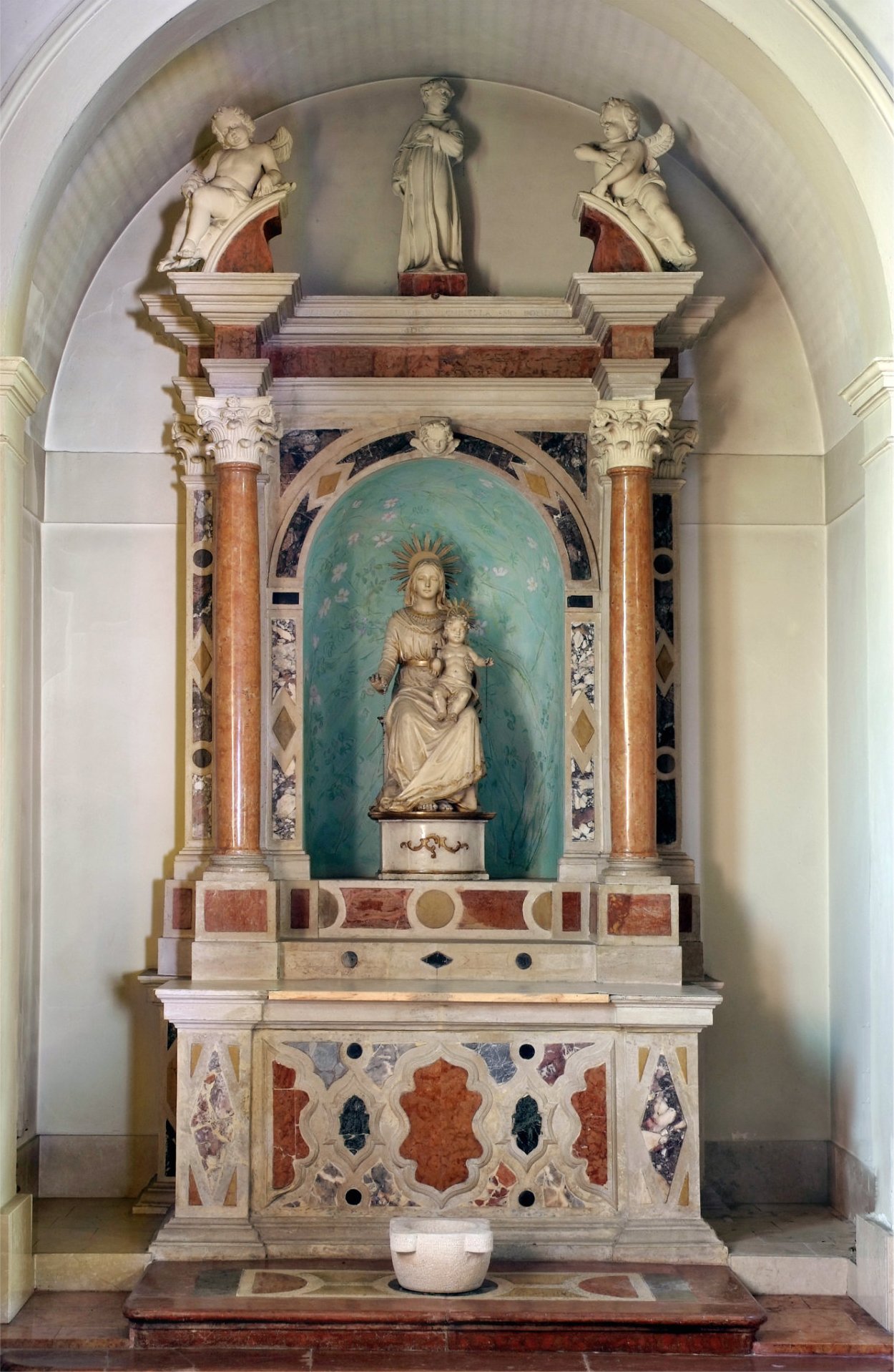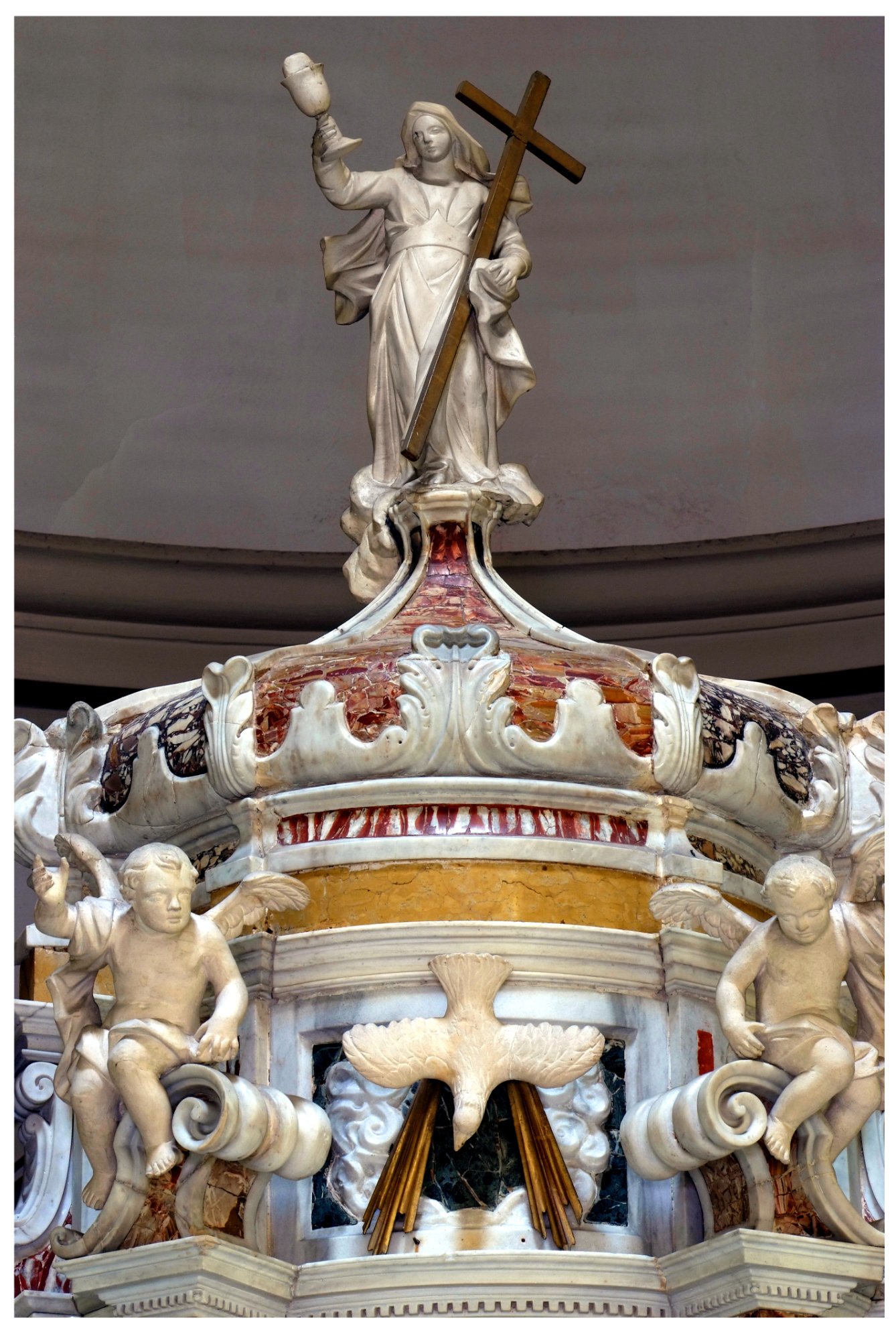 Il tabernacolo è una “macchina” di mole notevole, articolato su diversi piani, in marmi bianchi e rossi venati. La custodia vera e propria si colloca al piano inferiore e presenta la porticina contornata da un volo di cherubini adoranti; alle spalle di eleva il tempietto su di una zoccolatura a specchiature rosse, dalla quale si innalzano quattro colonne di marmo rosso terminanti con candidi capitelli d’ordine corinzio contornanti il luogo dell’esposizione sul quale si stende un piccolo padiglione marmoreo. Al di sopra della trabeazione si imposta un complicato coronamento con angioletti marmorei, colomba dello Spirito Santo, statuette della Carità (che nutre alcuni bambini) e della Speranza (con l’ancona) ai lati e al vertice della Fede velata, reggente con la destra il calice con l’ostia e con la sinistra la croce.