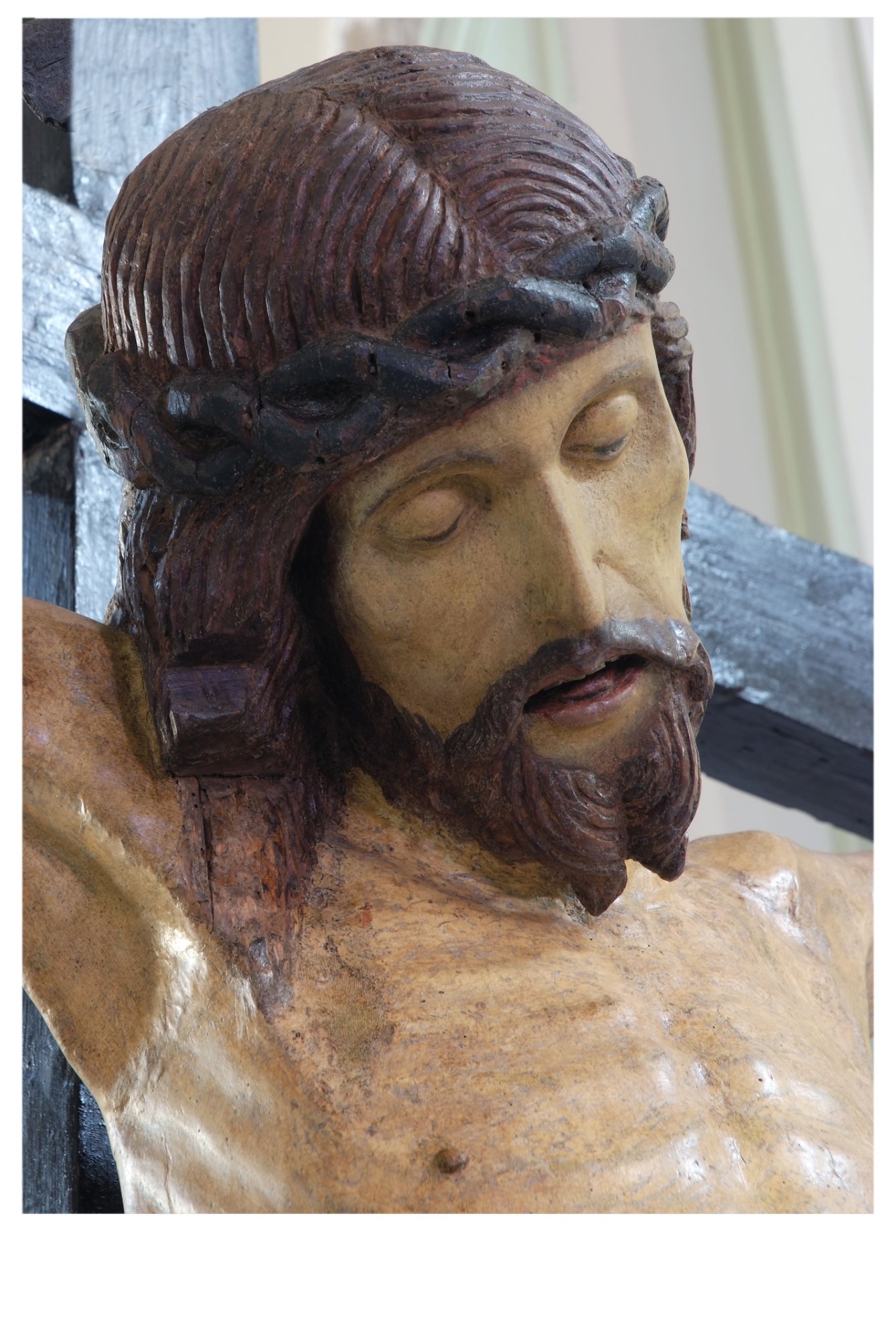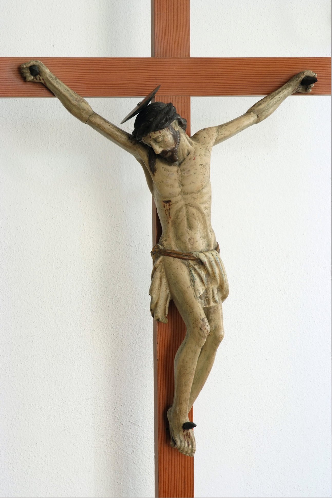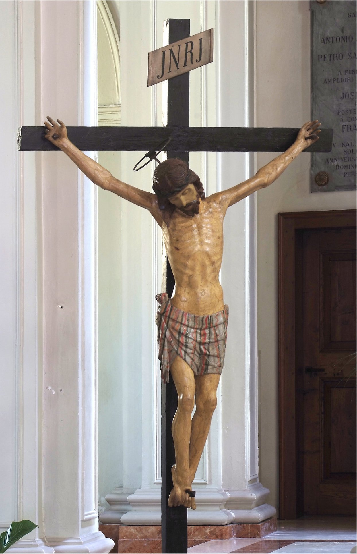 Adiacente alla gradinata del presbiterio è collocato il grande Crocifisso, quasi certamente l’antico Cristo del travo, che – spesso accompagnato dalle immagini della Madonna e di San Giovanni – si trovava nelle chiese sotto l’arco trionfale o arco santo che divideva la navata dal presbiterio. È una dignitosa scultura, che per alcuni versi (il trattamento dei capelli “a corda”, il perizoma a righe vivaci, la grande compostezza e serenità del volto) potrebbe rinviare al secolo XVI.