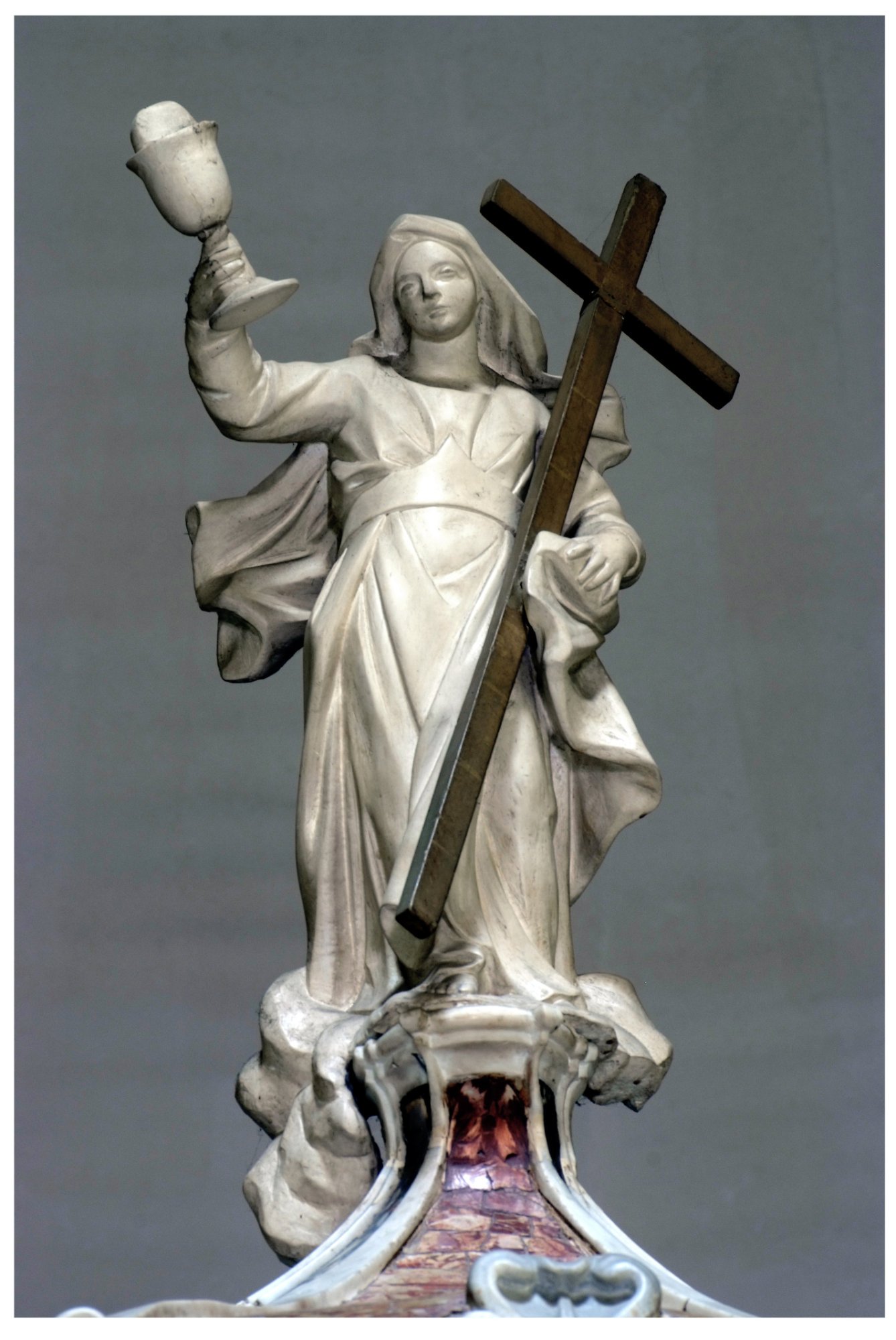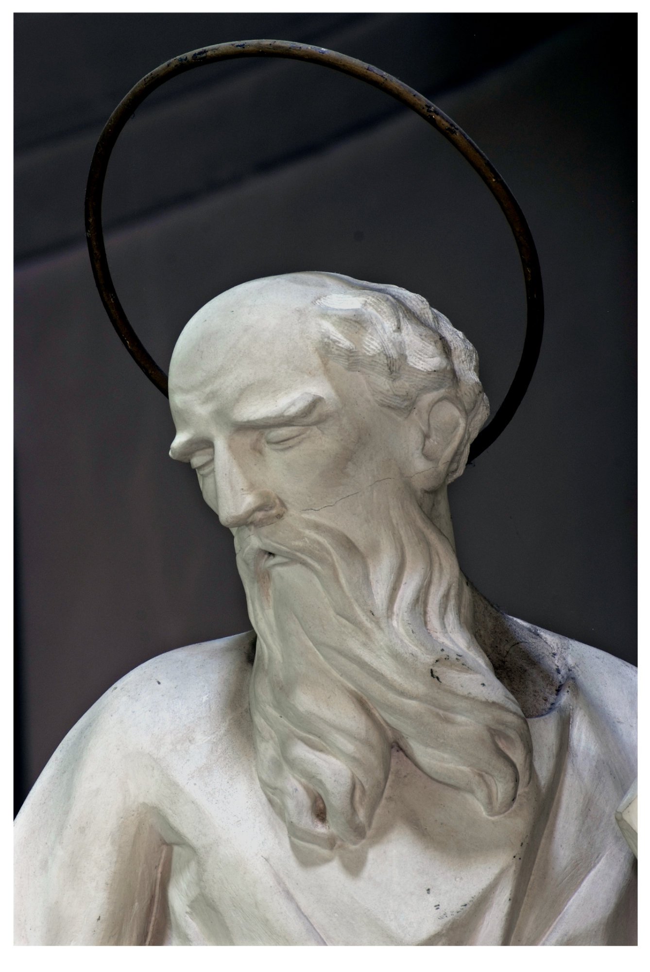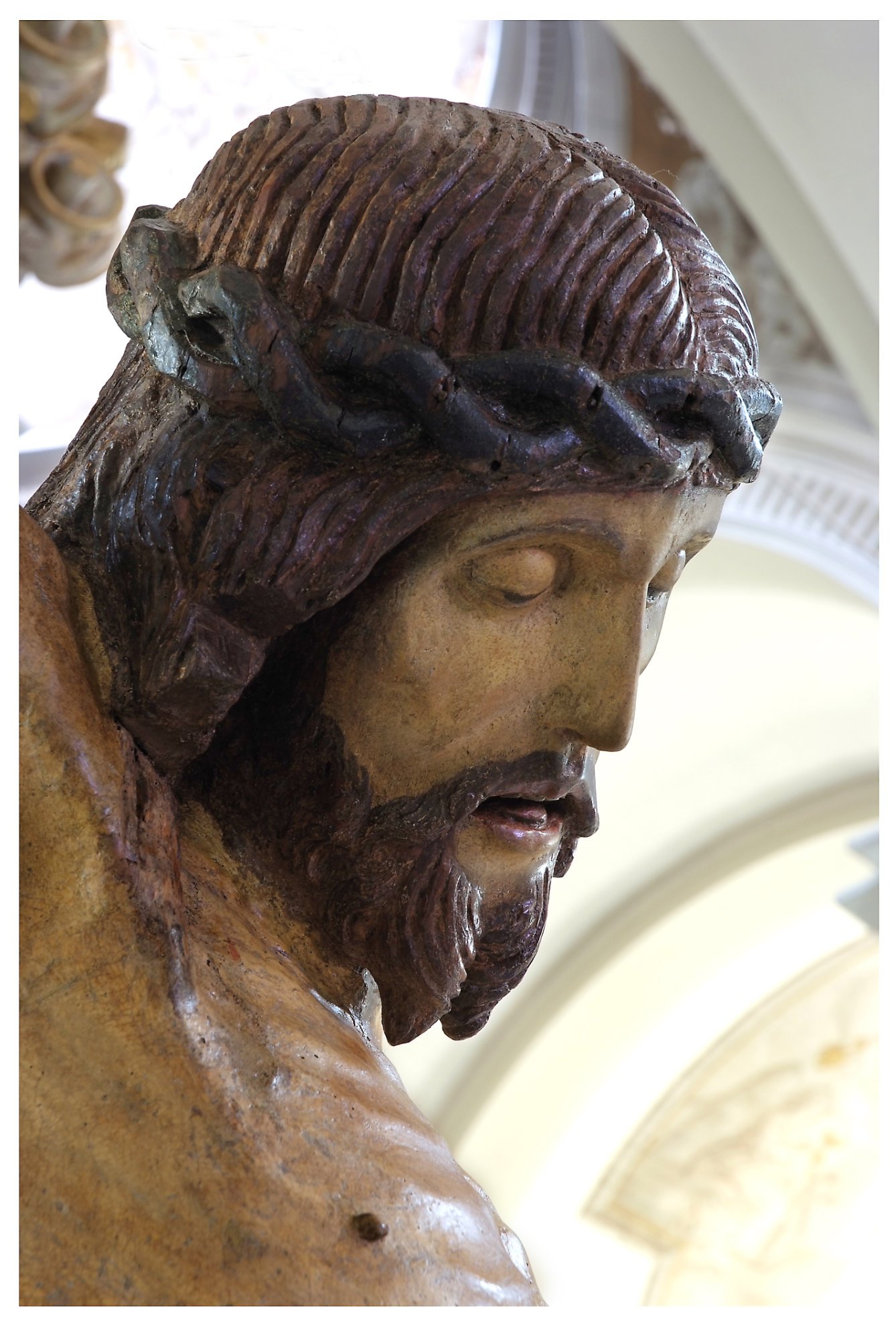 Adiacente alla gradinata del presbiterio è collocato il grande Crocifisso, quasi certamente l’antico Cristo del travo, che – spesso accompagnato dalle immagini della Madonna e di San Giovanni – si trovava nelle chiese sotto l’arco trionfale o arco santo che divideva la navata dal presbiterio. È una dignitosa scultura, che per alcuni versi (il trattamento dei capelli “a corda”, il perizoma a righe vivaci, la grande compostezza e serenità del volto) potrebbe rinviare al secolo XVI.