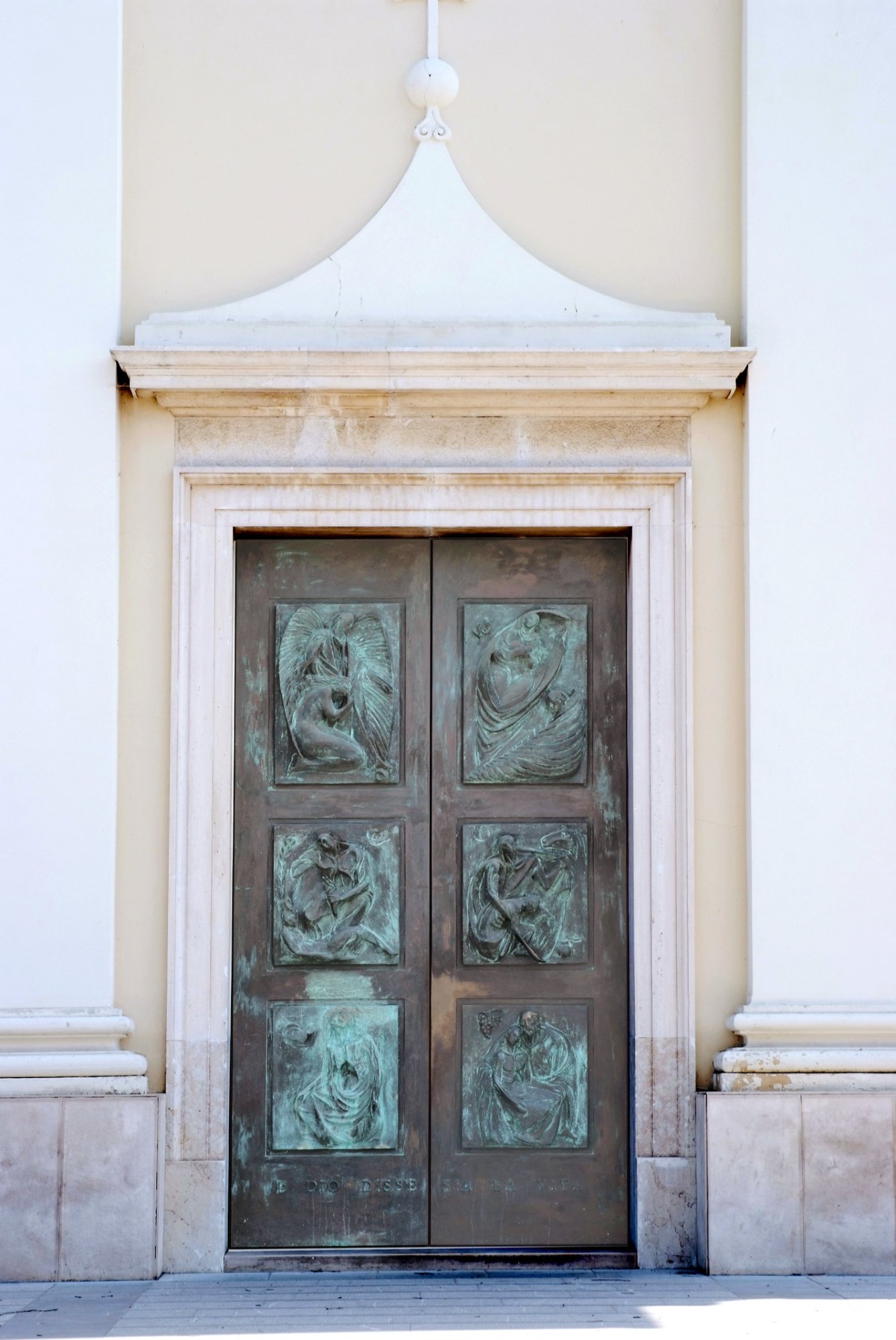 I due battenti della porta principale, chiamata Porta della Vita, sono divisi in tre formelle ciascuno. A sinistra, dall’alto in basso: Eva cacciata dal Paradiso (ma in certo modo accompagnata e protetta con tenerezza dall’angelo di Dio), Caino uccide Abele (la forza bruta che uccide la bontà, ma non può impedire che nasca un virgulto, che la vita continui), Giobbe abbandonato da tutti (dopo avere fatto esperienza di tutte le disgrazie e aver sperimentato la fragilità degli affetti umani, Giobbe sa che può continuare a discutere con un Dio che gli è accanto). Sul battente di destra la storia della Redenzione: Maria, nuova Eva, accoglie l’annuncio dell’angelo (l’angelo si pone quasi in venerazione della Vergine che riporta alla vita la storia dell’umanità), il Buon Samaritano (l’amore in Cristo diviene possibile ed è la rivelazione della verità dell’uomo), Lazzaro nel seno di Abramo (Dio che accoglie, ed è Padre e ha la tenerezza di una madre, ed il povero mendicante diventa un bambino sereno).