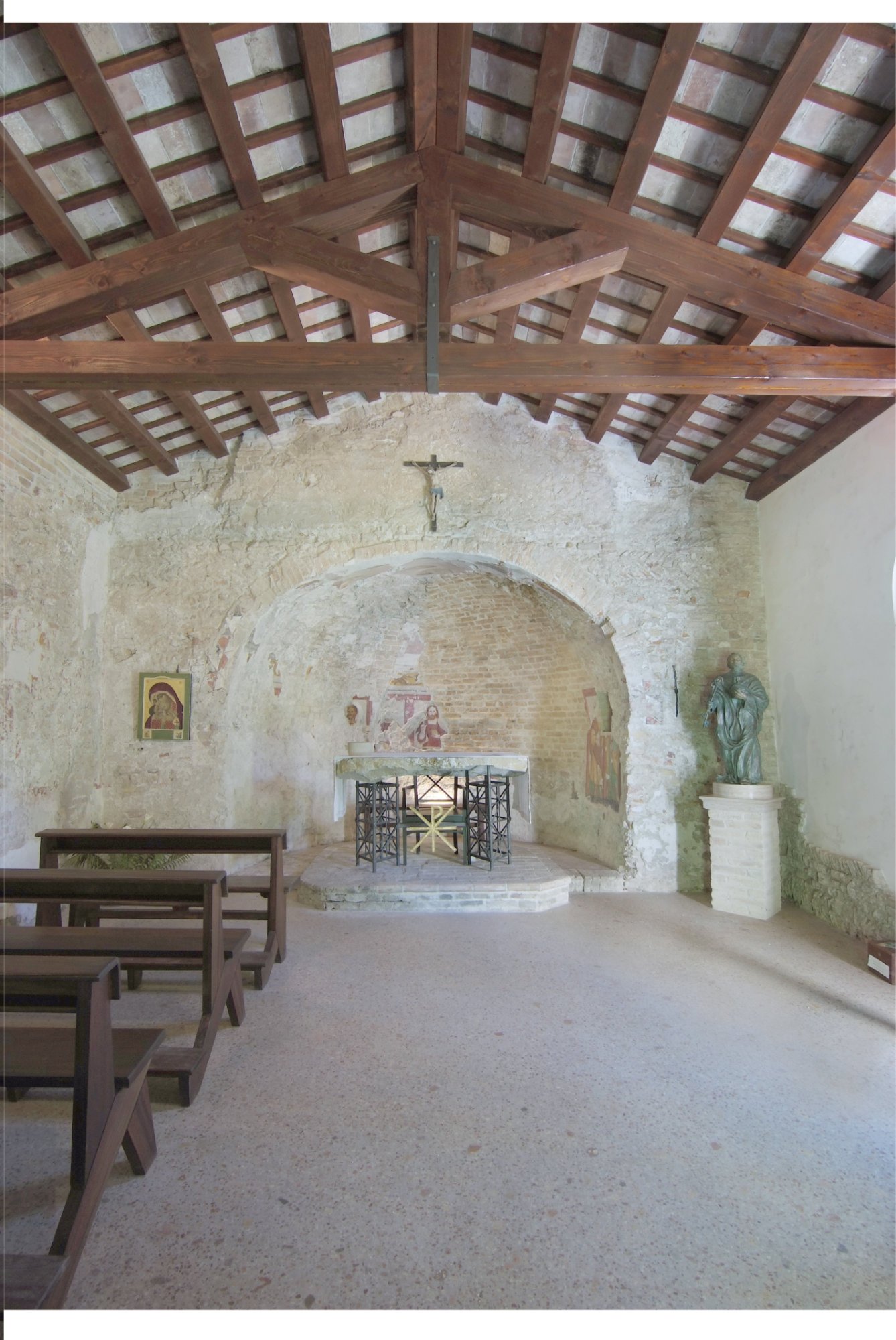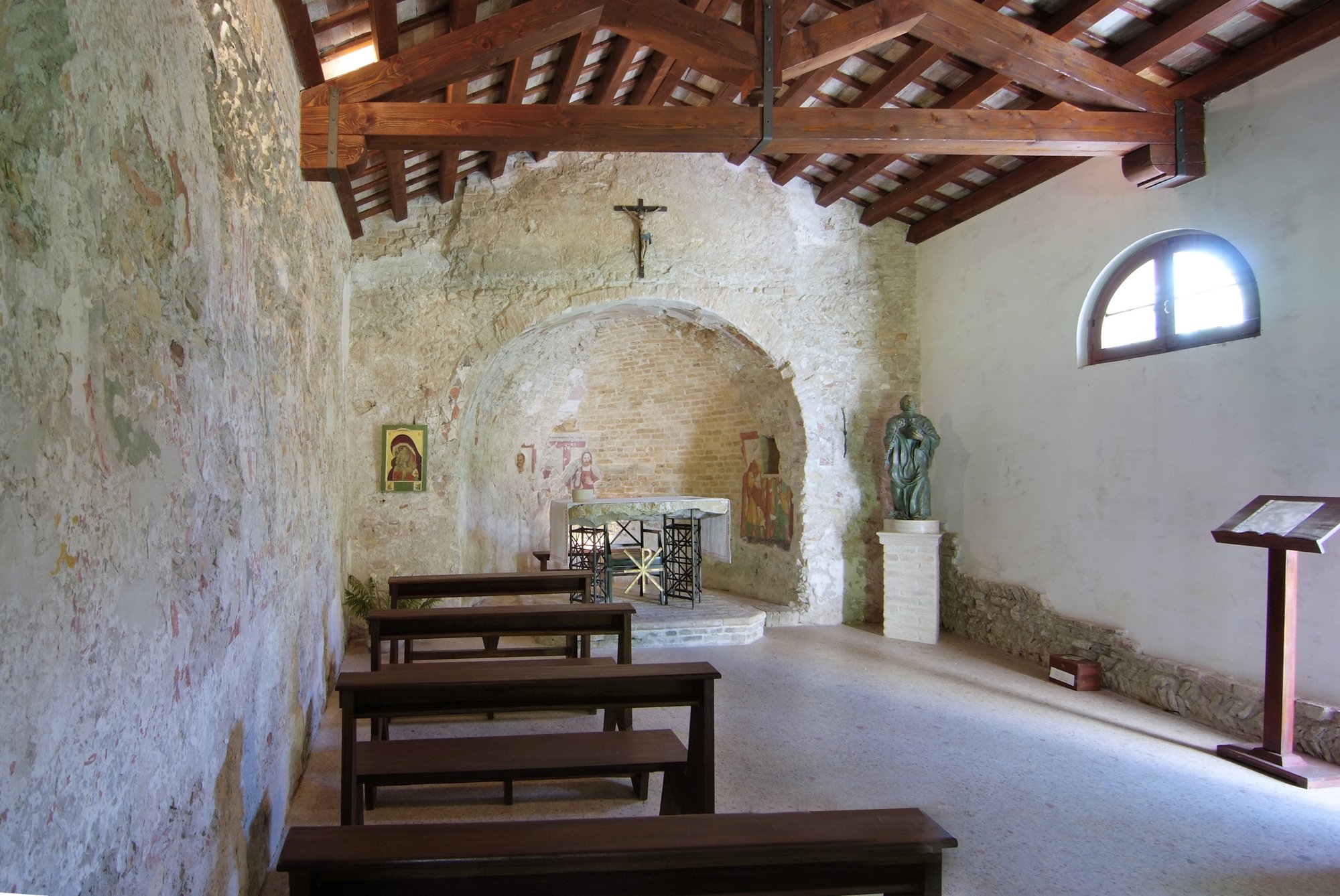 All’interno, sotto l’arco trionfale, un travo sosteneva il grande Crocifisso, oggi collocato in piano tra la navata principale ed il presbiterio.