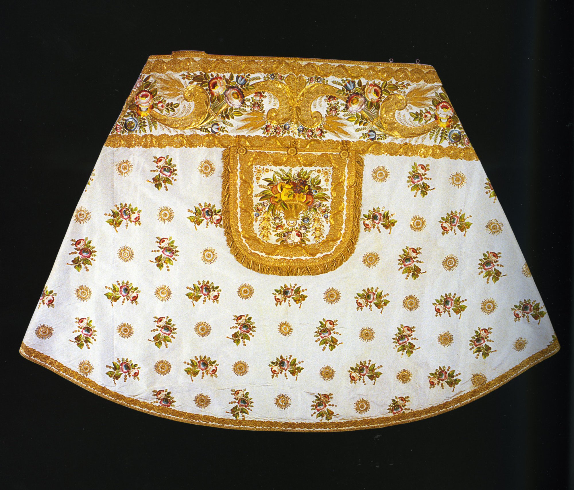 Uno dei personaggi, un vescovo preso di spalle, è rivestito dello splendido piviale del parato di proprietà della chiesa. Si tratta di un parato completo di pianeta, dalmata, tunicella, piviale e rispettivi accessori, risalente al periodo tra la fine del secolo XVIII e il XIX. Sulla sua provenienza molto è stato detto. La tradizione locale racconta che i paramenti siano giunti in zona al seguito di Napoleone e che siano finiti in proprietà degli eredi dei Flangini-Biglia, nella loro chiesa di Murlis, nella quale – in momenti bui – con essi si sarebbero celebrate anche parodie di messe, che portarono alla chiusura e poi al crollo della chiesa stessa. Altra leggenda narra che le ricamatrici sarebbero diventate cieche: tanti modi per dire la bellezza di questo capolavoro. Alla fine degli anni Settanta del secolo scorso si ebbe notizia da una studiosa di Lione della presenza nella città francese dei cartoni-progetto dell’opera di Bagnarola.