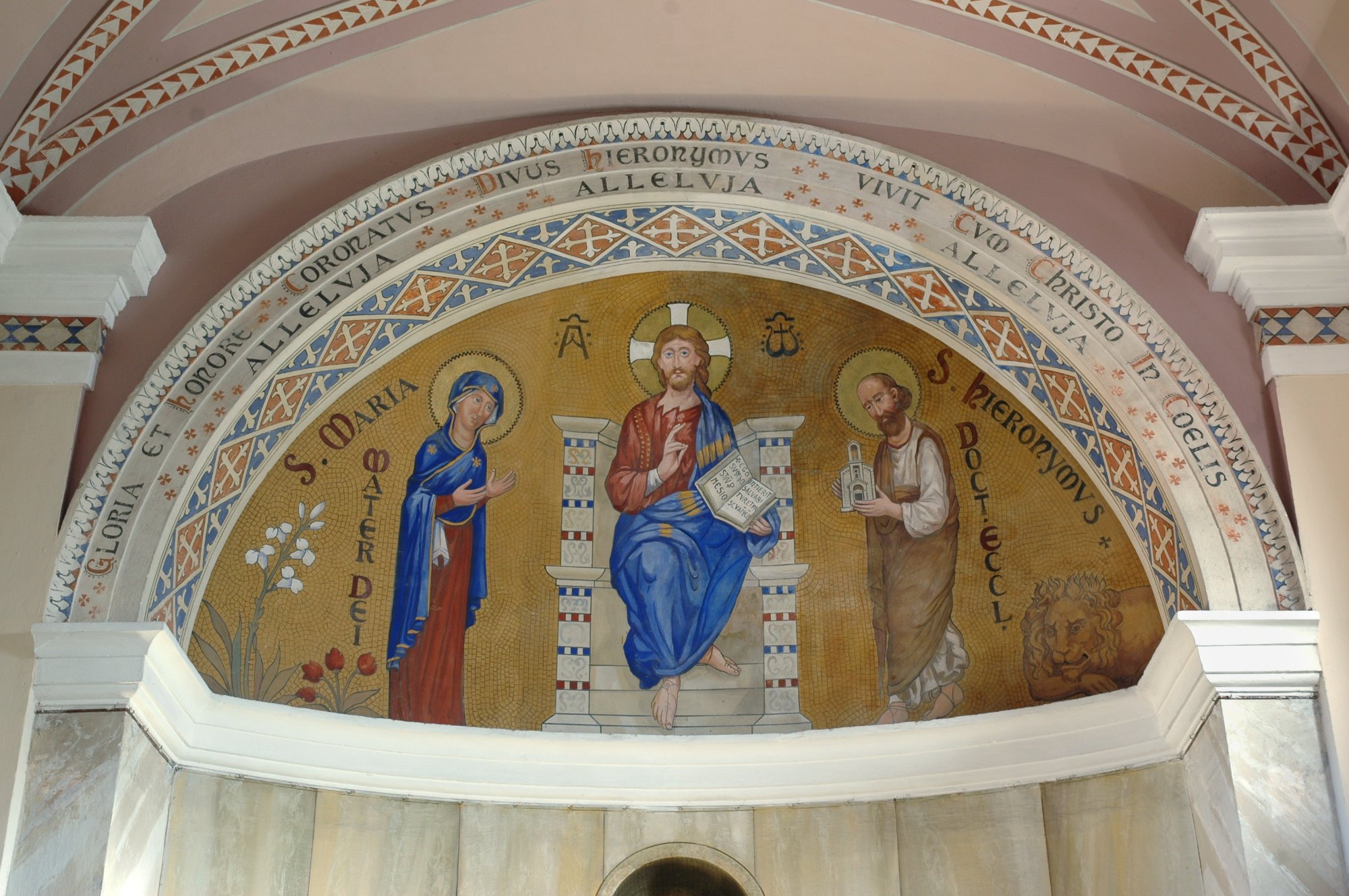 All’interno si trova la statua lignea di San Girolamo, attribuita la XV secolo, gli Evangelisti del pittore Giovanni Di Lorenzo (1924), l’affresco absidale di Luciano Michelutti, raffigurante il Redentore con la Madonna e san Girolamo (1923), il Cenotafio in ricordo dell’abate Biavi.
