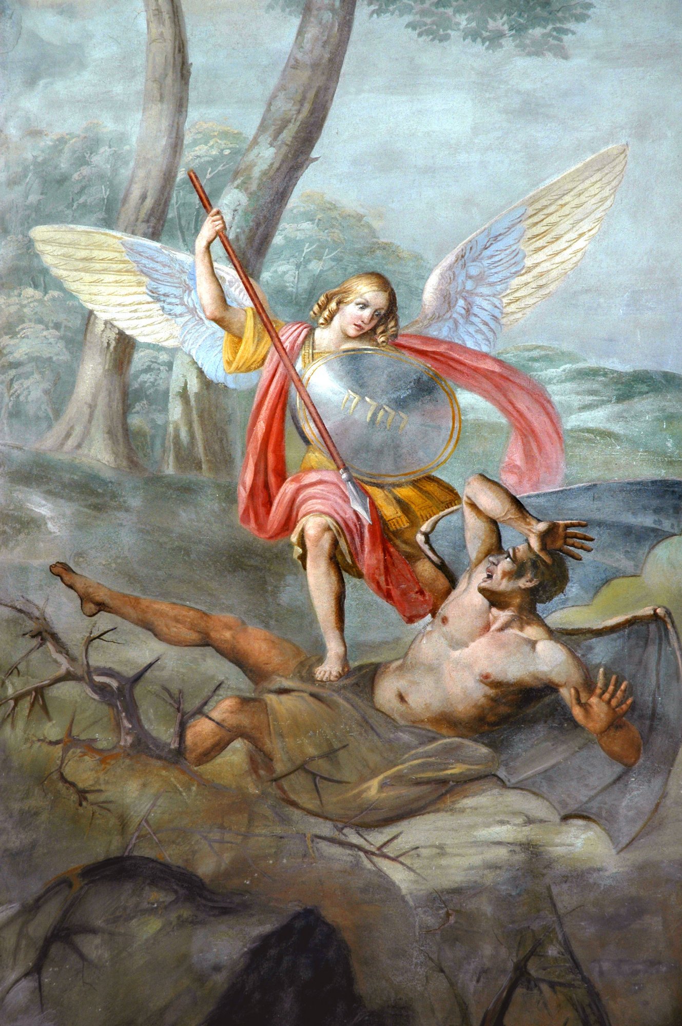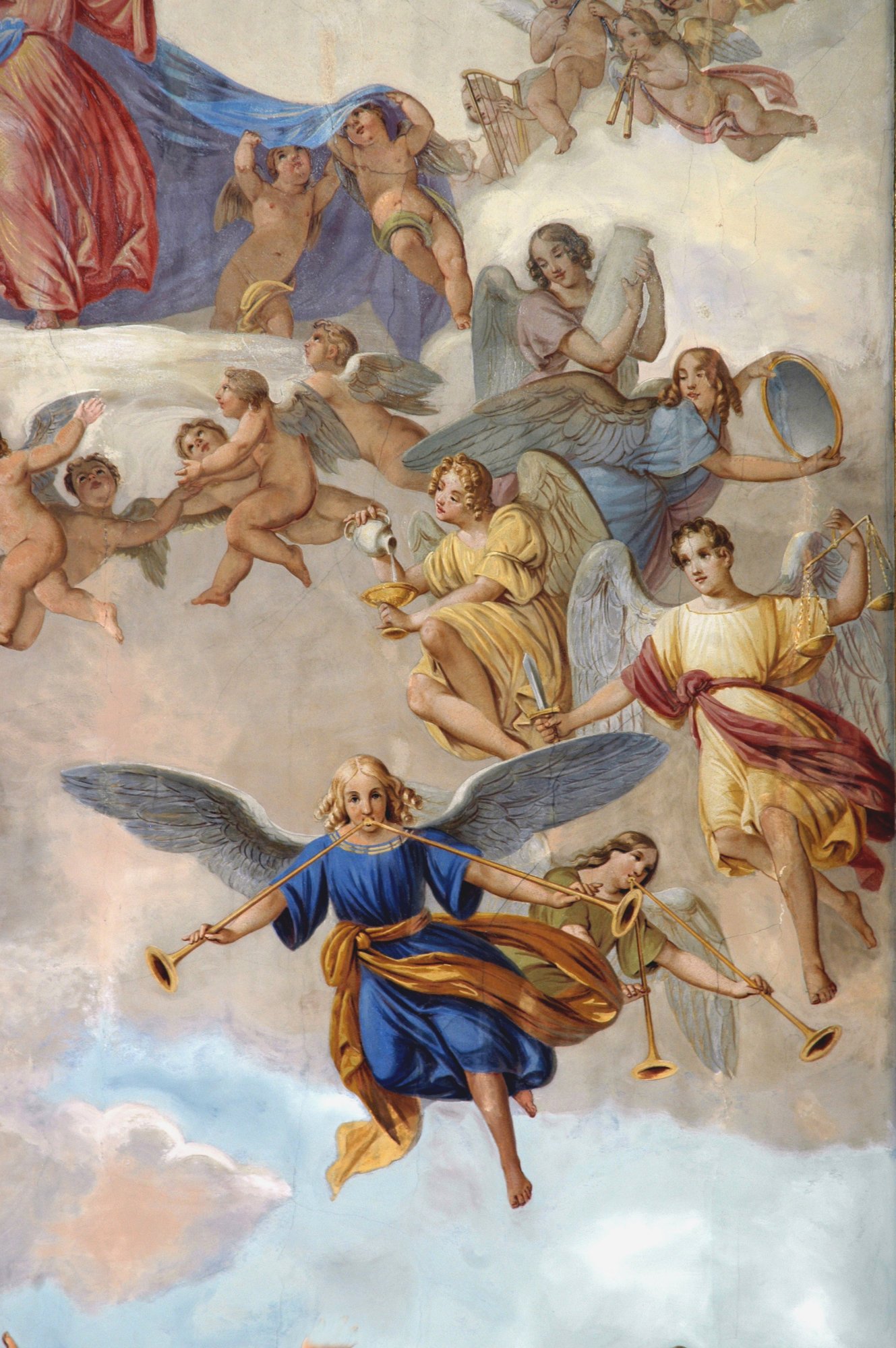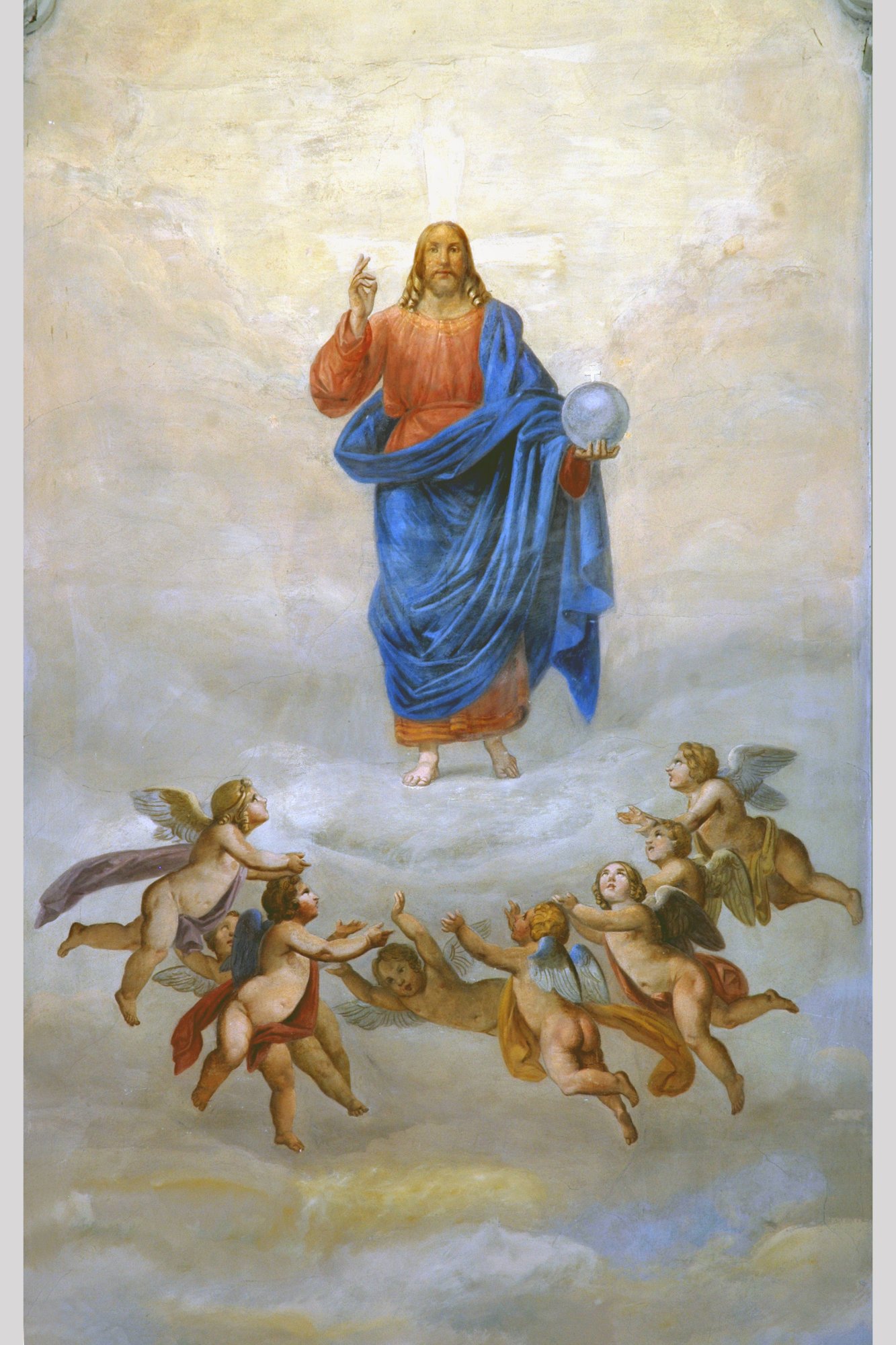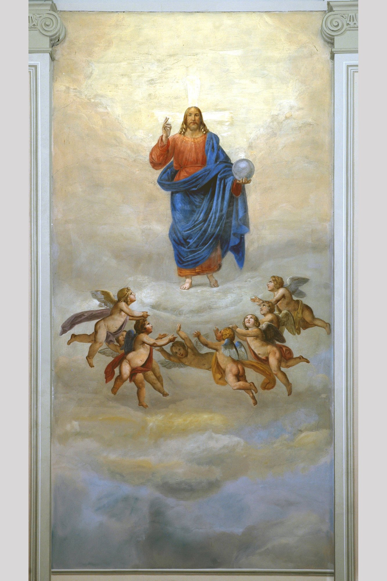 In alto, tra monocrome evanescenti figure di santi seminascosti dalle nuvole, appare la Trinità – pure essa in monocromo – sull’arco superiore del globo terrestre e, ormai sotto la cornice, grandi colorati angeli in volo, che recano in mano canestri di fiori, gigli, rami d’ulivo.