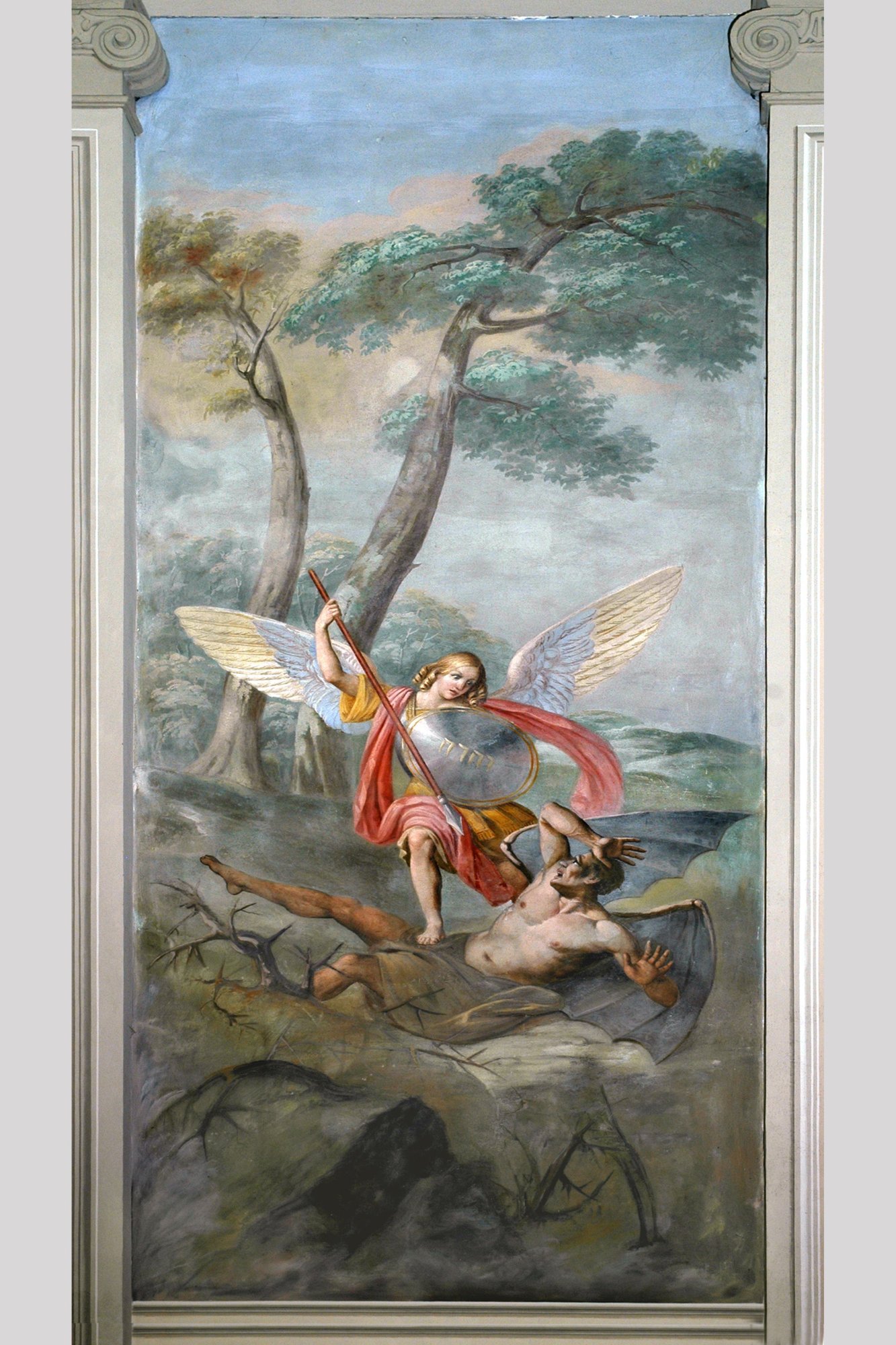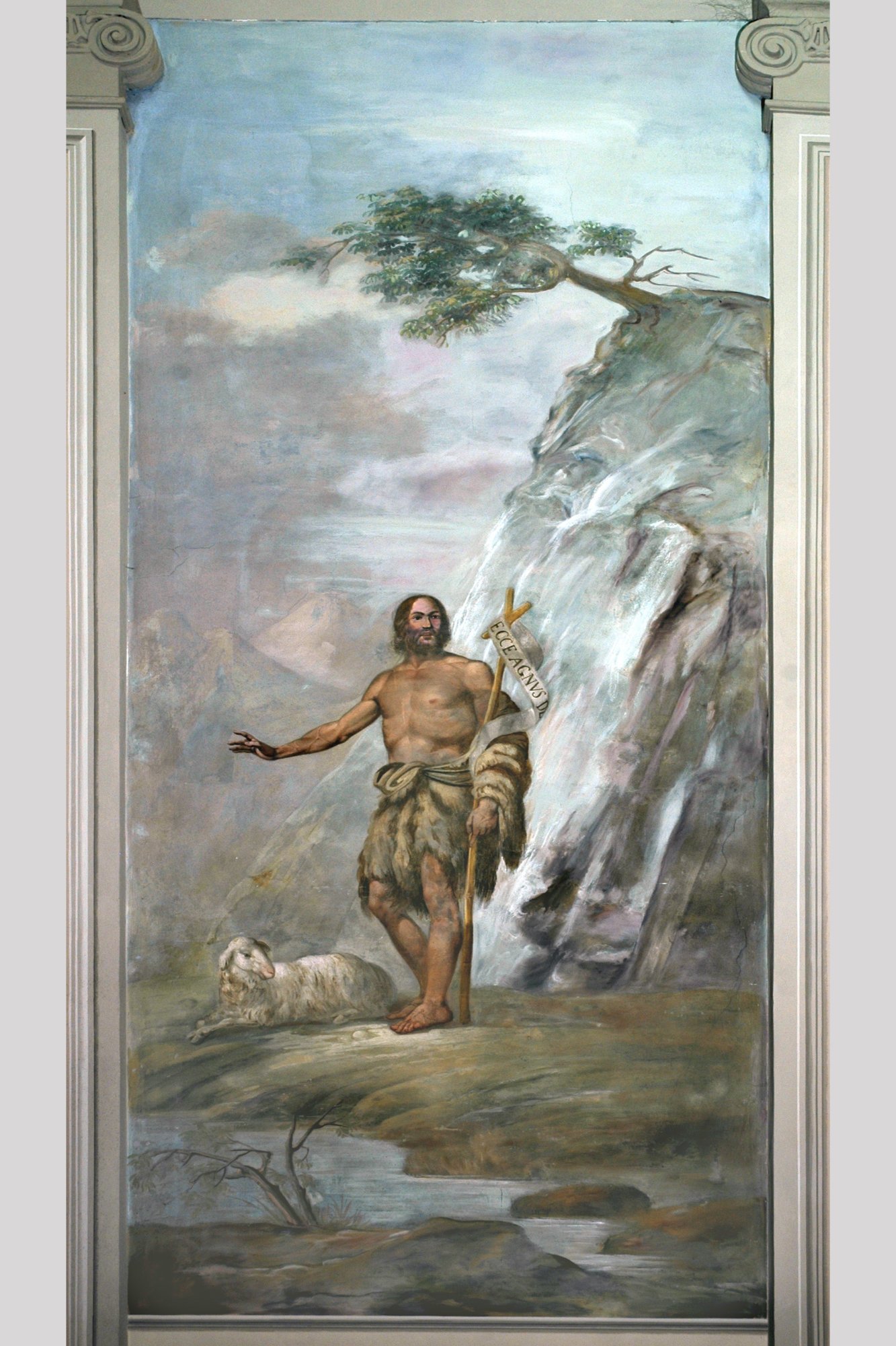 Un senso di vuoto si avverte nel riquadro centrale del presbiterio, occupato da uno statico Redentore benedicente e con il globo in mano, in piedi su nubi popolate di angioletti. Più dinamici appaiono i santi nelle specchiature laterali, l’allungatissimo San Giovanni Battista, sotto i cui piedi scorrono le acque del Giordano ed alle cui spalle si erge la montagna, e – tra alberi, cespugli, erbe e colline – San Michele Arcangelo, in parte nuovo nell’iconografia, in quanto raffigurato giovanissimo e con lunghi boccoli mentre, impugnando lancia e scudo a specchio, si avventa su Satana che, disteso a terra tra spini, ostenta una smorfia di dolore nel volto.