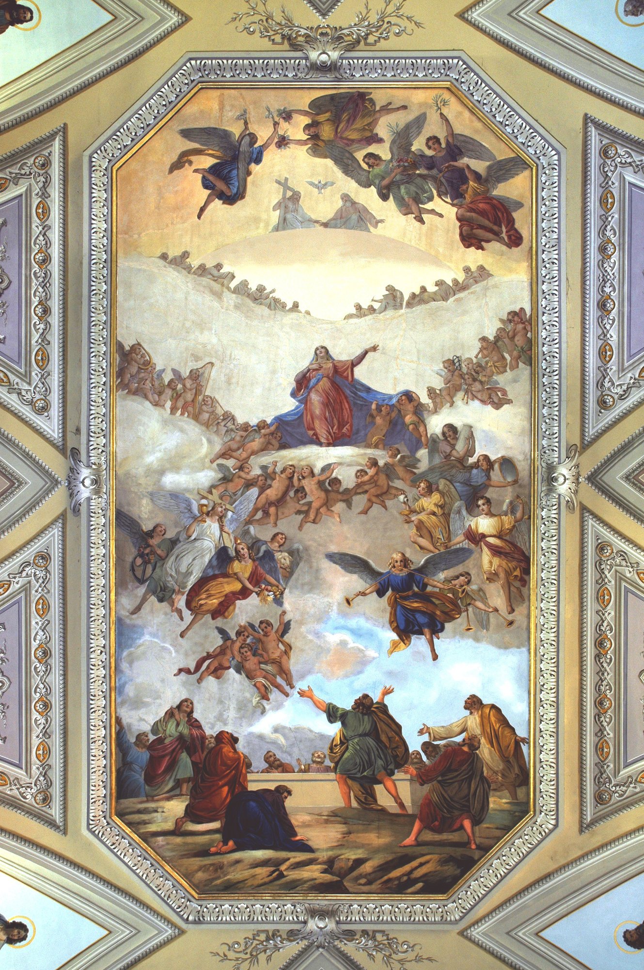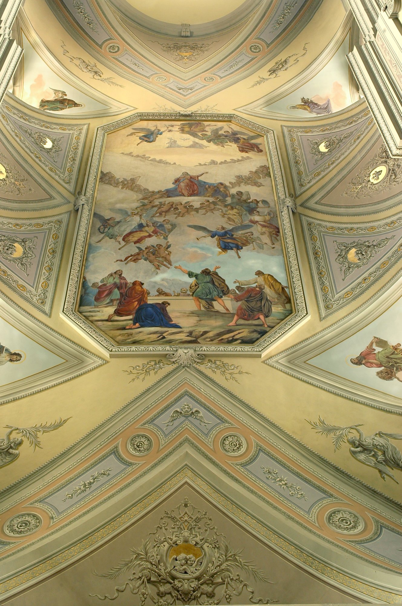 Nel soffitto della navata, entro un apparato decorativo geometrizzante che si raccorda alle pareti attraverso fregi e riquadri di color giallo-bruno entro i quali campeggiano tondi dorati contenenti figure di angioletti o simbolici cuori, Santi dipinse nel 1838 una grande Assunzione della Vergine, e sopra le finestre i quattro Evangelisti.