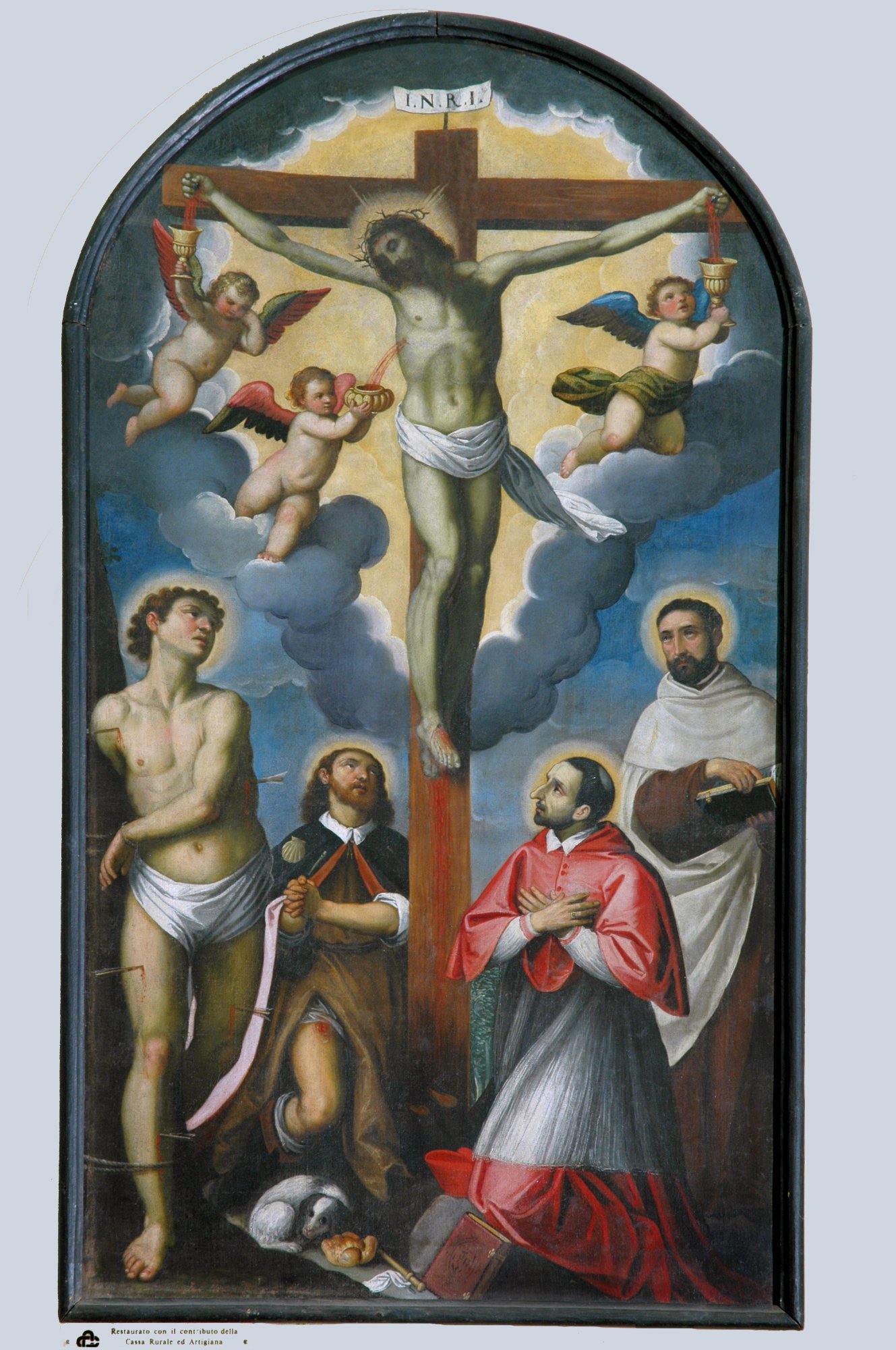 Il primo raffigura Cristo crocifisso con i santi Sebastiano, Rocco, Carlo Borromeo e Giovanni della Croce. È un’opera impaginata con uno schema estremamente ordinato, forse fin troppo rigido (le teste dei quattro santi si situano al limite dell’ideale cerchio entro il quale campeggia la figura del Cristo), mostra popolaresca esuberanza cromatica ed iconografica. Può essere datato fra il 1730 e il 1740 ed attribuito a Pietro Bainville, pittore francese di gusto provinciale, vissuto tra il 1674 circa e il 1749, abitante a Palmanova, dove giunse poco più che ventenne.