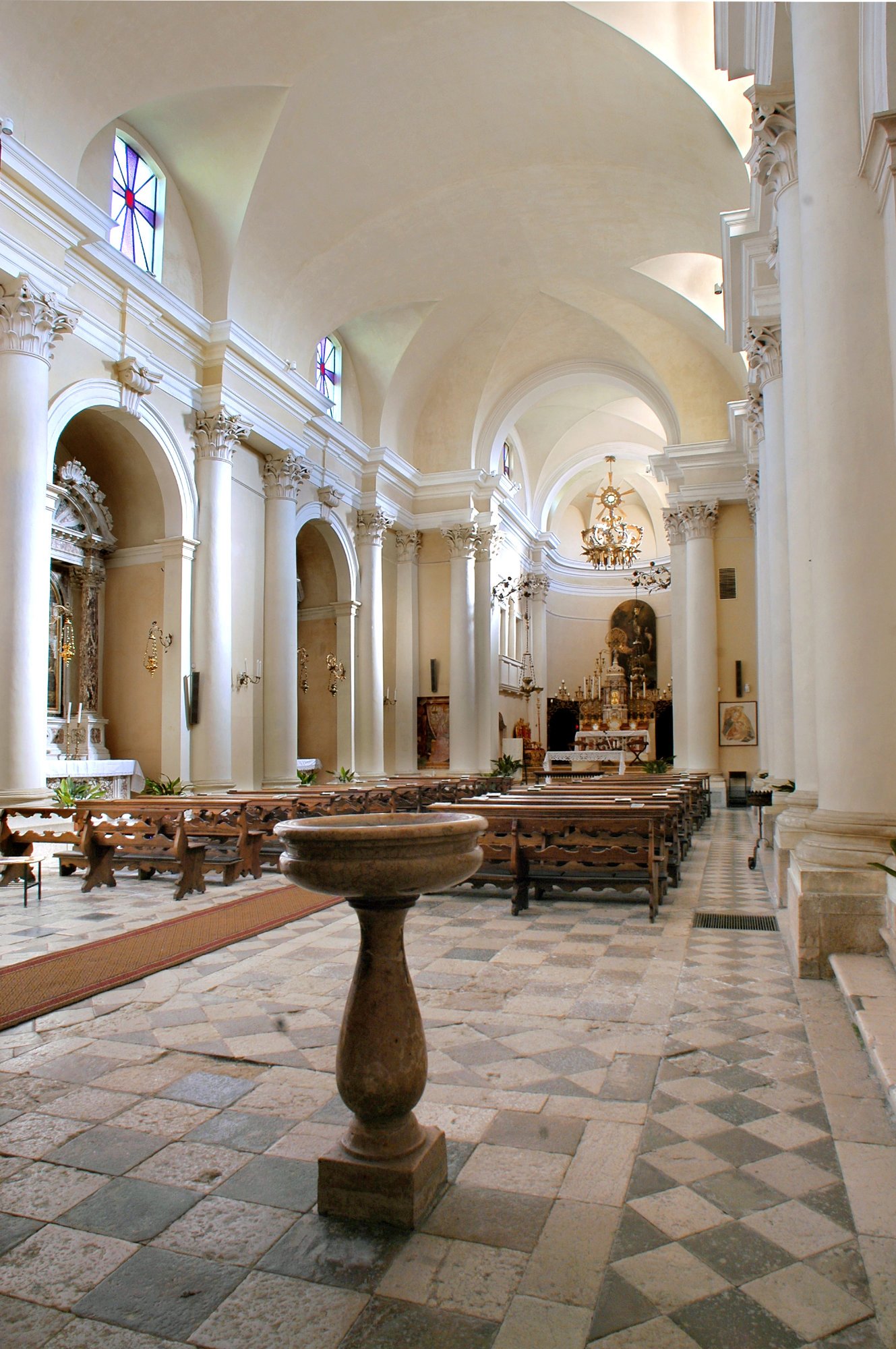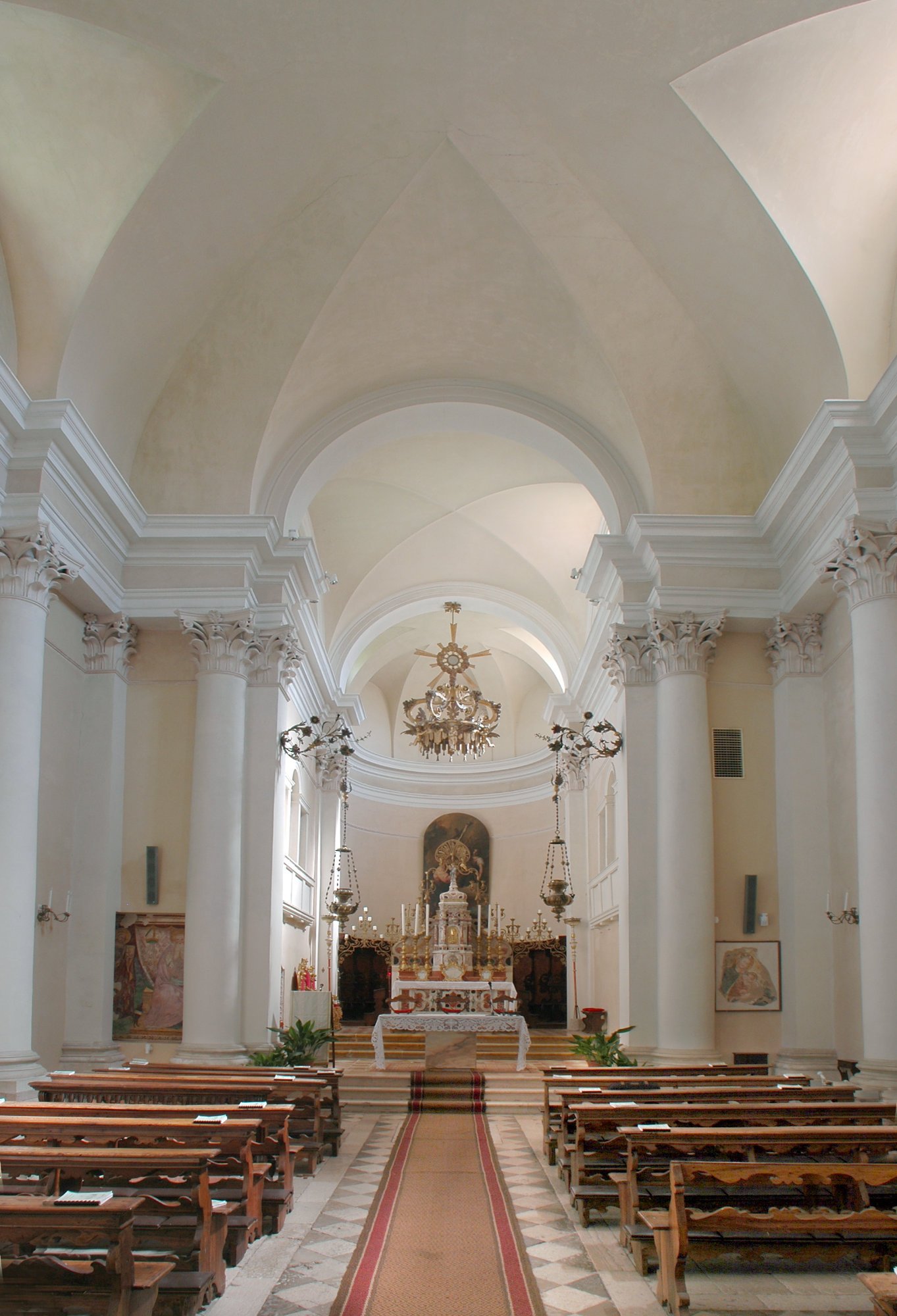 L’interno è costituito da un’unica navata slanciata, caratterizzata da nicchie laterali affiancate da semicolonne e da un presbiterio sopraelevato: armonioso complesso di orientamento ormai neoclassico, realizzato intorno alla metà del Settecento.