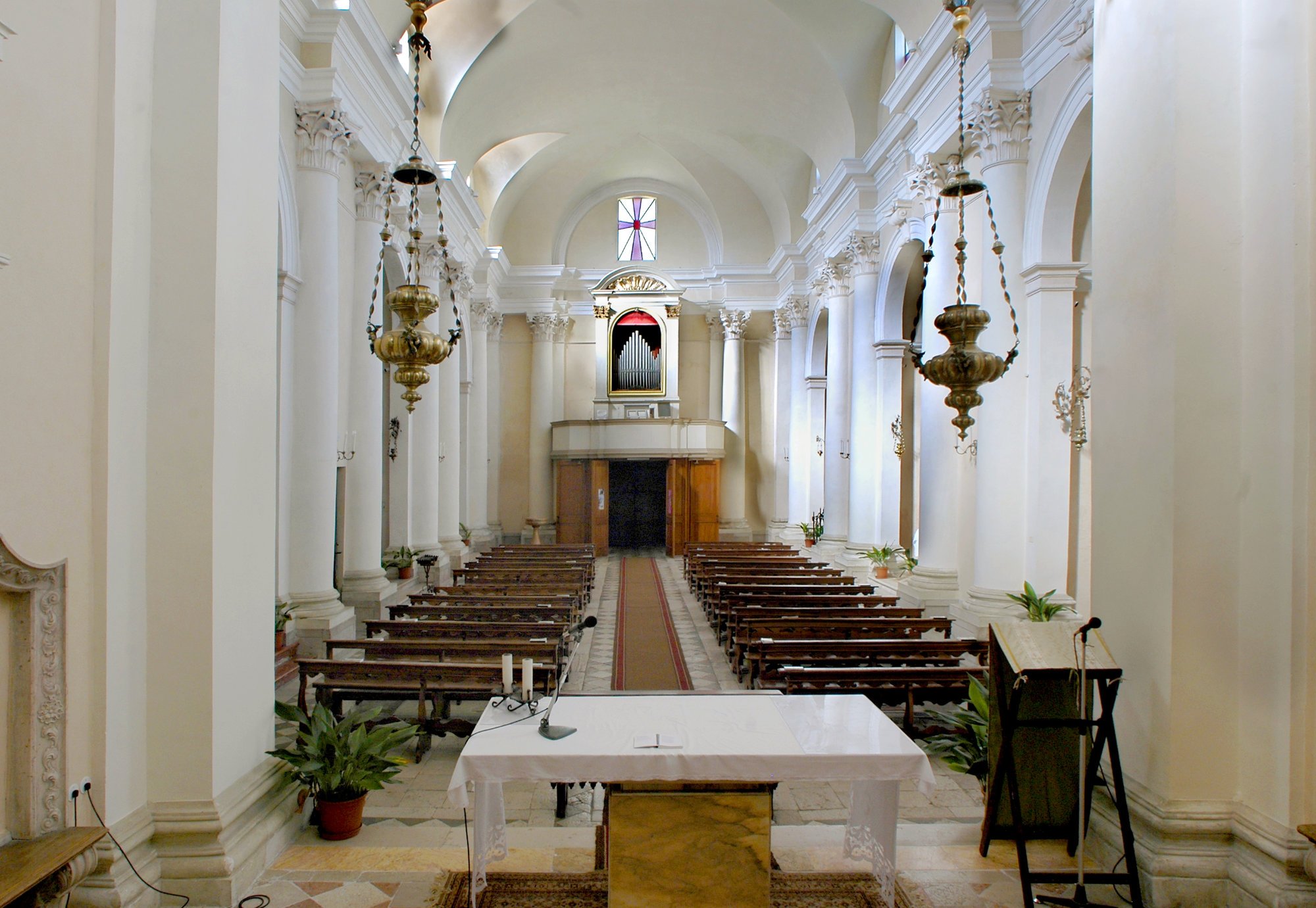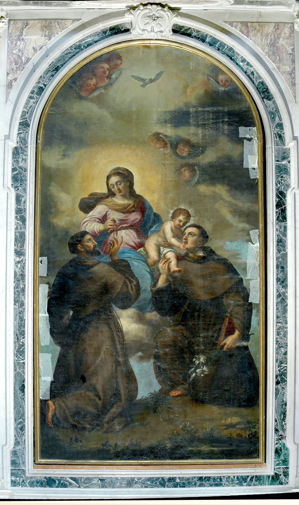 Sul lato opposto, in un’altra nicchia, al di sopra del confessionale, si trova una pala con Cristo in gloria, la Madonna e santi, proveniente dalla chiesa di Ognissanti dove fungeva da pala dell’altare maggiore.
